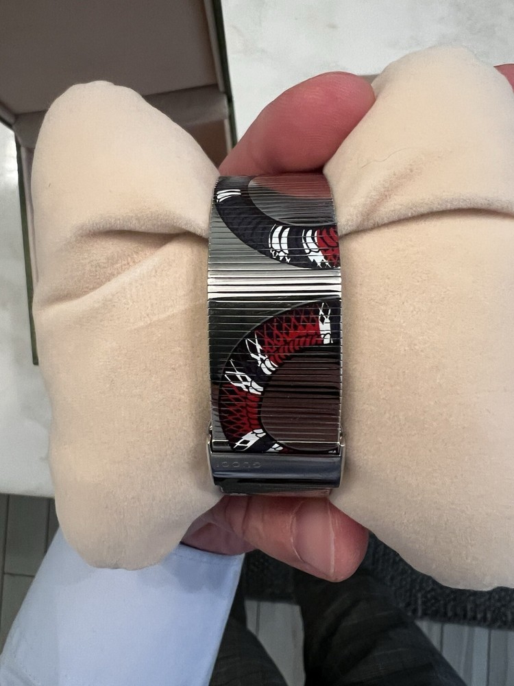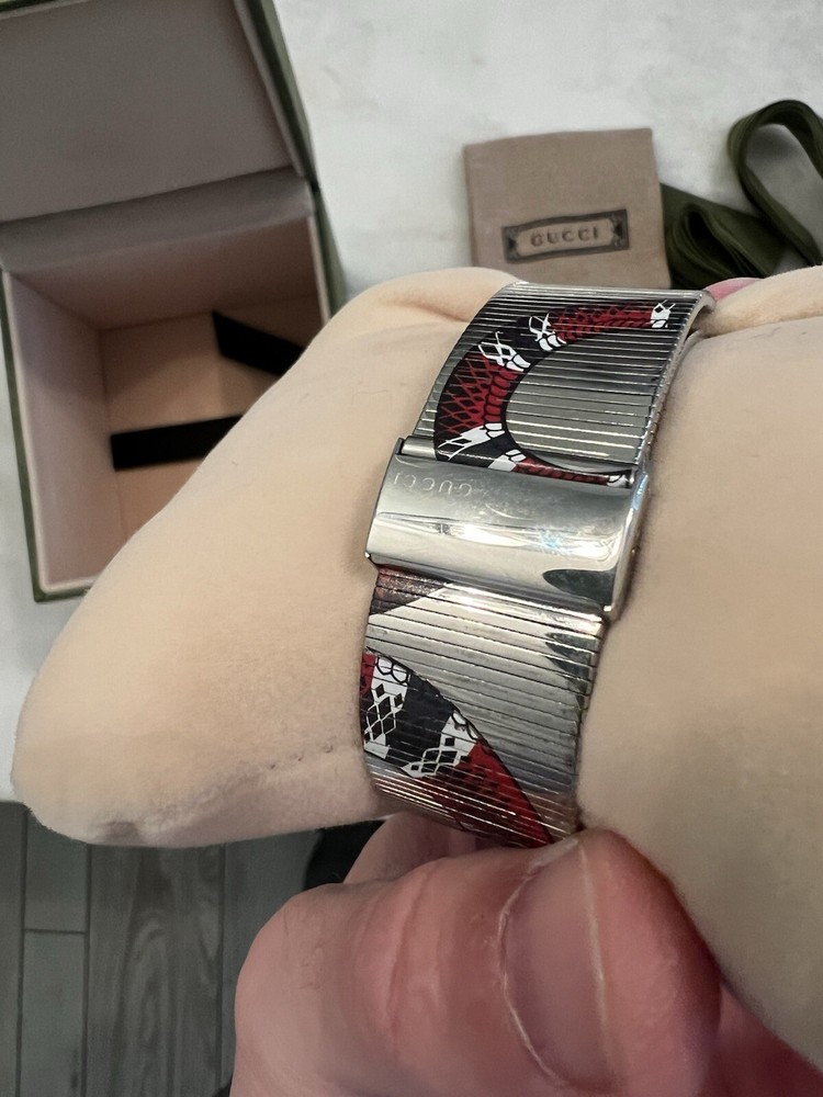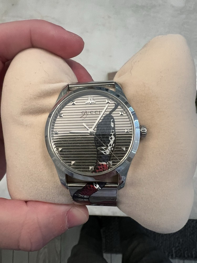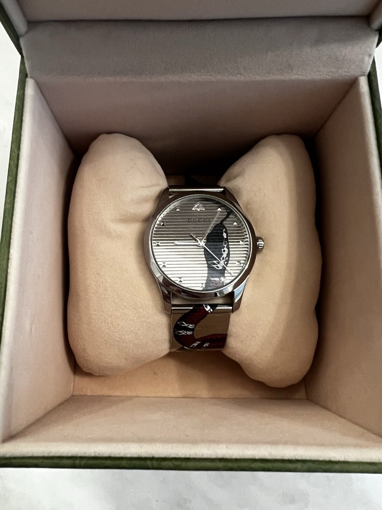 Elevate your style with this luxurious Gucci Men's Snake Motif Watch. The quartz movement and analog display ensure accurate timekeeping, while the stainless steel case and band provide durability and a sleek silver finish. The watch features a unique snake motif on the dial, adding a touch of sophistication to any outfit. Comes with original papers, manual/booklet, and box/packaging. This round wristwatch has a case size of 38mm and is perfect for any man who wants to make a statement. Add this Gucci Snake Motif Watch to your collection today.
