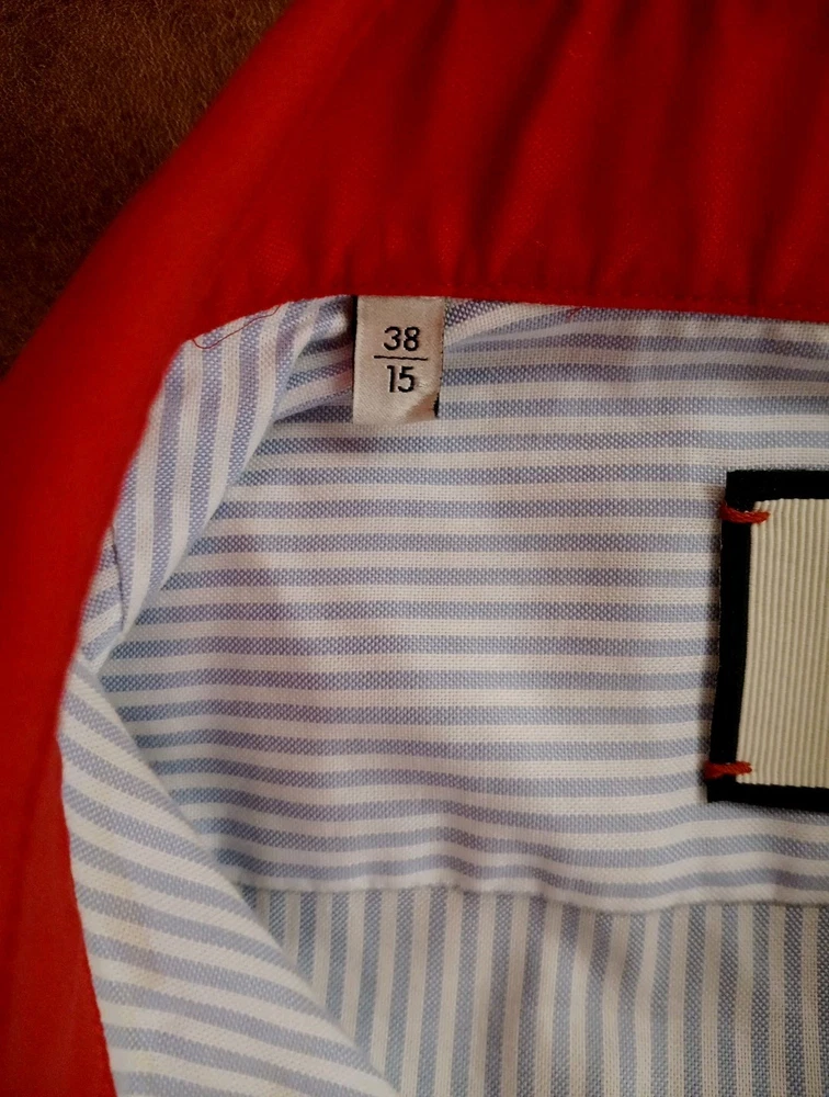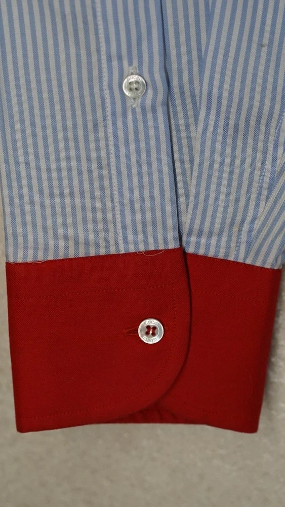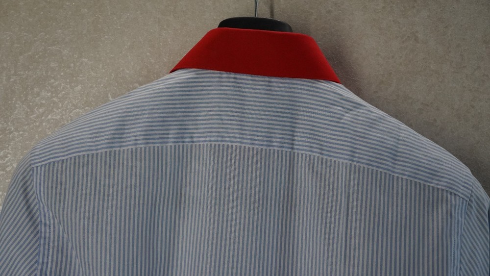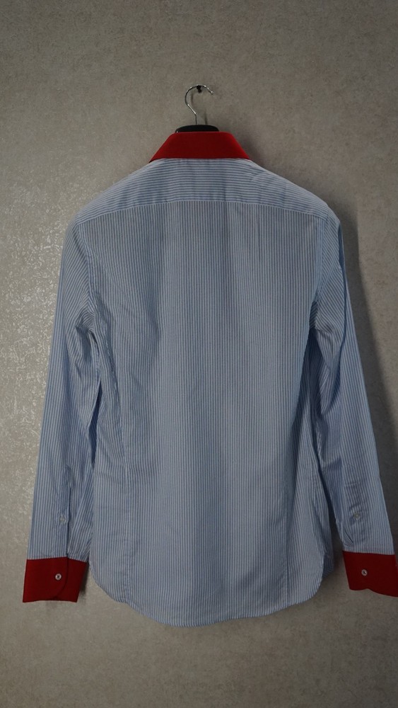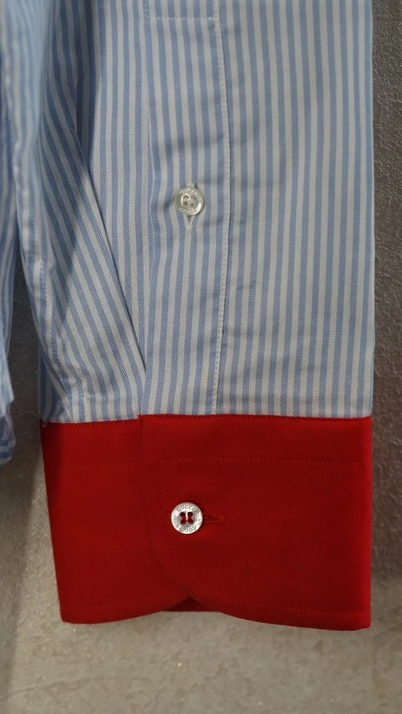 Gucci Striped Dress Shirt Blue with Red Collar & Cuffs Size 38 / 15 Item Specifics : Brand: Gucci Size: 38 / 15 (EU 38 / US-UK 15) Fit: Small / Slim Medium (see measurements) Color: Blue Pinstripe with Red Contrast Collar & Cuffs Style: Long Sleeve Button-Up Dress Shirt Condition: Pre-owned, excellent condition Made in Italy Description : Authentic Gucci striped dress shirt in blue with bold red collar and cuffs. A rare and striking piece that combines classic Italian tailoring with standout details. Perfect for collectors or anyone looking to add a unique luxury shirt to their wardrobe. Known for Gucci’s high-quality craftsmanship. Key Features : Classic blue pinstripe design Bold red point collar and French cuffs Button-front closure Luxury Italian tailoring Size 38 / 15 (fits like Small-Slim Medium) Measurements (approx): Chest: 96–98 cm / 37.5–38.5 in Shoulders: 42–44 cm / 16.5–17.3 in Sleeve Length: 63–65 cm / 24.8–25.6 in Back Length: 74–76 cm / 29–30 in Neck: 38 cm / 15 in Shipping : Global shipping available. Item ships within 2 business days via tracked service. Average delivery 4–8 days worldwide.