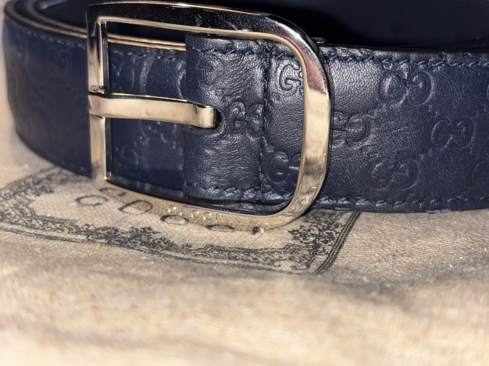 The Gucci Microguccissima Soft Leather Belt in Navy Blue, Size 105 (40), is a luxurious and stylish accessory for men. Made from high-quality leather with a solid navy blue color and a sleek buckle accent, this designer belt exudes sophistication and class. Crafted in Italy, this authentic Gucci belt is perfect for adding a touch of elegance to any outfit, making it a must-have for the fashion-conscious man looking to elevate his style.