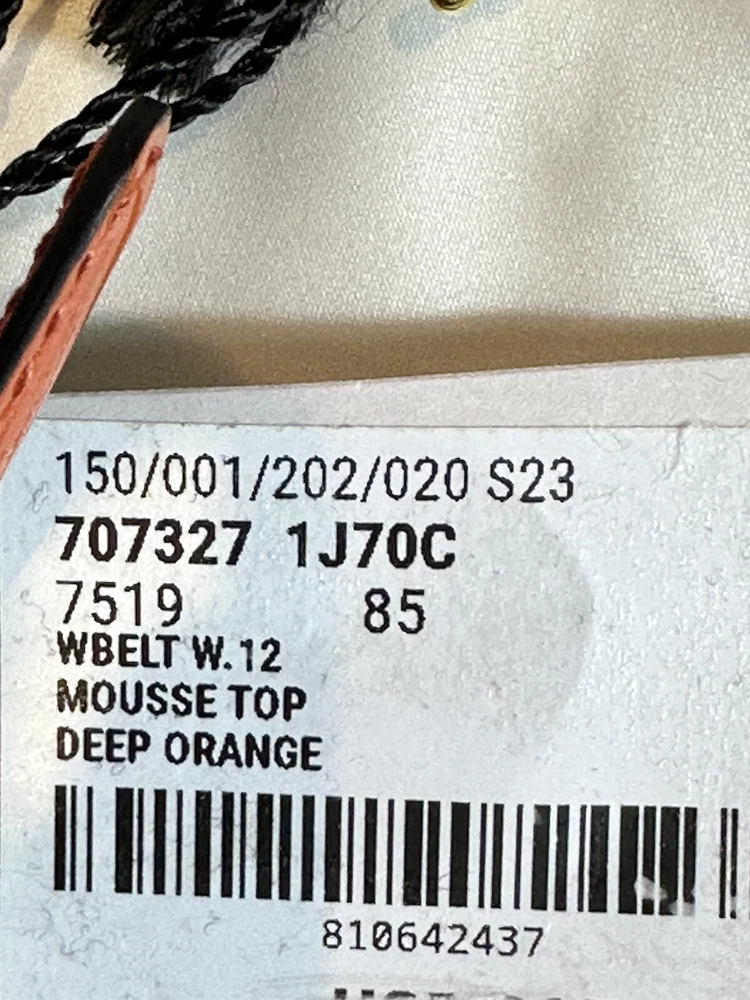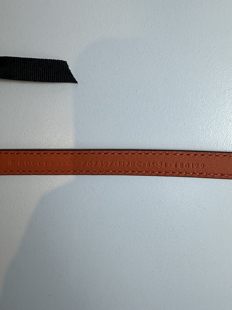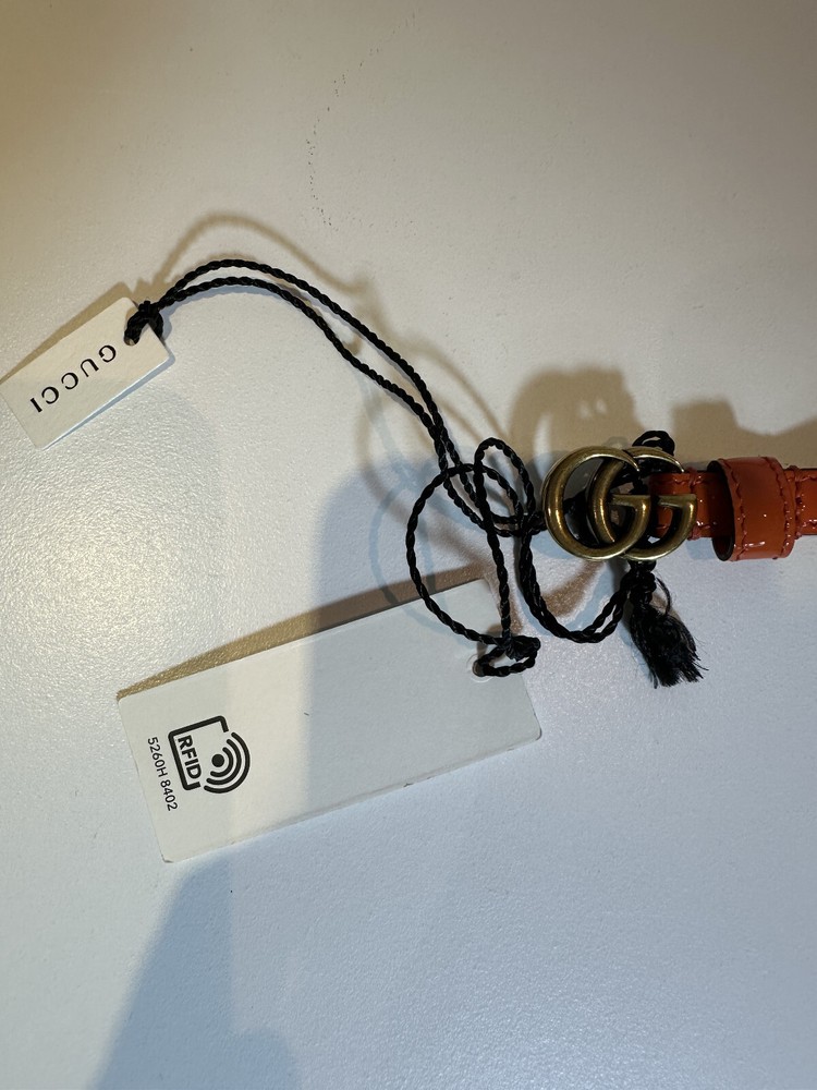 New with tags authentic Gucci thin belt crafted from glossy orange patent leather. GG Marmont double-G buckle in antique gold tone. Comes brand new with original tag and dust bag. Color: Orange (patent leather finish) Buckle: GG Marmont antique gold hardware Width: Approximately 0.5" Size: 85/34 Includes original Gucci dust bag and product tag Made in Italy 💯 Guaranteed Authentic.