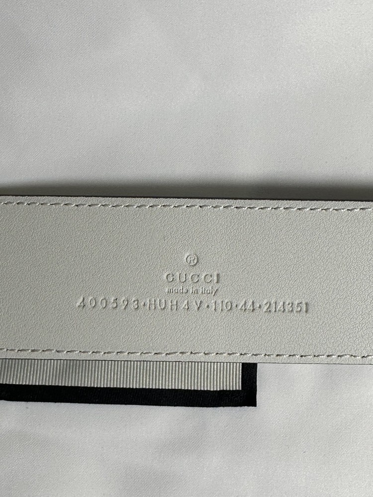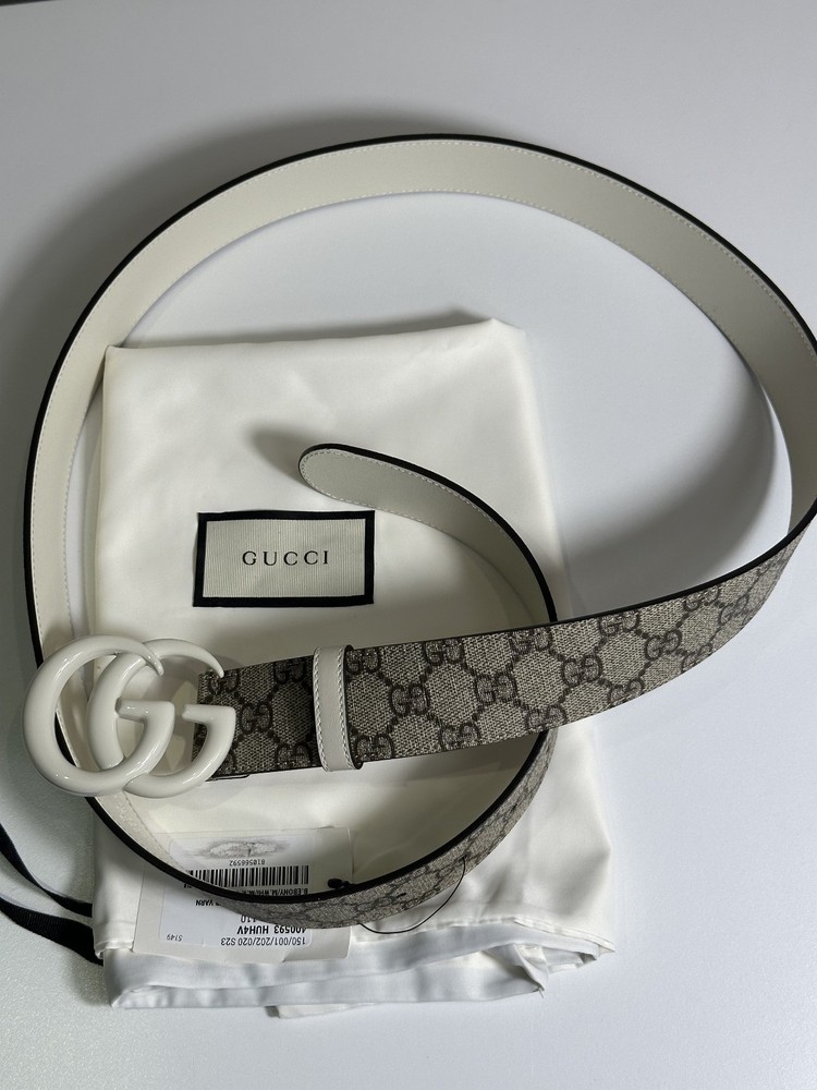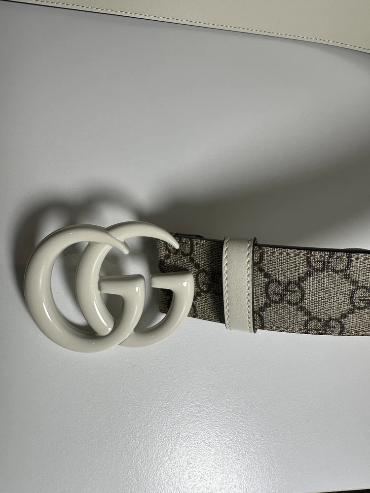 Gucci GG Supreme White Buckle Belt Size: 110 cm / 44 inch Color: Beige/ebony GG canvas with white leather trim and interior Buckle: White Marmont Double G Material: GG Supreme coated canvas and leather Made in Italy Condition: New with tags Includes: Gucci dustbag