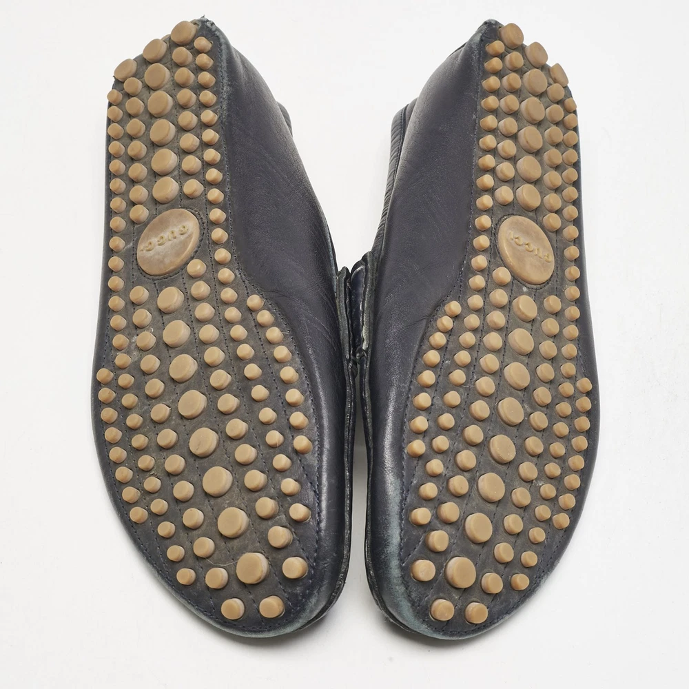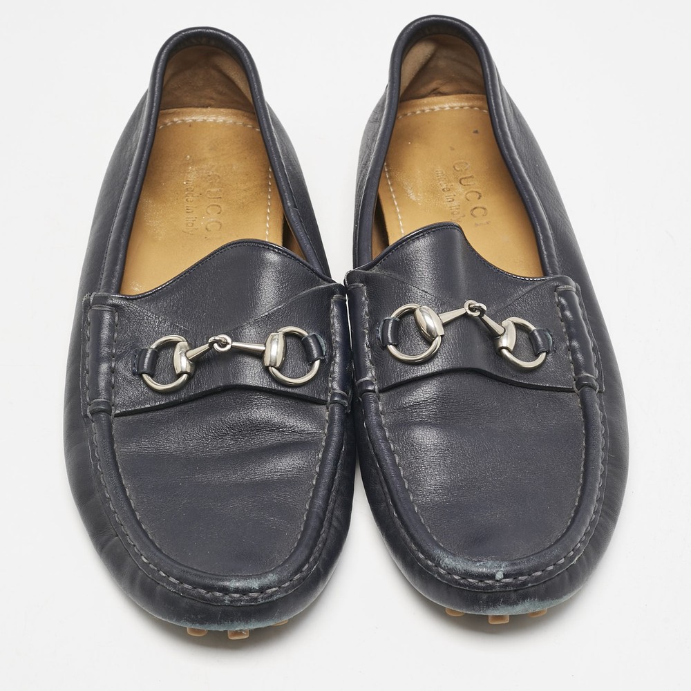 Exhibiting an iconic style and design, the Horsebit loafers from Gucci fetch the signature aesthetic of the brand effortlessly. They are designed using blue leather on the exterior with the emblematic Web strap and a gold toned Horsebit motif embellishing the vamps. Lend total class to your attire by wearing these loafers.Certified by The Luxury Closet - This item has gone through a detailed authentication process overseen by our experts. We offer a lifetime guarantee of authenticity on all our items. Import duties, taxes and charges are not included in the item price. These charges are the buyers responsibility. Please check with your country’s customs office to determine what these additional cost will be prior to buying. Our eBay Store About Us Contact Us Add to Favorite Sellers Gucci Navy Blue Leather Web Horsebit Loafers Size 42.5 $200.2 Exhibiting an iconic style and design, the Horsebit loafers from Gucci fetch the signature aesthetic of the brand effortlessly. They are designed using blue leather on the exterior with the emblematic Web strap and a gold toned Horsebit motif embellishing the vamps. Lend total class to your attire by wearing these loafers. Product Details Brand Color Navy Blue Dimensions Material Leather Size 42.5 Outsole Width Outsole Length Heel Height Includes Certified by The Luxury Closet This item has gone through a detailed authentication process overseen by our experts. We offer a lifetime guarantee of authenticity on all our items. How We Check The in-house team of experts at The Luxury Closet is highly trained to verify the authenticity and the condition of the luxury products. They ensure that only 100% authentic items are put on sale.The evaluation process is unique with its own mix of assessment criteria and differs according to the category. Each item is evaluated based on the following combination of hallmarks, hardware, stitching, symmetry, material, craftsmanship, stamping, codes, hologram stickers, and packaging. Our authenticators also check if the items have been modified or amended (e.g., aftermarket diamonds, replaced batteries, repaired bags, etc.) International Buyers Import duties, taxes and charges are not included in the item price. These charges are the buyers responsibility. Please check with your country’s customs office to determine what these additional cost will be prior to buying.