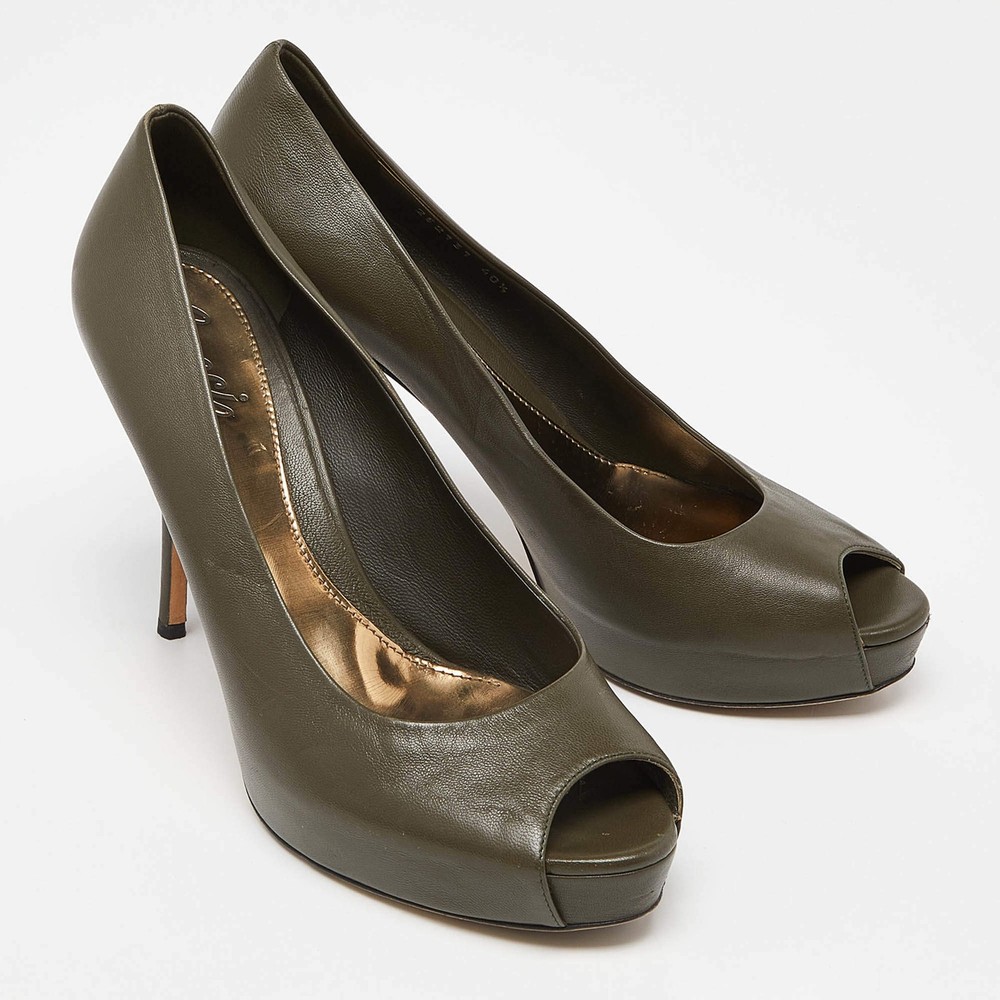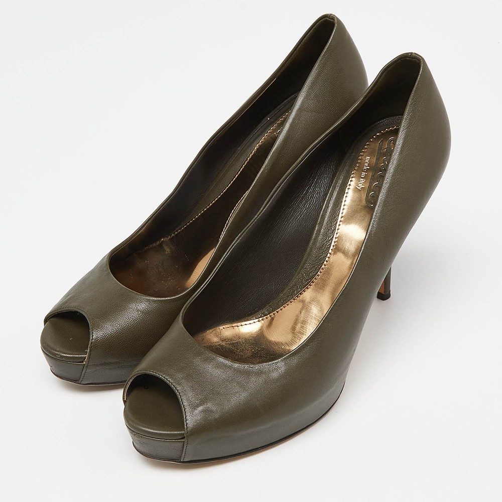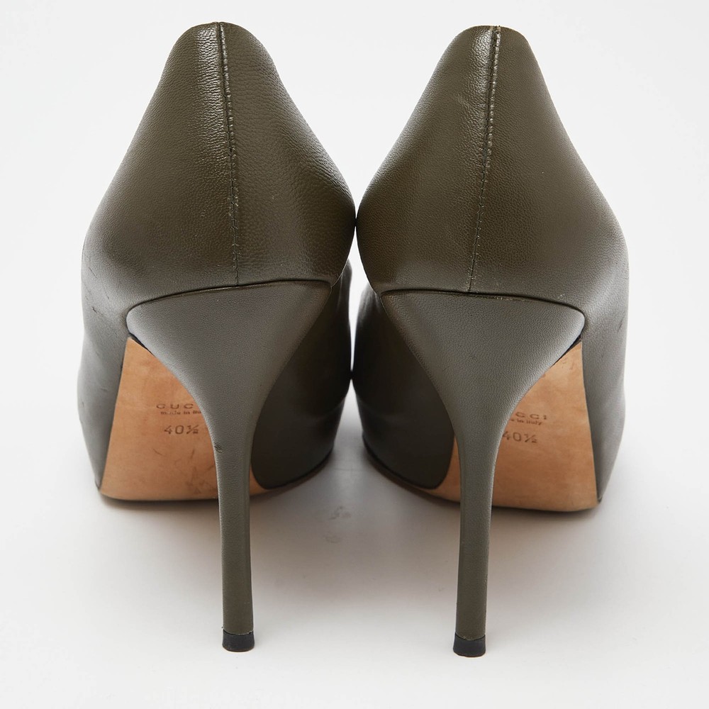 Our eBay Store About Us Contact Us Add to Favorite Sellers Gucci Olive Green Leather Peep Toe Platform Pumps Size 40.5 Discover footwear elegance with these designer women's pumps. Meticulously designed, these heels marry fashion and comfort, ensuring you shine in every setting. Product Details Brand Gucci Color Green Includes The Luxury Closet Packaging Outsole Length 25 cm Outsole Width 10 cm Size 40.5 Certified by The Luxury Closet This item has gone through a detailed authentication process overseen by our experts. We offer a lifetime guarantee of authenticity on all our items. How We Check The in-house team of experts at The Luxury Closet is highly trained to verify the authenticity and the condition of the luxury products. They ensure that only 100% authentic items are put on sale.The evaluation process is unique with its own mix of assessment criteria and differs according to the category. Each item is evaluated based on the following combination of hallmarks, hardware, stitching, symmetry, material, craftsmanship, stamping, codes, hologram stickers, and packaging. Our authenticators also check if the items have been modified or amended (e.g., aftermarket diamonds, replaced batteries, repaired bags, etc.) International Buyers Import duties, taxes and charges are not included in the item price. These charges are the buyers responsibility. Please check with your country’s customs office to determine what these additional cost will be prior to buying.