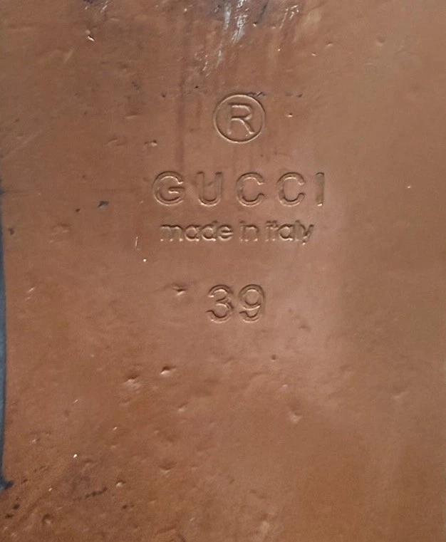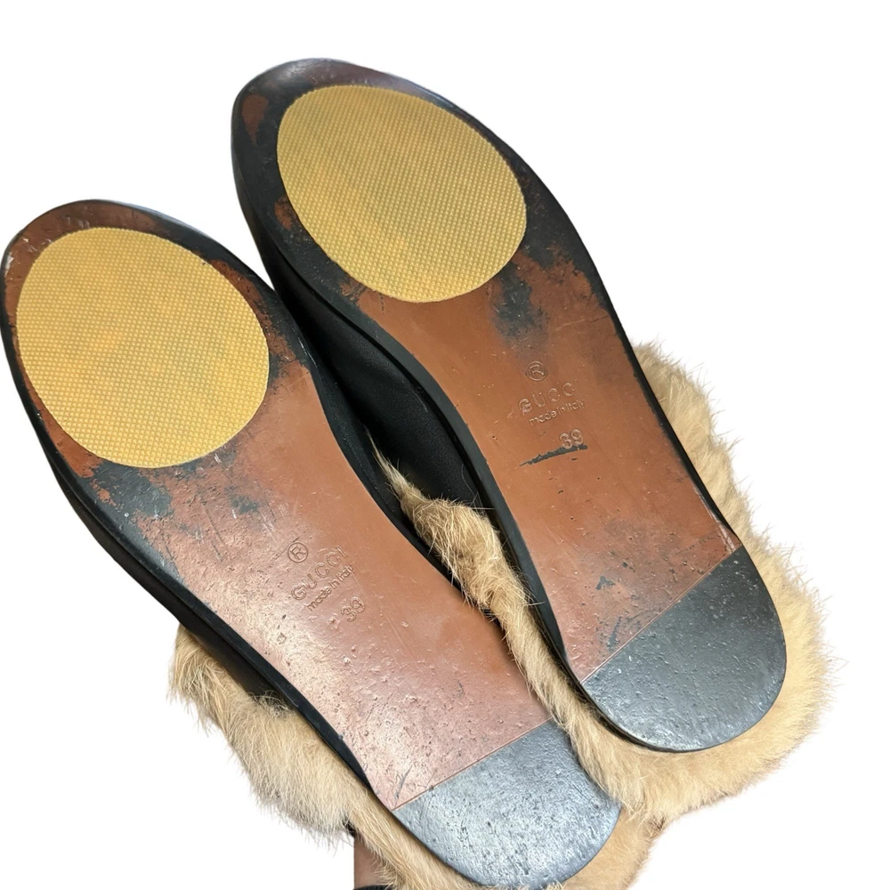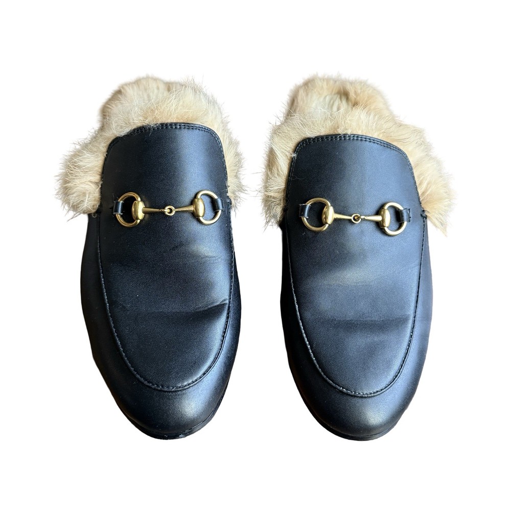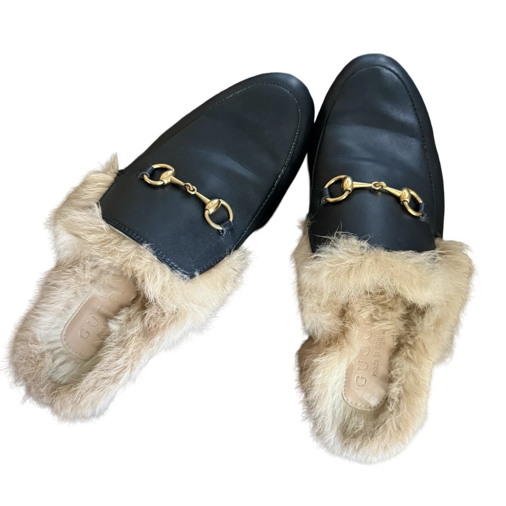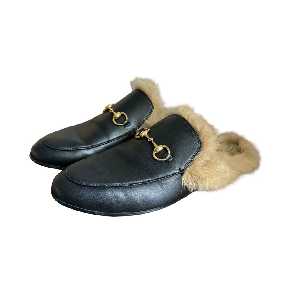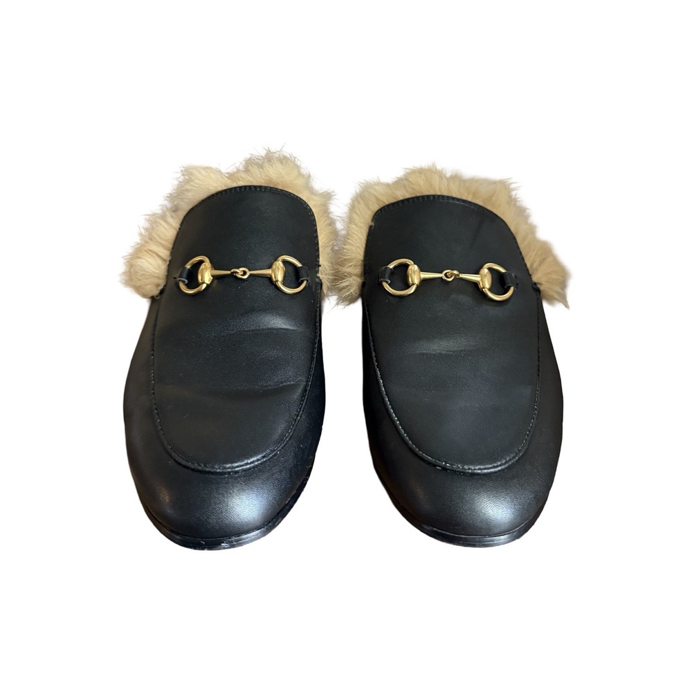 Iconic Gucci Princetown leather slippers featuring luxurious lamb fur lining and signature gold Horsebit hardware. Crafted in Italy from smooth black leather, these backless loafers are a timeless designer staple worn year-round. Originally retailed for over $1,000. A highly sought-after style that pairs effortlessly with denim, trousers, or elevated casual looks. Details: • Brand: Gucci • Style: Princetown Slippers / Mule Loafers • Upper: Black calf leather • Lining: Lamb fur / shearling • Hardware: Gold-tone Horsebit • Sole: Leather • Toe: Round • Made in Italy Condition: Pre-owned. Leather shows light creasing consistent with wear. Fur remains plush and intact. Soles show visible wear (see photos). No structural damage. Please review all photos carefully — they are part of the description. Size • Gucci size 39 • Fits approx US Women’s 8-8.5
