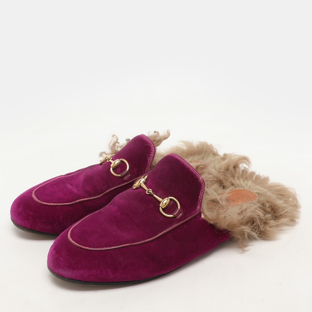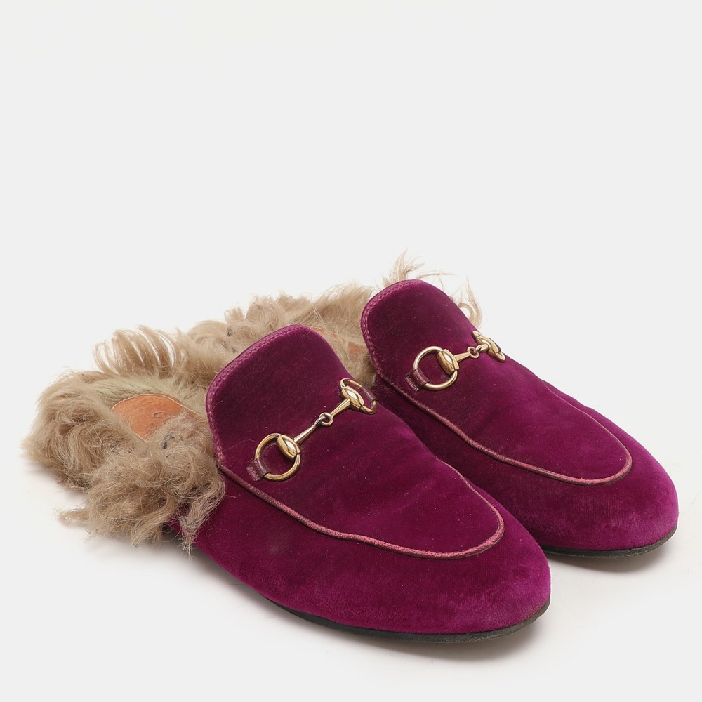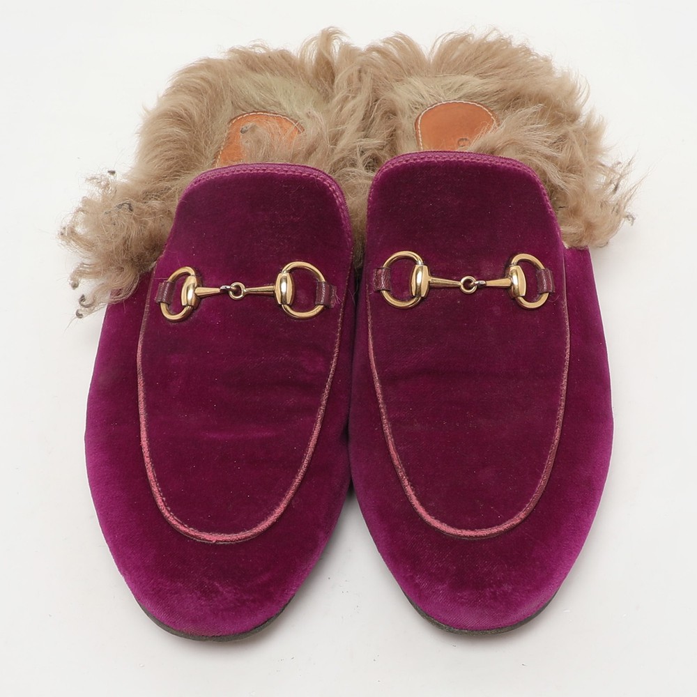 A signature Gucci silhouette, these Princetown mules are reimagined in plush purple velvet. Finished with the iconic Horsebit detail, they offer effortless elegance with a grand touch of color.Certified by The Luxury Closet - This item has gone through a detailed authentication process overseen by our experts. We offer a lifetime guarantee of authenticity on all our items. Import duties, taxes and charges are not included in the item price. These charges are the buyers responsibility. Please check with your country’s customs office to determine what these additional cost will be prior to buying. Our eBay Store About Us Contact Us Add to Favorite Sellers Gucci Purple Velvet Princetown Horsebit Mules Size 37 $236.5 A signature Gucci silhouette, these Princetown mules are reimagined in plush purple velvet. Finished with the iconic Horsebit detail, they offer effortless elegance with a grand touch of color. Product Details Brand Color Purple Dimensions Material Velvet Size 37 Outsole Width 8 cm Outsole Length 25.5 cm Heel Height Includes The Luxury Closet Packaging Certified by The Luxury Closet This item has gone through a detailed authentication process overseen by our experts. We offer a lifetime guarantee of authenticity on all our items. How We Check The in-house team of experts at The Luxury Closet is highly trained to verify the authenticity and the condition of the luxury products. They ensure that only 100% authentic items are put on sale.The evaluation process is unique with its own mix of assessment criteria and differs according to the category. Each item is evaluated based on the following combination of hallmarks, hardware, stitching, symmetry, material, craftsmanship, stamping, codes, hologram stickers, and packaging. Our authenticators also check if the items have been modified or amended (e.g., aftermarket diamonds, replaced batteries, repaired bags, etc.) International Buyers Import duties, taxes and charges are not included in the item price. These charges are the buyers responsibility. Please check with your country’s customs office to determine what these additional cost will be prior to buying.