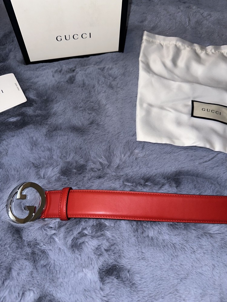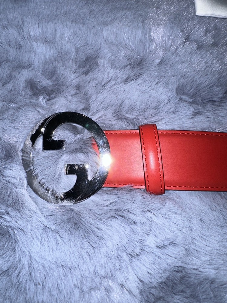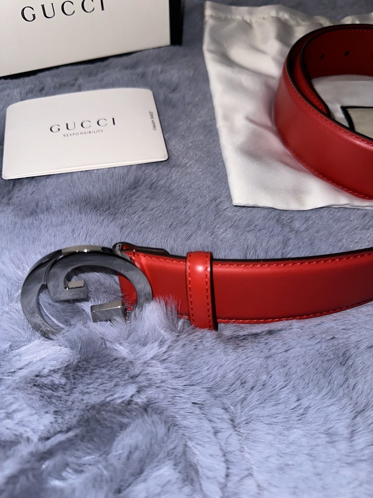 This Gucci red leather belt in size 95/38 is a luxurious accessory for men. Made in Italy, this dress belt features a solid red color, leather material, and a stylish buckle accent. The belt exudes a sense of elegance and sophistication, perfect for adding a touch of high-end fashion to any outfit. The Gucci branding adds a touch of prestige to this timeless piece, making it a must-have accessory for any man's wardrobe. (Does not come with box,dust bag or papers)