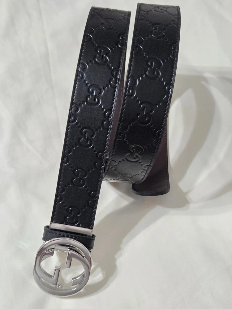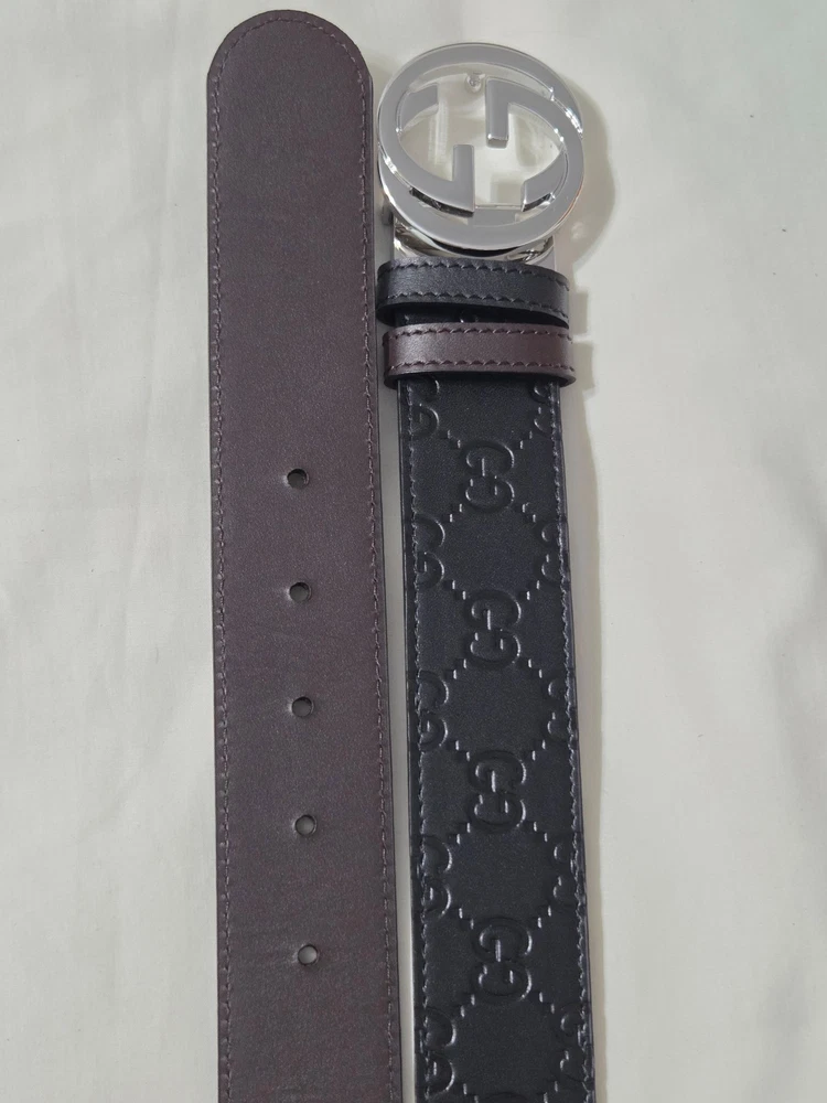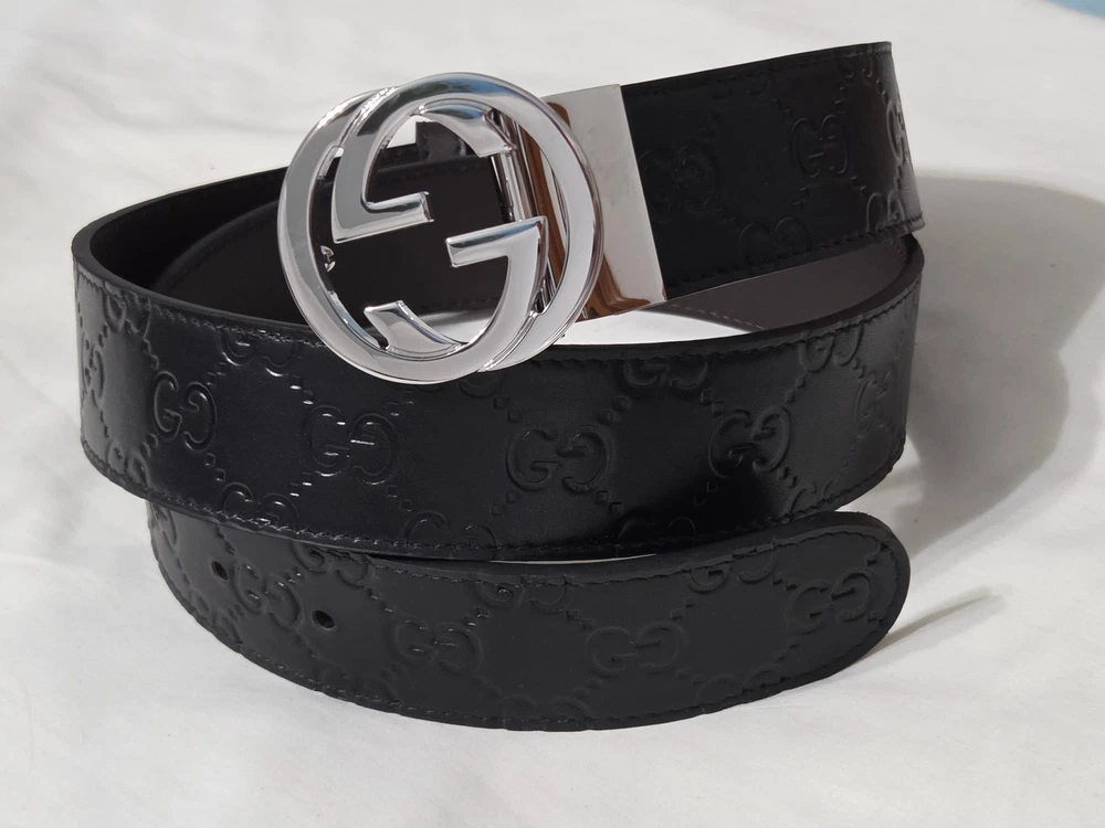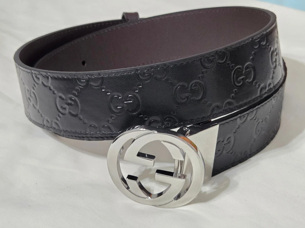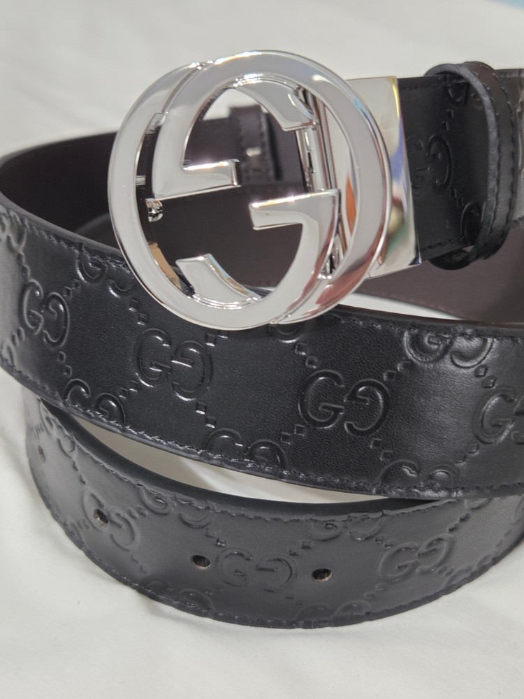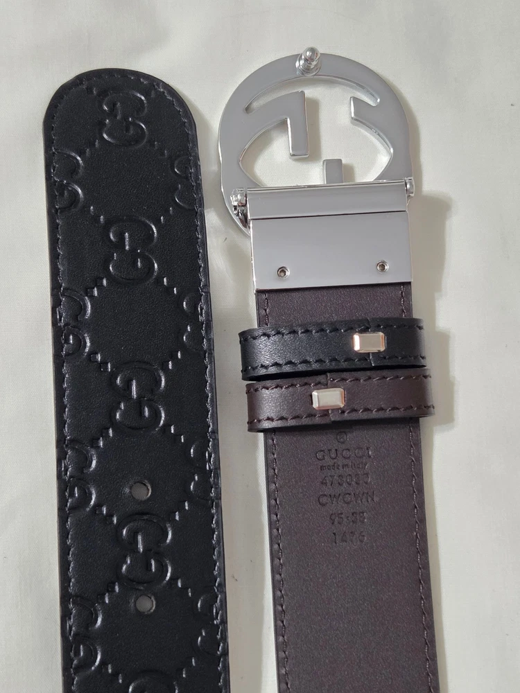 Authentic Gucci 2 in 1 Reversible Black & Brown Leather Belt Silver GG Buckle Size 95cm fits 32-34" Waist - 1.5" Width Belt is New Unworn - Mint Condition as Shown Ships Priority Mail Get it Fast! Beautiful Belt!