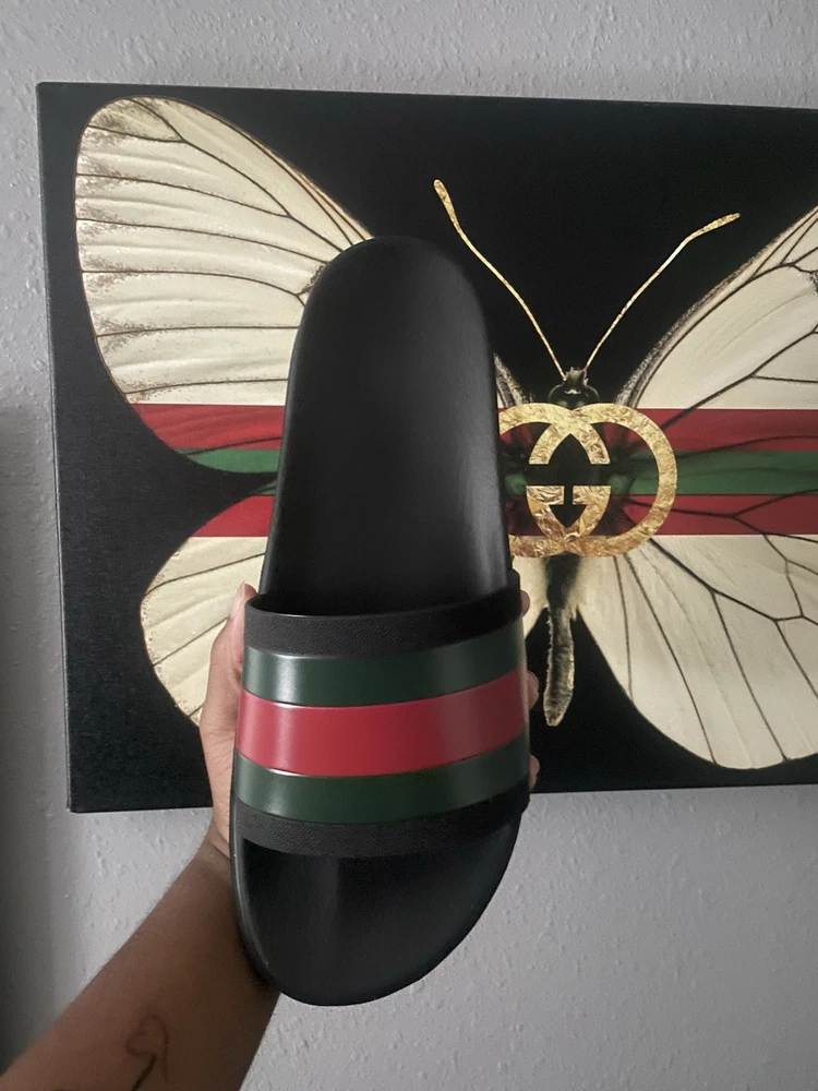 The Gucci Slides in size 14 are a stylish and comfortable option for casual occasions during the summer season. Made in Italy, these black slides feature the iconic Gucci logo accent, a slip-on closure, and a rubber outsole and insole for added durability and support. These slides are a fashionable choice for men looking for a trendy and high-quality sandal option from the renowned Gucci brand.