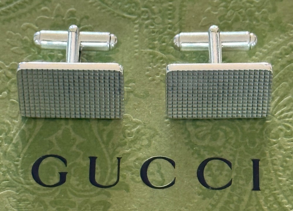 These Gucci cufflinks are pure elegance! The textured sterling silver gives them a luxurious feel, and the rectangular design adds a sleek, modern touch. Perfect for adding a polished finish to any dress shirt or suit. Made in Italy, the craftsmanship is impeccable—definitely worth the investment for a timeless accessory. Authentic and stylish!