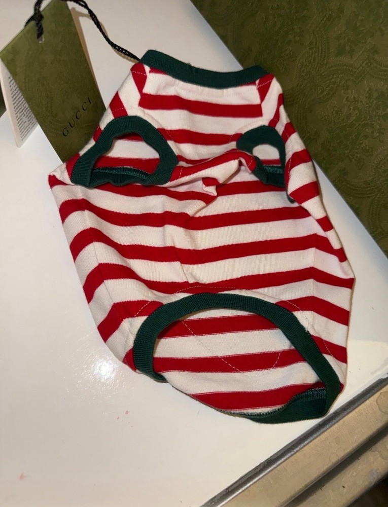 Red, white and green cotton Gucci pet shirt in size XXS with embroidered strawberry and brand signature Interlocking GG motif at top and brand label at neckline. Made in Italy. NWT 23 X 18 CM 9” x 7” Please see attached photos and feel free to reach out to me with any questions you may have. Thank you! I have two available, bundle and save!