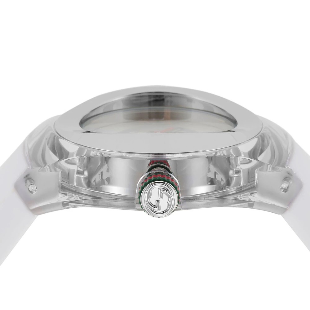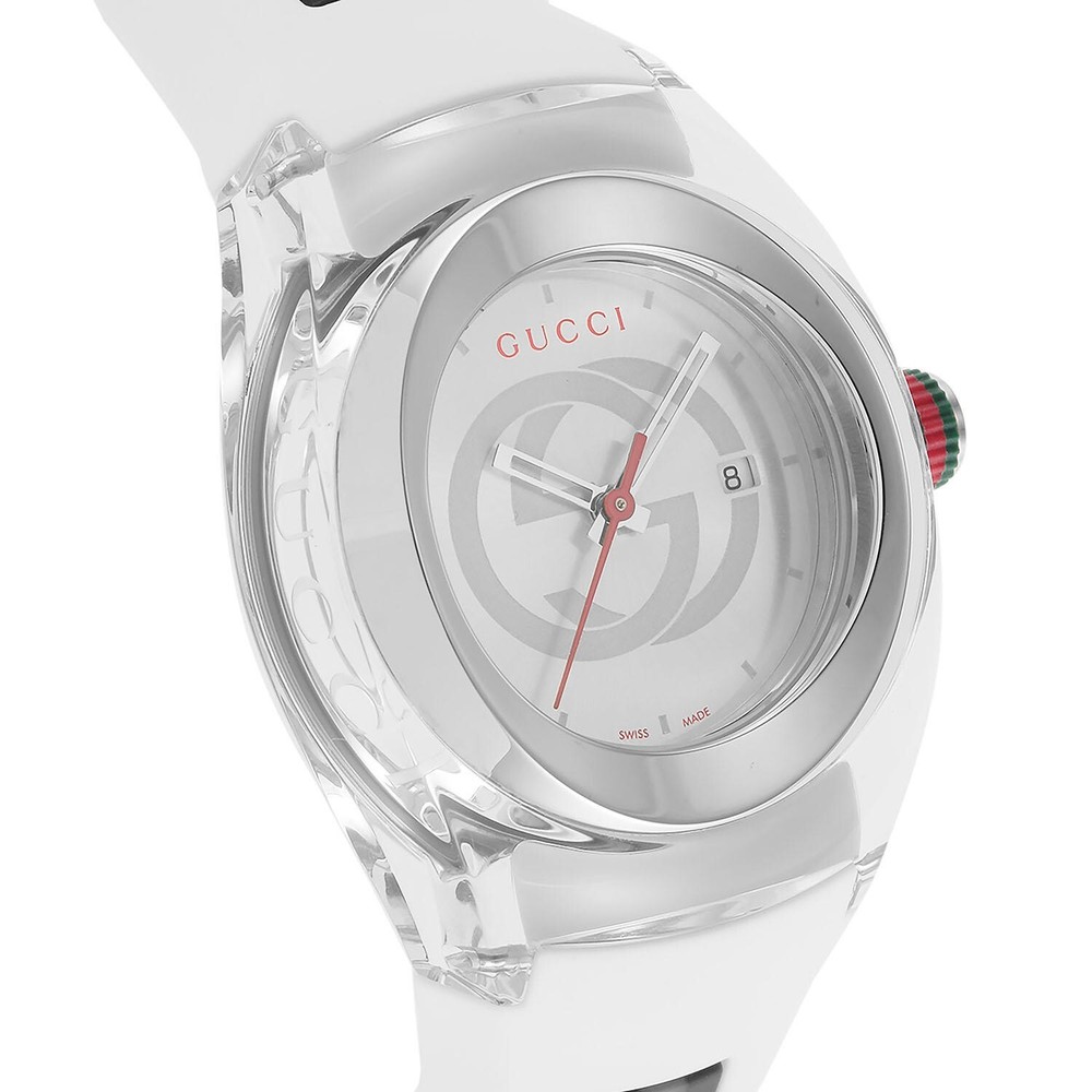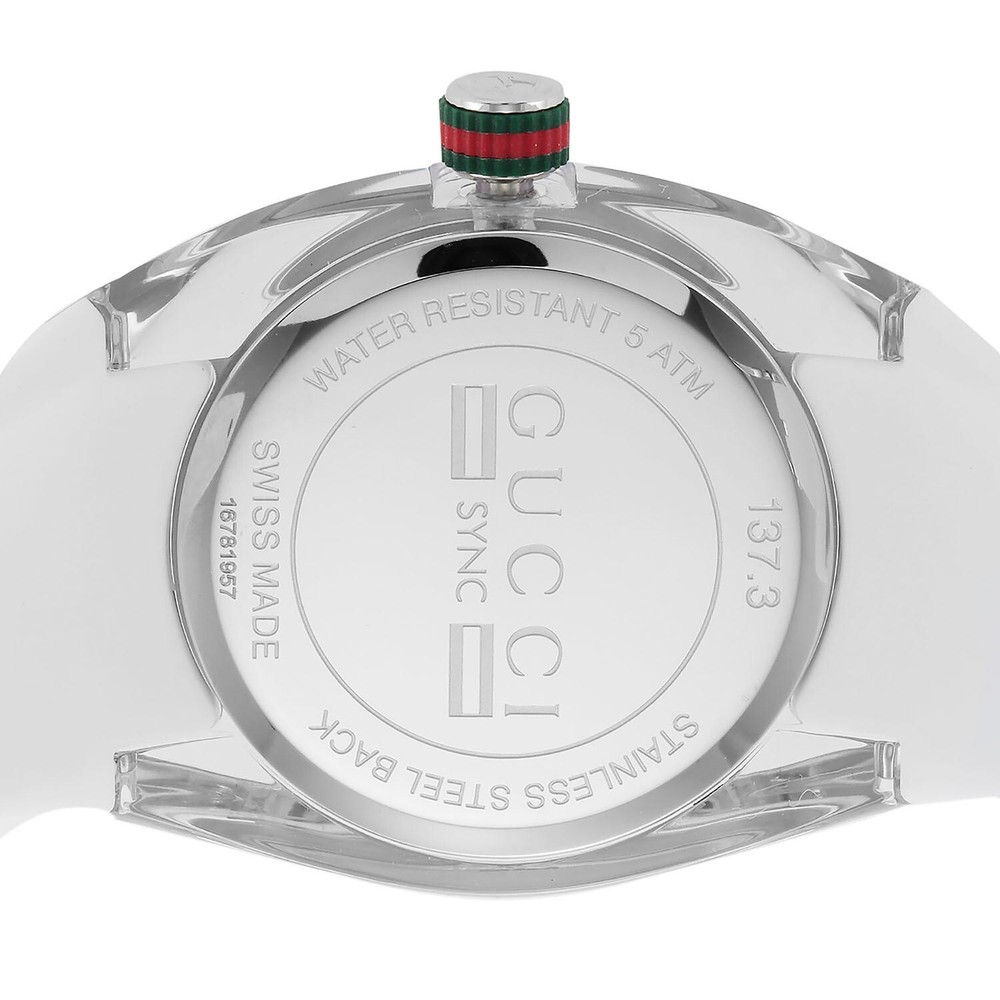 Gucci Women's Sync L White Rubber Strap Quartz Watch - YA137302 ($670 MSRP) With Gift Box! This watch is a Shelf Pull from one of the Major Department Stores. Watch has micro scratches on the watch case/band, visible under direct light. Introducing the Gucci Women's Sync L White Rubber Strap Quartz Watch (Model: YA137302), a sleek and sophisticated timepiece designed to elevate your everyday style. With its meticulous craftsmanship and contemporary design, this watch effortlessly combines fashion with functionality. The watch features a stainless steel case with a diameter of 36 millimeters and a thickness of 12 millimeters, offering a perfect balance of presence and comfort on the wrist. The silver dial, adorned with silver-tone hands and markers, exudes elegance and sophistication, while the mineral dial window ensures durability and protection against scratches. Paired with a white rubber strap and a buckle clasp, this watch provides a secure and comfortable fit for women of all wrist sizes. The 18-millimeter band width complements the sleek design, adding a touch of refinement to the overall aesthetic. Equipped with quartz movement, this watch offers precise timekeeping, making it a reliable accessory for everyday wear. The stainless steel bezel and date calendar further enhance its functionality, allowing you to stay organized and stylish at all times. Features Model number: YA137302 Dial window material type: Mineral Display Type: Analog Clasp: Buckle Case material: Stainless Steel Case diameter: 36 millimeters Case Thickness: 12 millimeters Band Material: Rubber Band size: Women's Standard Band width: 18 millimeters Band Color: White Dial color: Silver Bezel material: Stainless Steel Calendar: Date Fast and Free Shipping You're already purchasing the item. Why pay additional for shipping, especially slow shipping? We get your order shipped out within 1-business day and delivered to your doorstep as quickly as possible. Competitive Pricing With our dynamic pricing model, our prices are always competitive. Our prices are some of the lowest that you will find on the internet. Rest assured that you're getting a good deal when purchasing with us. 30-day Money Back Guarantee We are committed to making sure that you leave this transaction satisfied. If you're unhappy with the product for any reason, you may return it back for your money-back or a replacement within 30 days. No questions asked!
