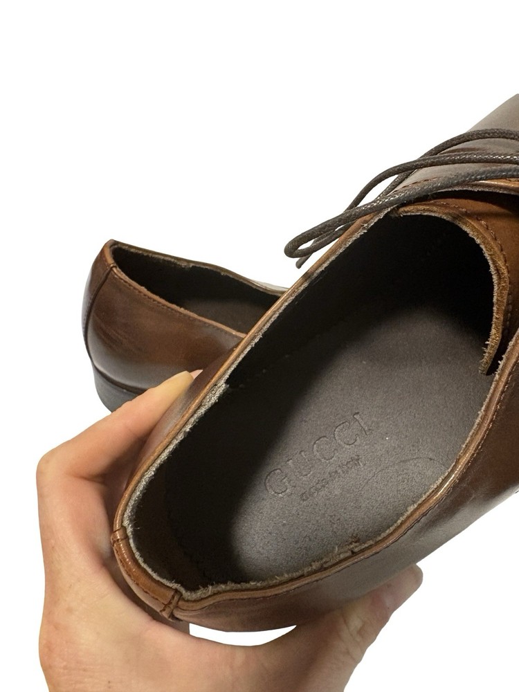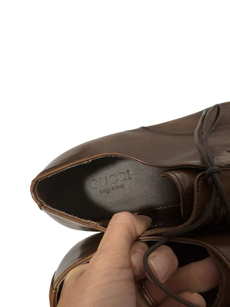 Color: Brown Style: Oxford Closure: Lace Up US Shoe Size: 10 Upper Material: Leather Features: Wingtip Brand: Gucci Type: Dress Country of Origin: Italy Department: Men