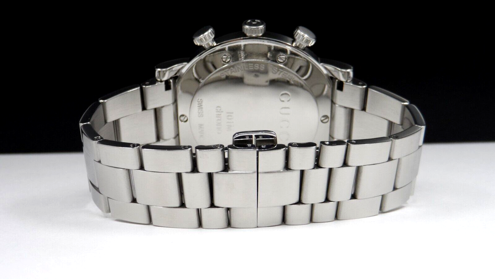 WELCOME! The watch has been professionally tested, cleaned the bracelet and case, removing all scratches and blemishes as best as possible. See pictures for details. WITHOUT TAG COMES IN GUCCI BOX WITH MANUFACTURER BOOKLET ** SEE PICTURES OF ACTUAL WATCH ** PICTURES ARE PART OF ITEM DESCRIPTION SERIAL# 14213886 G-516 WATCH INFORMATION: Stainless steel case with a stainless steel bracelet. Fixed G-shaped stainless steel bezel. Black dial with luminous silver-tone hands Minute markers around the outer rim. Dial Type: Analog. Luminescent hands. Chronograph Quartz movement. Pull / push crown. Solid case back. Round case shape. Case size: 44 mm. Fold over clasp with a push button release. WILL FIT WRIST SIZE 7 1/4" (APPROXIMATE) NO EXTRA LINKS Luxury watch style. PHOTOS MAY HAVE BEEN ENLARGED AND/OR ENHANCED All measurements are approximate and may vary slightly from the listed dimensions. WE DON’T RECOMMEND WEARING YOUR WATCH IN SHOWER/SAUNA OR OTHER SIMILAR ENVIRONMENTS DO NOT PUSH BUTTONS UNDER WATER!!! IF YOU ENCOUNTER WATER DAMAGE YOUR WATCH PLEASE CONTACT MANUFACTURE, WE ARE NOT RESPONSIBLE FOR WATER DAMAGED WATCH. Return Policy If you are not satisfied with your purchase, you may return eligible items for refund within 14 days from purchase date, buyer pays return shipping. All returns must be filed no longer than 10 days from purchase date; after that time, we are no longer responsible - no exceptions! Restocking Fee There will be a 20% Restocking Fee to cover fees incurred. Return Eligibility Items must be in same condition as you received, meaning unworn unused with tags (if applicable) intact. Conditions which will void your ability to return merchandise includes: Scratching, Breaking, Wearing items, was sized by any other jeweler or lastly, if the auction explicitly says in the description that the item cannot be returned and will be returned to the customer at the customer’s expense, and the refund will not be issued. Once the return is approved, a refund will be issued to the same method used in the purchase. All returns must be inspected and approved by us before the return is finalized. Contact us to get approval of the return. Please allow up to 5 days after we receives the item to process the return and issue credit REQUIRE IMMEDIATE PAYMENT. Sales tax might apply per ebay regulation SHIPPING USPS GROUND MAIL, DELIVERY CONFIRMATION INCLUDED. YOUR ITEM WILL BE SHIPPED SAME OR NEXT DAY AFTER PAYMENT IS CONFIRMED. We don't sell and ship internationally To International Customers Using Freight Forwarding Companies, Agents, or Entities: Contracting with a freight forwarding company, agent, or entity, releases Allbestwatches from any and all liability regarding your purchase from the date the purchase is received by the freight forwarding company, agent, or entity. You, the customer, assume responsibility for any and all cosmetic or mechanical defects and/or receiving the purchase from the freight forwarded. THE WATCH OUT OF USA CAN'T BE RETURN FOR ANY REASON. I ship to the confirmed address on file with Ebay and will not ship to a third party address Please make sure your address is correct on Ebay PRIOR to payment If necessary correct address before payment is made, corrections made after payment is submitted will NOT reflect on your purchase THE WATCH OUT OF USA CAN'T BE RETURN FOR ANY REASON.