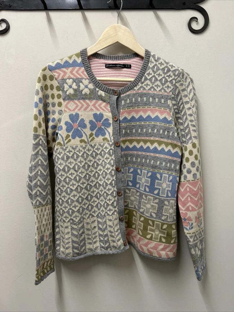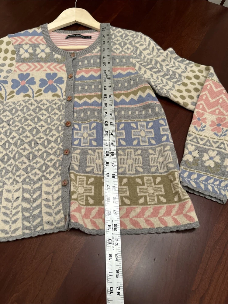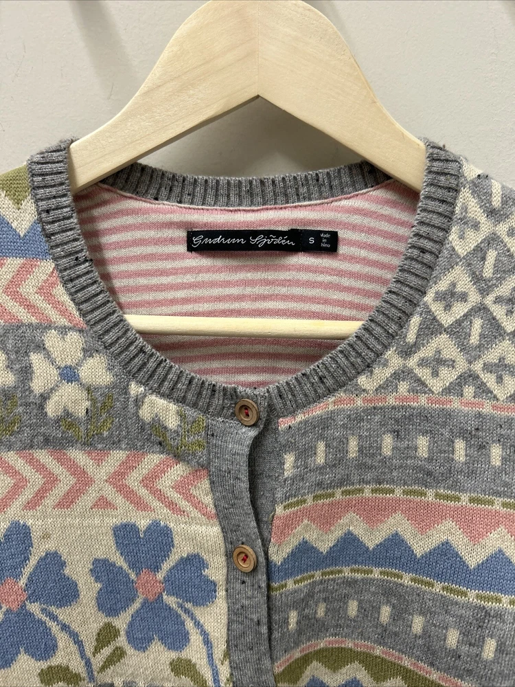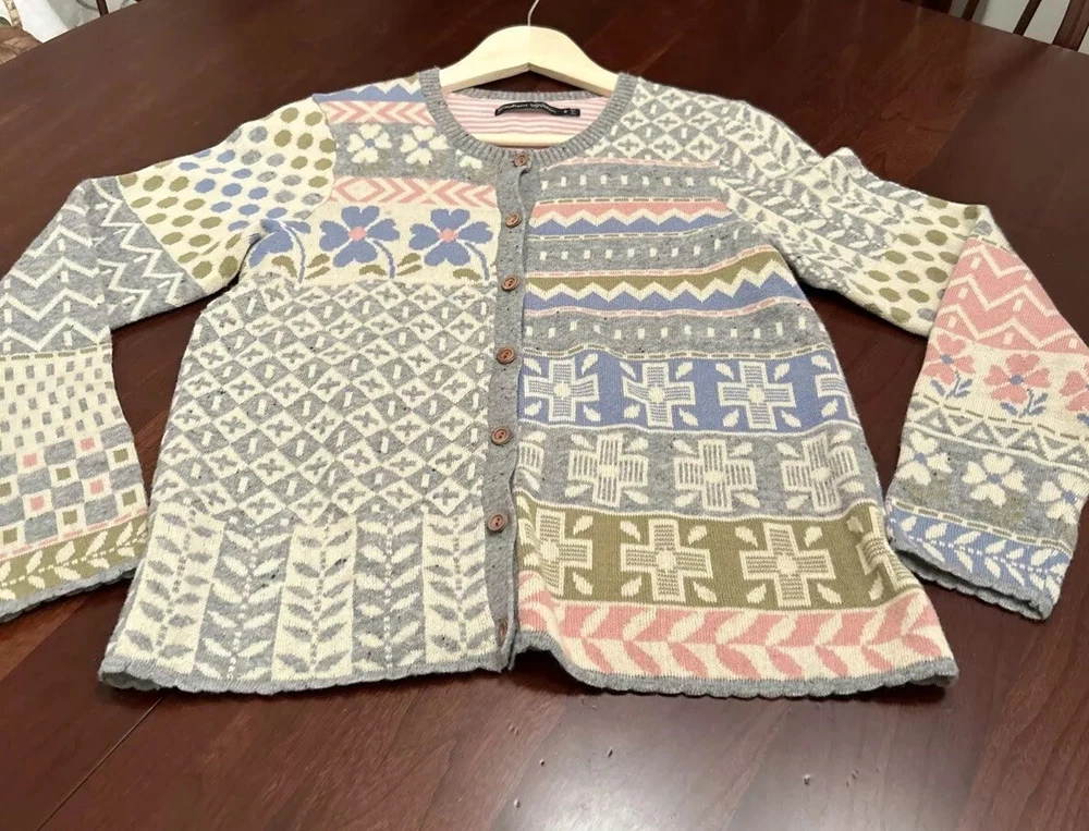 Gudrun Sjoden Womens Cardigan S Ivory Floral Wool Cotton Lagenlook Patchwork This Gudrun Sjoden cardigan is a must-have for any fashion-forward woman. The ivory floral pattern and tight-knit wool and cotton fabric make it perfect for any occasion, whether you're traveling, attending a party, or just dressing casually. The long sleeves and crew neckline provide warmth and comfort, while the button accents add a touch of elegance. This vintage cardigan is a regular fit and is made from lightweight knit fabric, making it suitable for all seasons. It features a patchwork design and is hand wash only. The cardigan is made in Bulgaria and is available in size S. Add this ethnic-themed cardigan to your wardrobe today and elevate your style game!