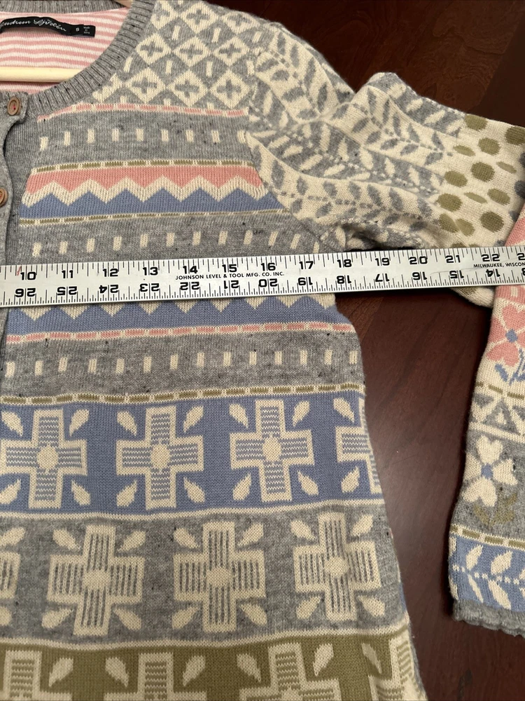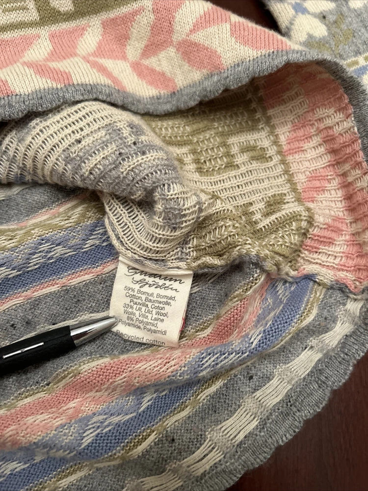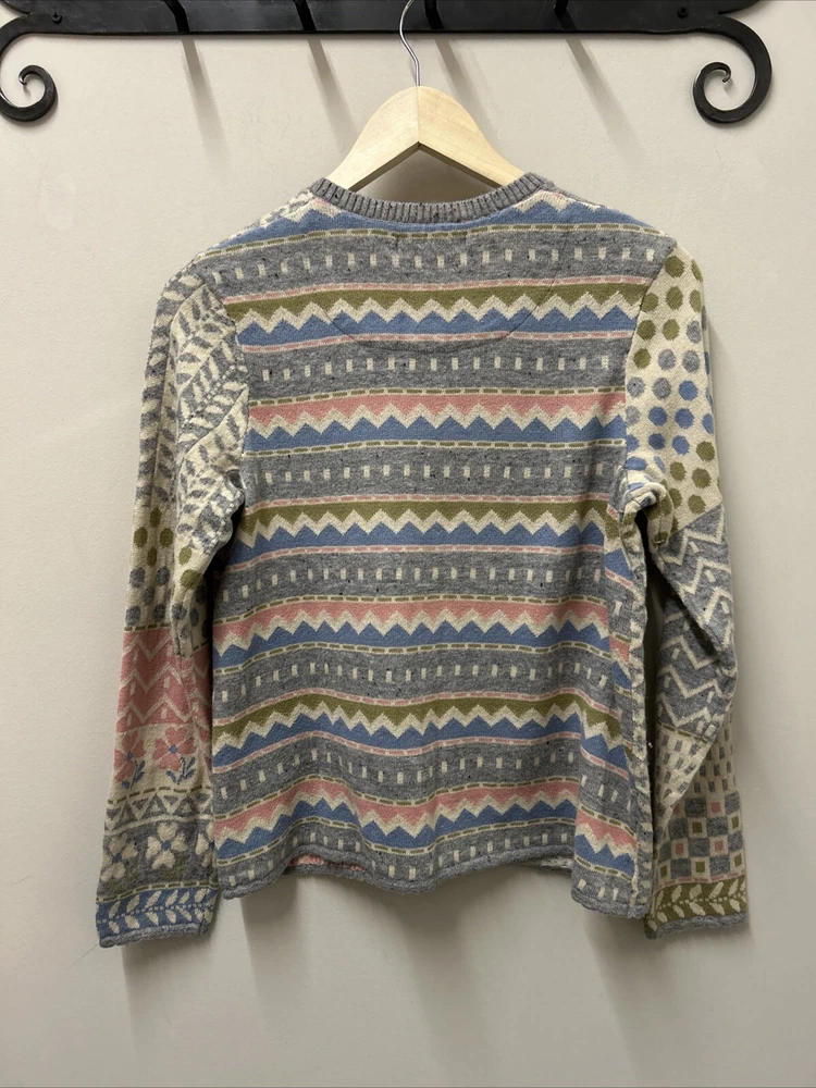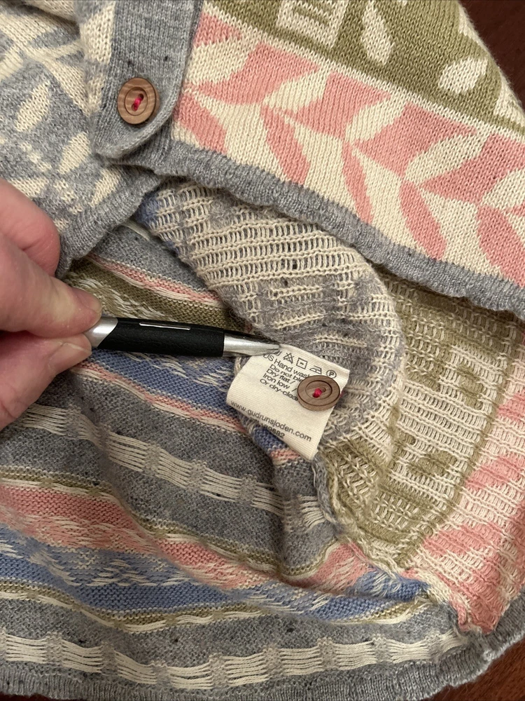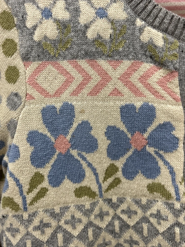Gudrun Sjoden Womens Cardigan S Ivory Floral Wool Cotton Lagenlook Patchwork This Gudrun Sjoden cardigan is a must-have for any fashion-forward woman. The ivory floral pattern and tight-knit wool and cotton fabric make it perfect for any occasion, whether you're traveling, attending a party, or just dressing casually. The long sleeves and crew neckline provide warmth and comfort, while the button accents add a touch of elegance. This vintage cardigan is a regular fit and is made from lightweight knit fabric, making it suitable for all seasons. It features a patchwork design and is hand wash only. The cardigan is made in Bulgaria and is available in size S. Add this ethnic-themed cardigan to your wardrobe today and elevate your style game!