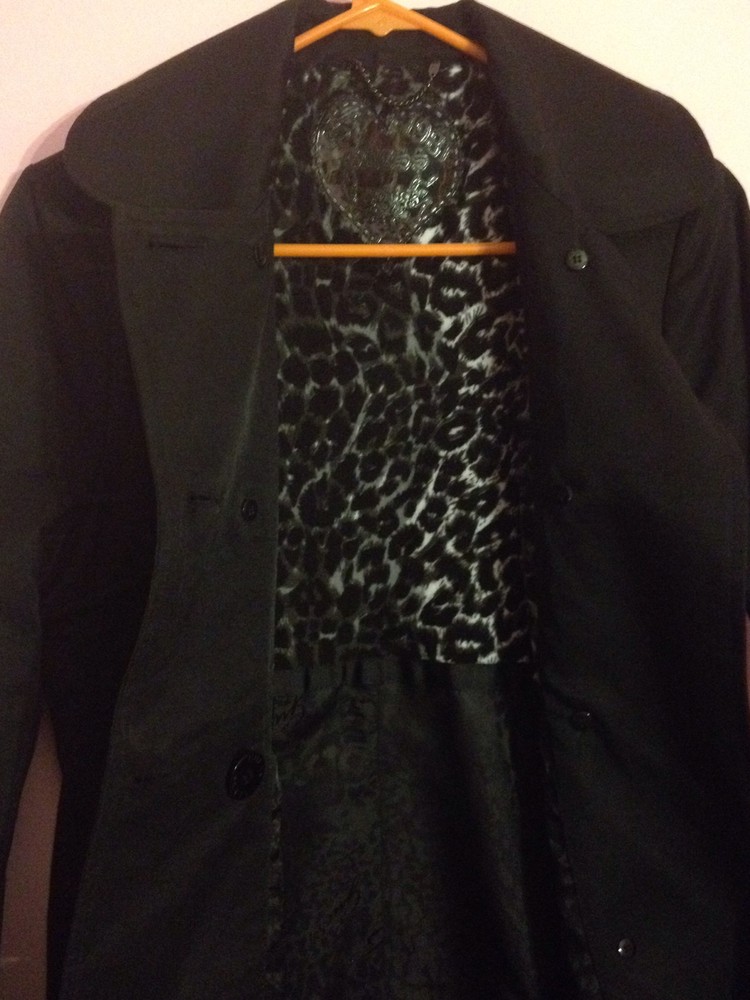 This cute double breast Guess trench coat is a must have staple for every fashionista. The trench coat has pleating around hem. The cuffs of the sleeves have straps that button. The trench coat has a back button storm flap and gun flaps at front of shoulders. The upper back of this trench coat has a soft animal print lining for extra warmth. This is a great trench for the fall. Trench coat is cotton, nylon, and polyester. Size medium.