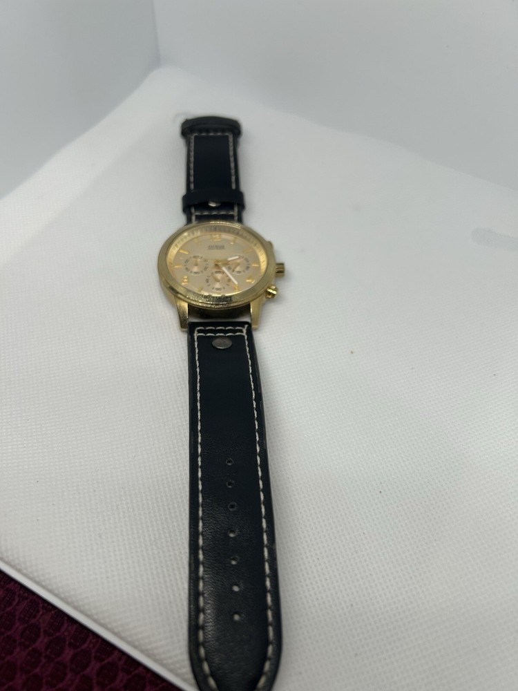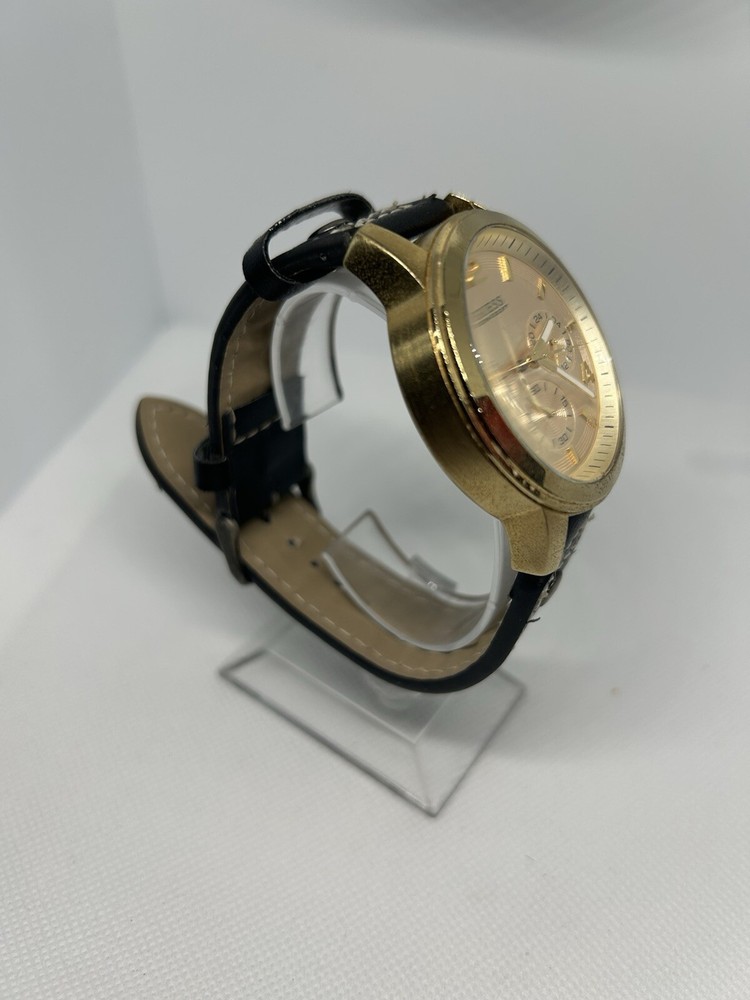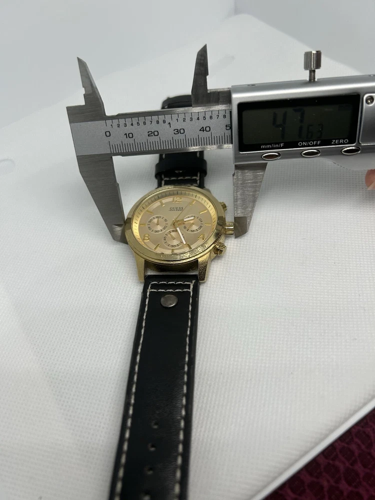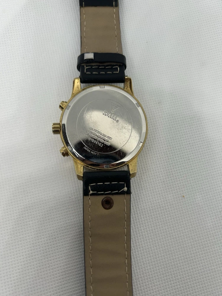 Elevate your style with this stunning Guess Cronograph wristwatch for men. Crafted with a brushed stainless steel case and a gold leather strap, this timepiece boasts a round rose gold dial with stick indexes and a 12-hour smooth bezel. The watch is water-resistant up to 100 meters (10 ATM) and features a quartz movement for precise timekeeping. This wristwatch is the perfect addition to any casual outfit and is sure to turn heads with its sleek and sophisticated design. The Guess U15061G2 comes without papers or original box/packaging, but it is not customized. Reference number: U15061G2. This watch is pre owned and in good condition. It has some grime on its case. Leather strap is still in good condition