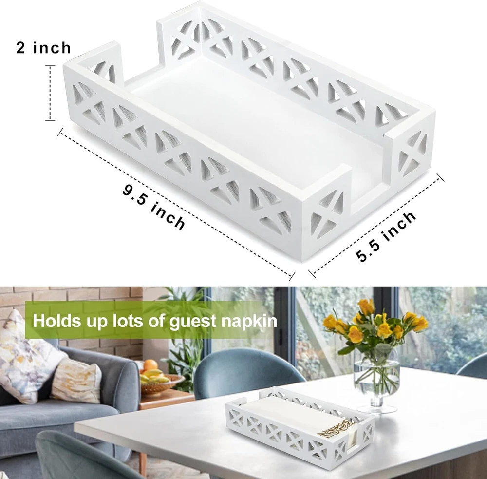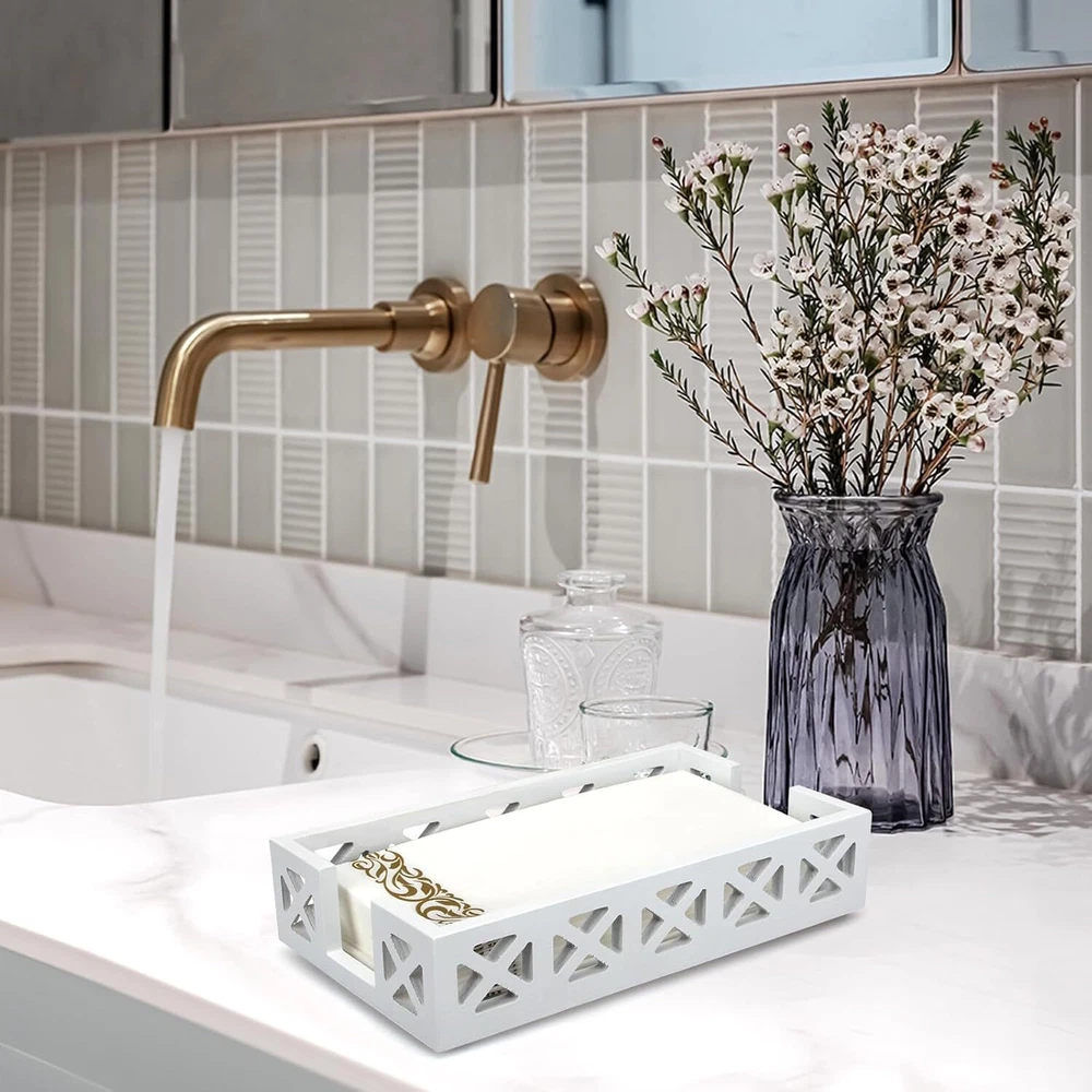 Guest Towel Holder Tray for Bathroom Napkin Modern Disposable White Product Details Color: White Material: Wood Brand: Renawe Product Dimensions: 2"D x 5.5"W x 9.5"H Item Weight: 0.18 Kilograms Style: countertop hand towel holder Manufacturer: Renawe Item Weight: 6.4 ounces Country of Origin: China Item model number: towel holder for bathroom STYLISH NAPKIN HOLDER: This wood napkin holder has a pretty hollow-carved design. Made well, nice looking, good quality. PERFECT GUEST TOWEL HOLDER: Measures 9.5 x 5.5 x 2 inches, fits standard 8.5 x 4.5 inch guest towel/buffet napkins. Goes with your bathroom and holds a lot of hand towels. DECORATIVE NAPKIN HOLDER FOR TABLE: Just what you needed for paper towels. This disposable hand towel holder organizes your guest towel and buffet. Great paper towel holder for bathroom, kitchen, bar countertop. NICE QUALITY: This cloth hand towel tray is attractive, sturdy and fits the paper hand towels nicely. Looks great in bathroom. Meets intended use perfectly. GREAT PAPER TOWEL TRAY: Be available anywhere, not just napkin holder for bathroom or kitchen. Whether you want it for outdoor picnic, party, restaurants, cafés, or just for special occasions.