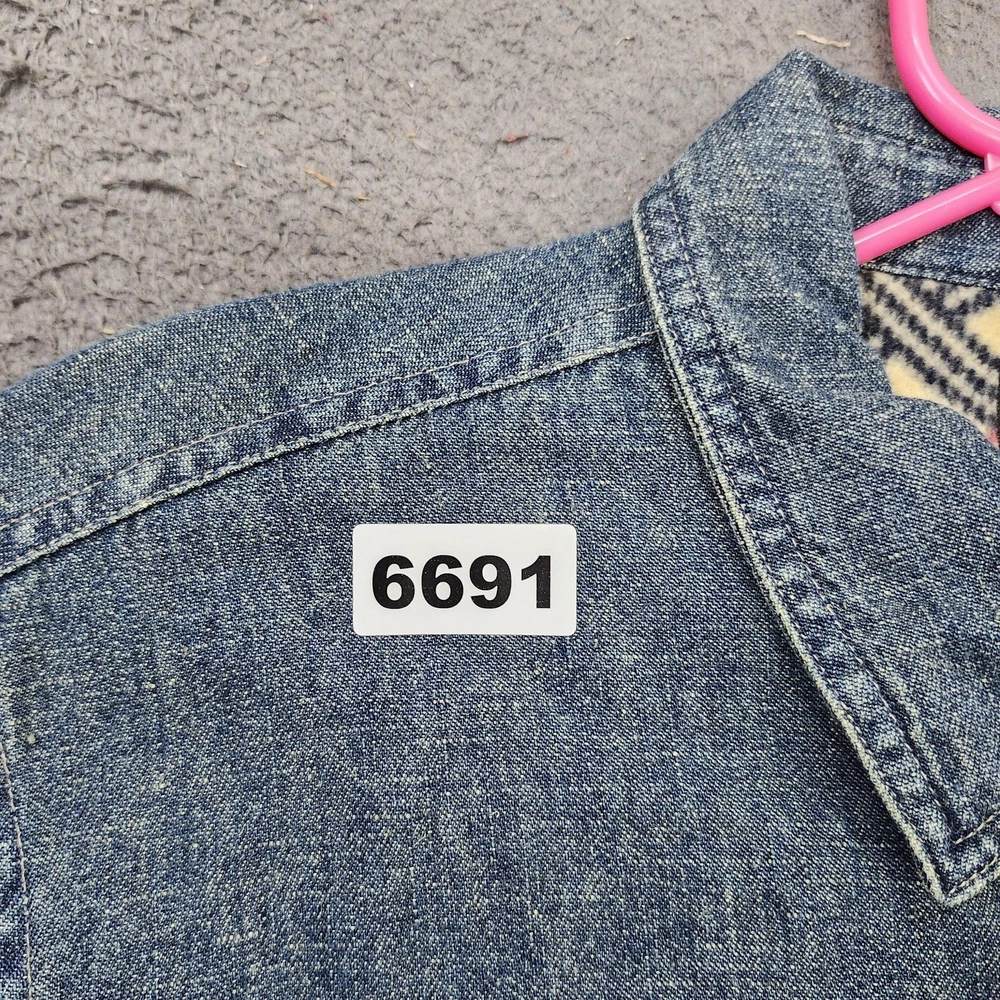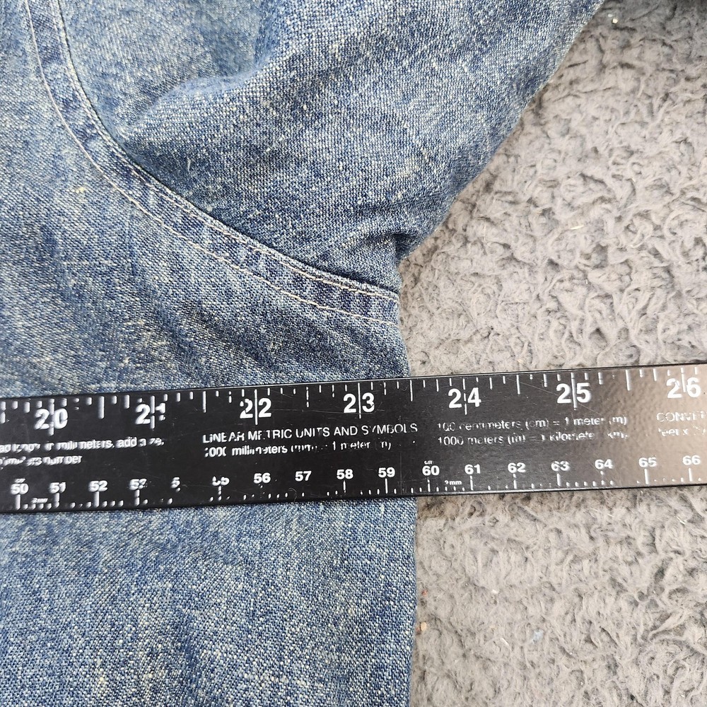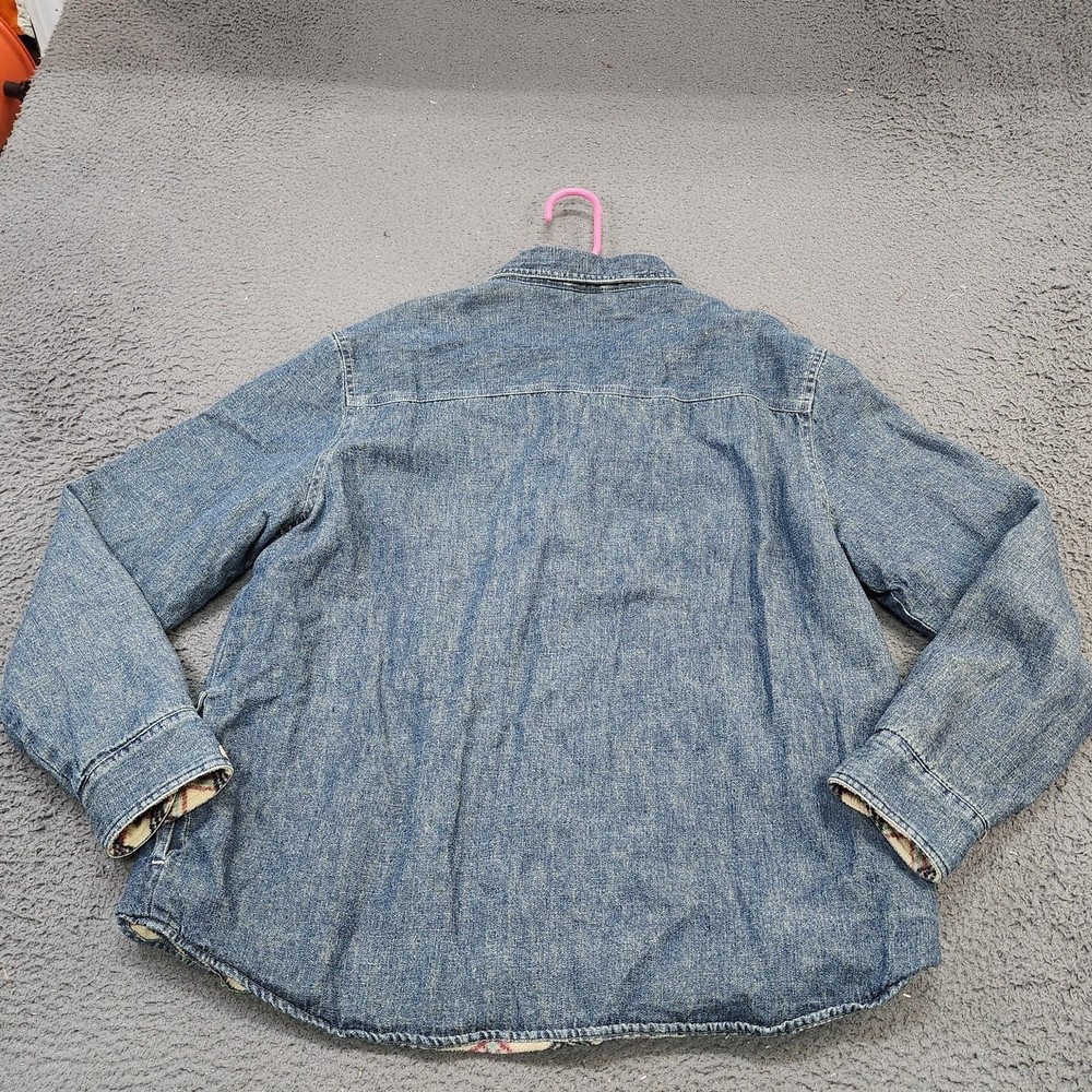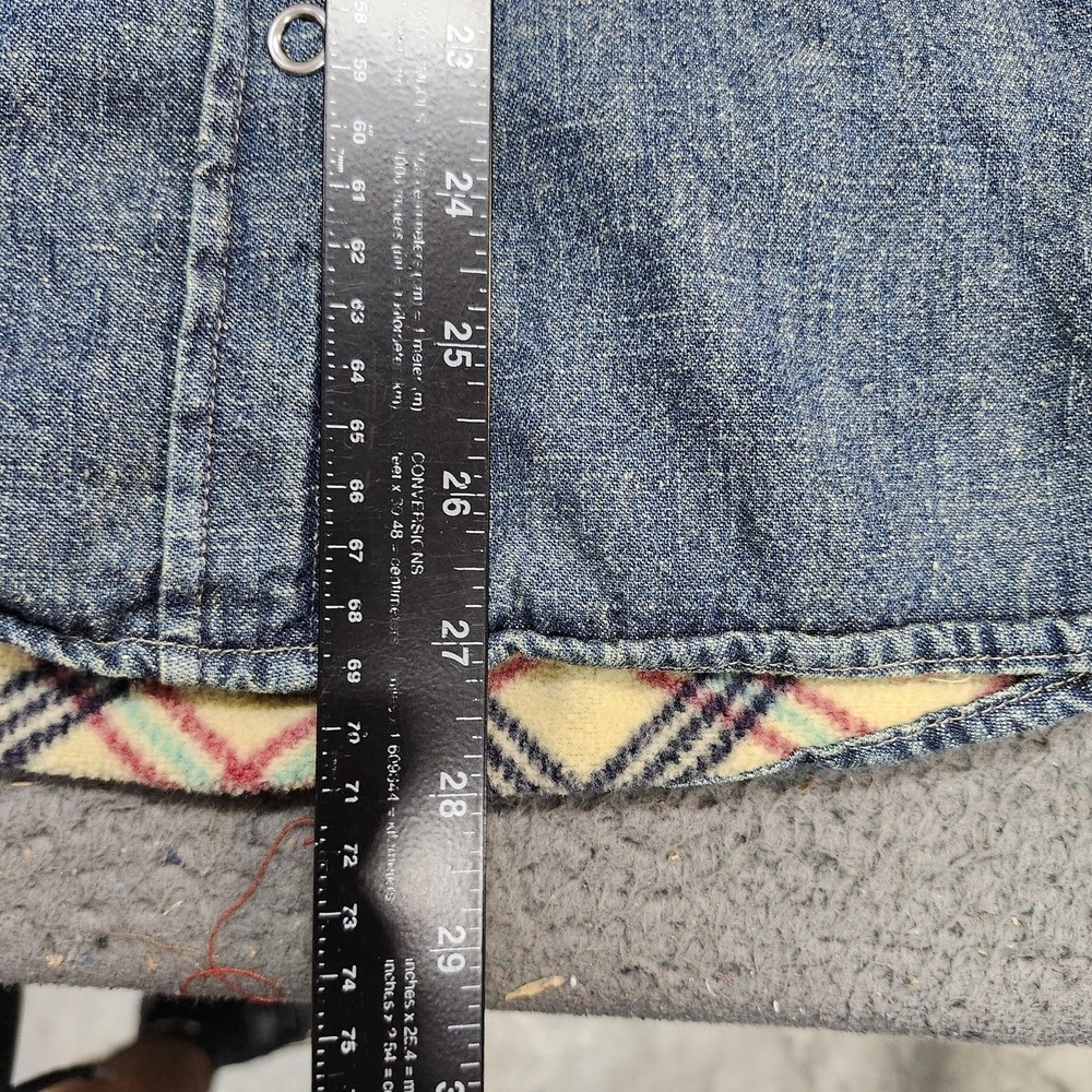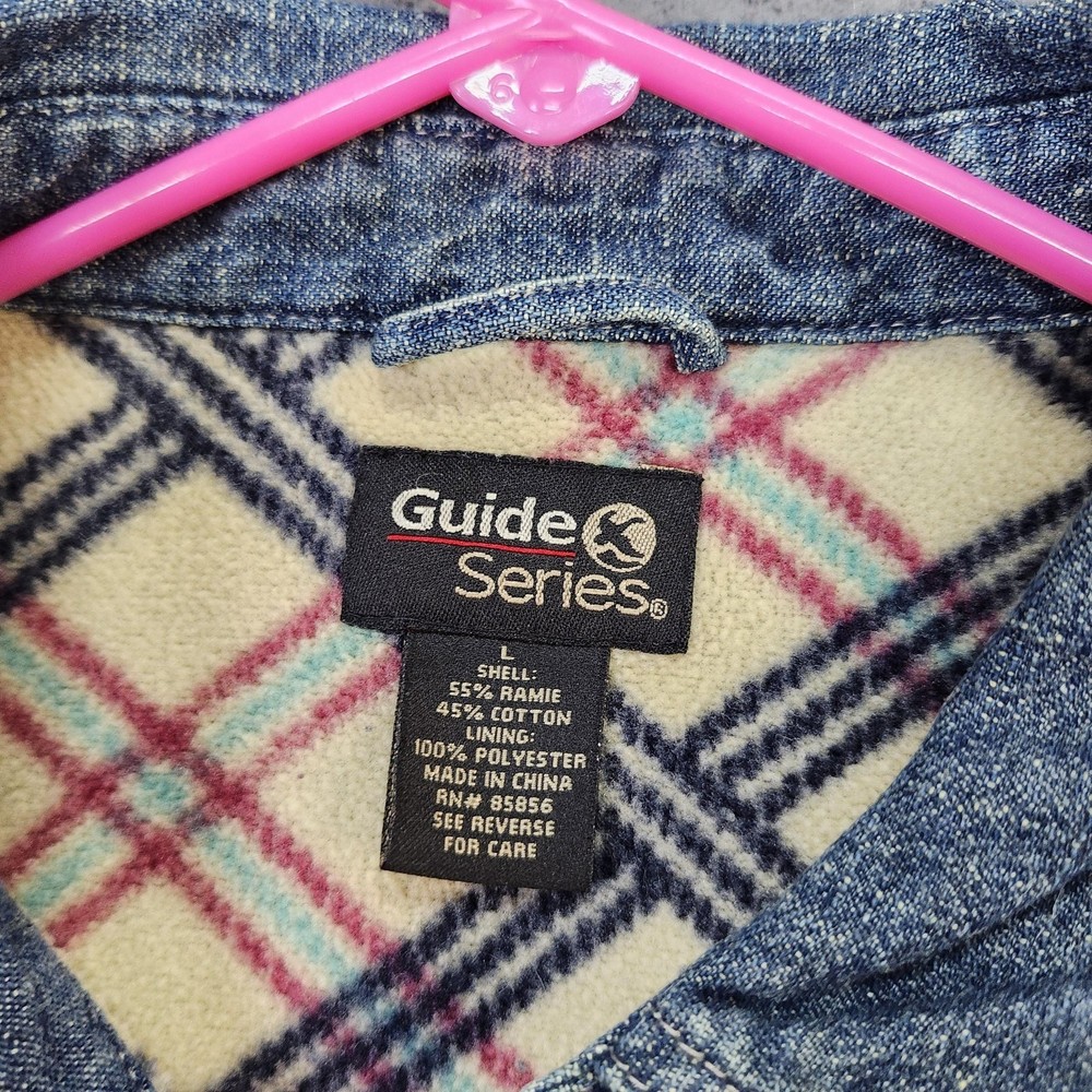 Guide Series denim shirt jacket provides exceptional warmth with its full plaid fleece lining. Crafted from a durable ramie and cotton blend, this medium wash denim piece features a classic button-front closure, a single chest pocket, and buttoned cuffs. The curved hem and relaxed fit make it an ideal layering piece for outdoor activities or casual everyday wear in cooler weather. Measurements: • Pit to Pit: 23.5" (47" doubled) • Length: 27" Brand: Guide Series Type: Shirt Jacket Material: 55% Ramie, 45% Cotton Lining: 100% Polyester Fleece Pattern: Solid Denim with Plaid Lining Closure: Button Sleeve Length: Long Sleeve Pockets: One Chest Pocket Neckline: Collared Keywords: Gorpcore, Workwear, Shacket, Flannel Lined, Rugged, Outdoor, Cabin, Camping, Winter, Layering, Utility, Heritage * All items have been cleaned and disinfected * We stand behind all items we sell so please contact us if you have an issue with any order * Look at pictures for any imperfections " Holes, Stains Etc.."