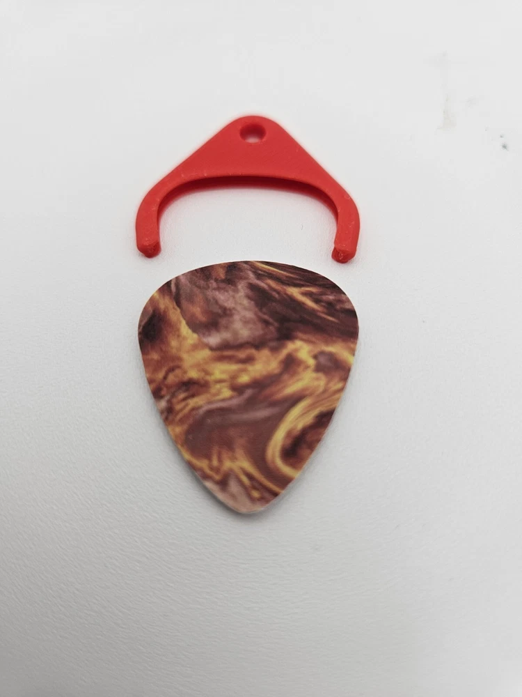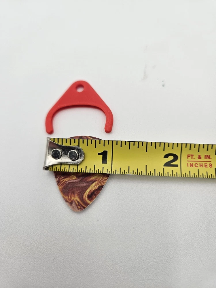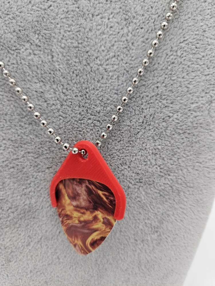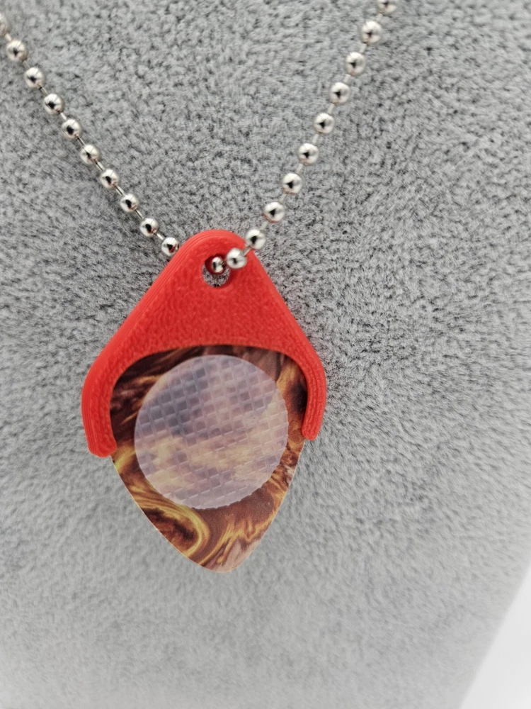Keep your guitar pick handy on a Necklace. Can be changeable with any standard 1 inch guitar Pick. Comes with Chain, Pick Holder, and Pick. The Pick has a thumb grip attached to it.