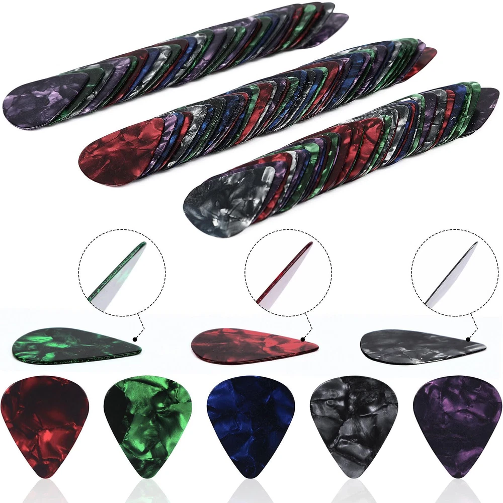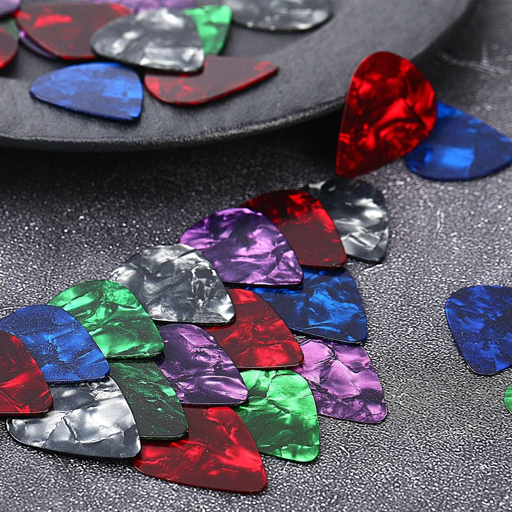 The 150 pieces guitar picks set is a multi-functional set, designed for different types of musicians and music lovers. Package includes 3 different thicknesses of 0.46mm, 0.71mm and 0.96mm, 50 pieces for each thickness. Have 5 colors: black, green, blue, purple and red. Various colors can meet the different playing needs of guitarists, whether delicate fingering or intense string playing, you can find a suitable dunlop guitar picks. These tortex guitar picks are made of good-quality celluloid, ultra-thin, lightweight, tough, durable and not easy to break, providing stable timbre performance. Accurate cutting and smooth surface provide comfortable feel and accurate playing control, so that you can easily play the music you want. The tortex guitar picks adopt classic heart guitar pick shape. The dunlop guitar picks are not only cute in appearance, but also fits your fingers very well, which helps players to express their feelings well and play beautiful music. Different thickness of guitar picks will have different effects on sound quality. Choosing the appropriate thin guitar picks can make your music more pure and smooth, can meet your requirements for sound quality. The tortex guitar picks set is suitable for playing various musical instruments and styles, such as folk guitar, electric guitar and bass. The guitar picks are also ideal choice for practicing, rehearsing and performing, which will make your music performance more fluent and free. The tortex guitar picks not only have a variety of thickness and color choices, but also with reliable quality and multiple applications, making the thin guitar picks ideal choice for guitarists and music lovers. No matter beginners or experienced musicians, they can find the appropriate dunlop guitar picks and add colorful to the music journey. Package Contents: The guitar picks set contains 150 guitar picks with different thicknesses of 0.46, 0.71 and 0.96 mm. Different thicknesses of tortex guitar picks produce different playing timbre and touch, you can choose the suitable thin guitar picks according to your own needs and personal preferences Good-Quality Material: The guitar pick is made of good-quality celluloid material, which is ultra-thin, lightweight, tough, comfortable, durable and not easy to break, providing stable timbre performance, allowing you to operate easily Five-Color Mixing: The guitar picks set have 5 different colors: black, green, blue, purple and red, which are rich in colors, can meet your personal needs, so that you can try different color combinations and match a beautiful decor for your instrumental performance Classic Guitar Pick Shape: The guitar picks adopt classic heart guitar pick shape. The guitar picks are not only cute in appearance, but also provides a comfortable feel when playing, which fits your fingers very well and helps players to express their emotions well and play beautiful music Wide Application: The guitar picks set is suitable for playing various musical instruments and styles, such as folk guitar, electric guitar, bass, violin, ukulele and so on. The thin guitar picks are also ideal choice for practicing, rehearsing and performing, which will make your music expression more fluent and free