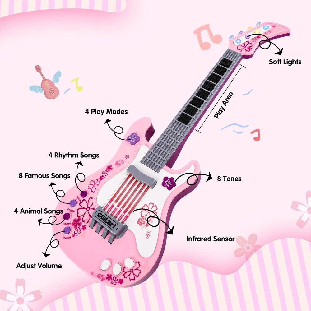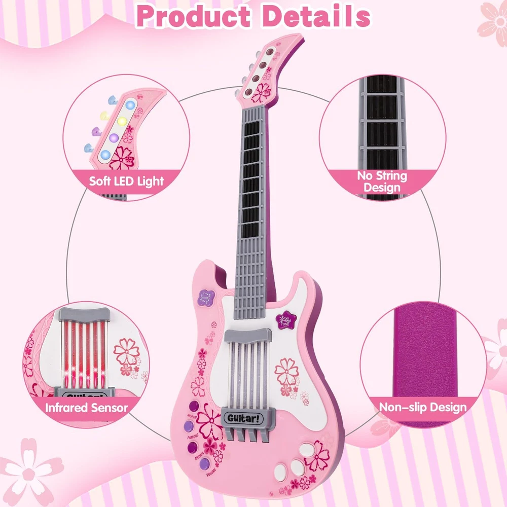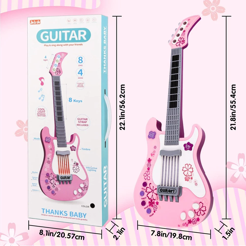 Why Choose Toy Guitar? 1.Safety Material Guitar made of high-quality ABS environmentally material, sturdy and non-, safe and very kid friendly.BPA free, wear-resistant and drop-resistant. No string design, smooth edge design, no risk of scratching the kid's hand. 2.Excellent Sound Quality Clear and high quality sound, you can adjust the volume to let the children play alone, don't worry about disturbing others.This Toy Guitar has colorful flash that attracts the 's attention and soft lights will not harm 's eyes. 3.Develop Children Musical Talent guitar helps children learn music and develop musical talent, develop the sensitivity of music and cultivating music interesting and sense of music.As a children's toy, you can also develop your 's memory, hearing, hand-eye coordination and emotional intelligence. 4.Perfect Gifts for This toy guitar is the best gift for boys, girls and children over 3 years old. The perfect children's gift for birthday, Christmas, party. Increase parent-interaction, improve intelligence, and train future musicians. It is also perfect to home and party decoration, create a warm musical atmosphere. Specifications Material: Safe ABS Plastic Color: Pink Size: 22.4" x 7.9" x 1.8" /56.8 CM X 20 CM X 4.5 CMPackage Content: 1× Toy Guitar 【8 Demos & 4 Animal Sounds】The electronic guitar built-in 8 demos, 4 animal sounds, 4 tones and 4 rhythms. It can help your to learn animals, promote 's cognitive ability as well as memory. You can also adjust the suitable volume for your . 【3 Instruments & Flash Lighting】The toy guitar come with 3 instruments sounds, 8 keys, 4 flash lights, 6 colorful tubes also feature sensing. Through the rhythm of the finger, the light will the flash! Unique sensing can bring your different experience. The flash light attracting ' attention when press the button. Also can exercise hand-eye coordination. 【No String Design】guitar made of high-quality ABS environmentally material, sturdy and non-, safe and very kid friendly. BPA free, wear-resistant and drop-resistant. NO STRING DESIGN, no risk of scratching the kid's hand. 【Perfect Gift for 】The play guitar with rich colors and multiple play modes can help children to identify colors, animals and different instruments. Musical sounds can motivate 's hearing, develop their sensitivity to music, cultivate children's musical pleasure and sense of music. A nice gift for toddlers on Christmas, Birthday, Children’s Day, holiday, Special days and so on! 【Portable Guitar for 】The guitar toy powered by 3 AA batteries (Not included) and equipped with back strap. Perfect size and light weight are suitable for to carry it anywhere.