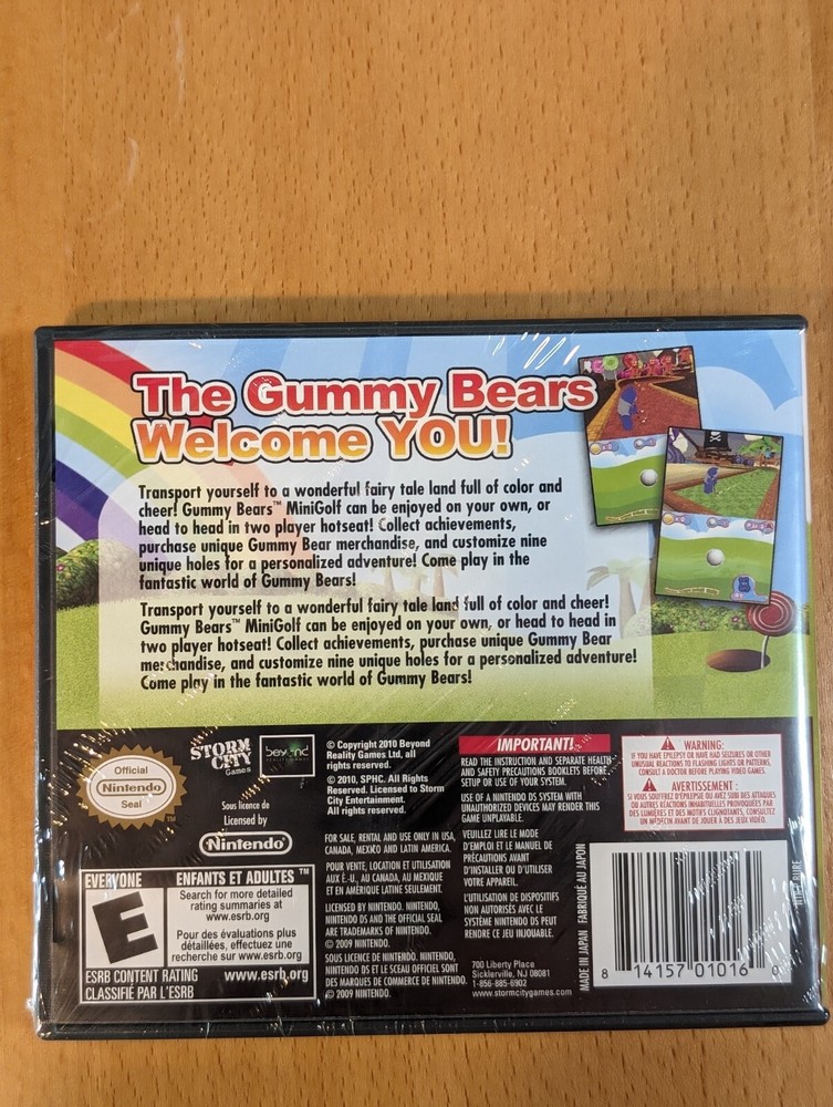 Publisher:Storm City GamesGenre:Sportsbrand:Storm City GamesCountry/Region of Manufacture:USANumber of Players:1-2Game Name:Gummy Bears MinigolfPlatform:Nintendo DSControl Elements:Gamepad/JoystickRelease Year:2010Rating:E-Everyonegtin13:0814157010160UPC:0814157010160