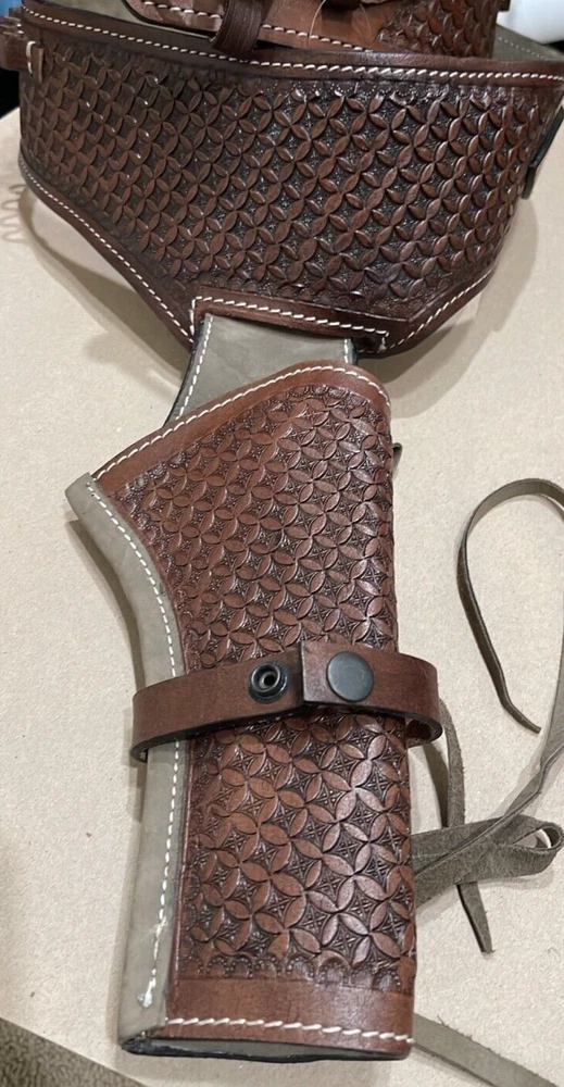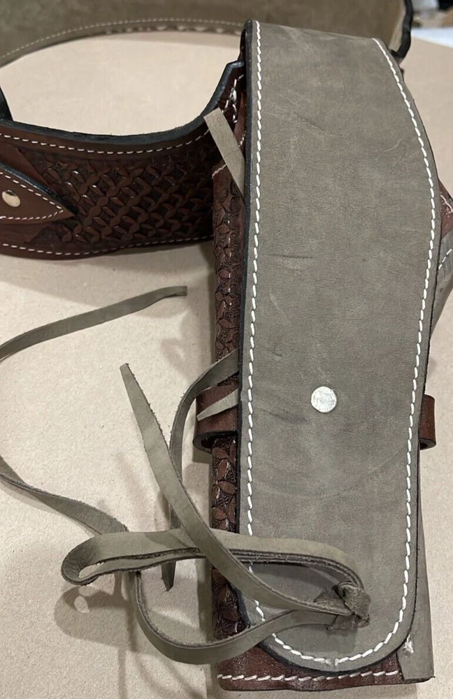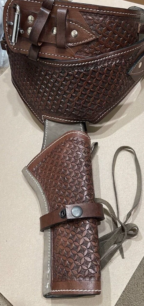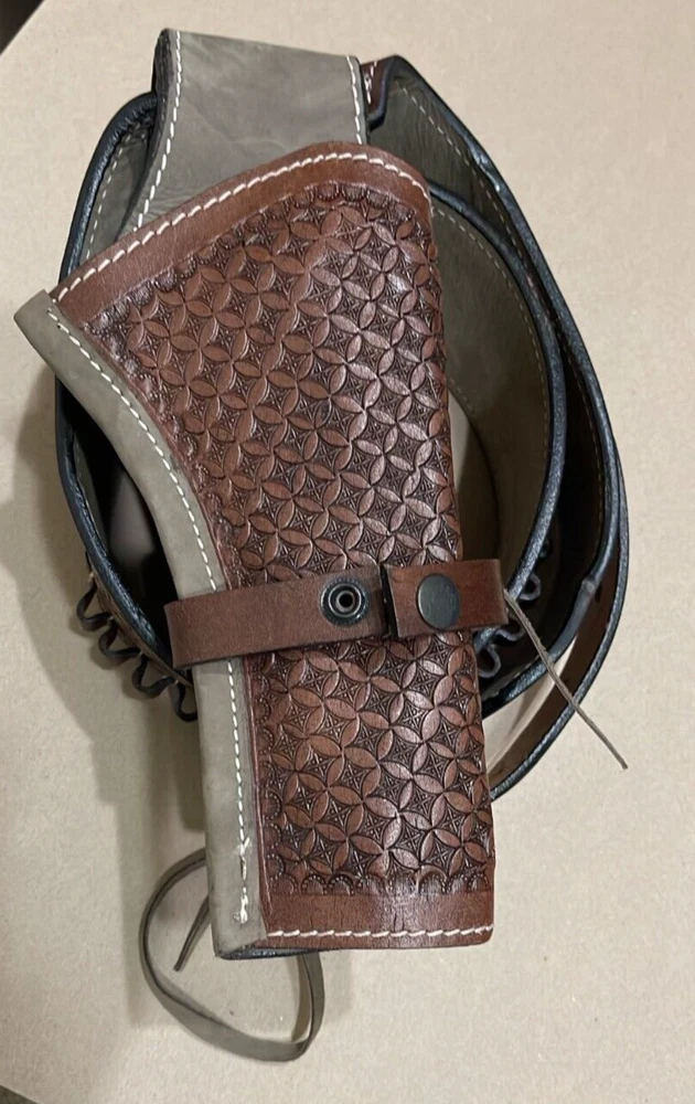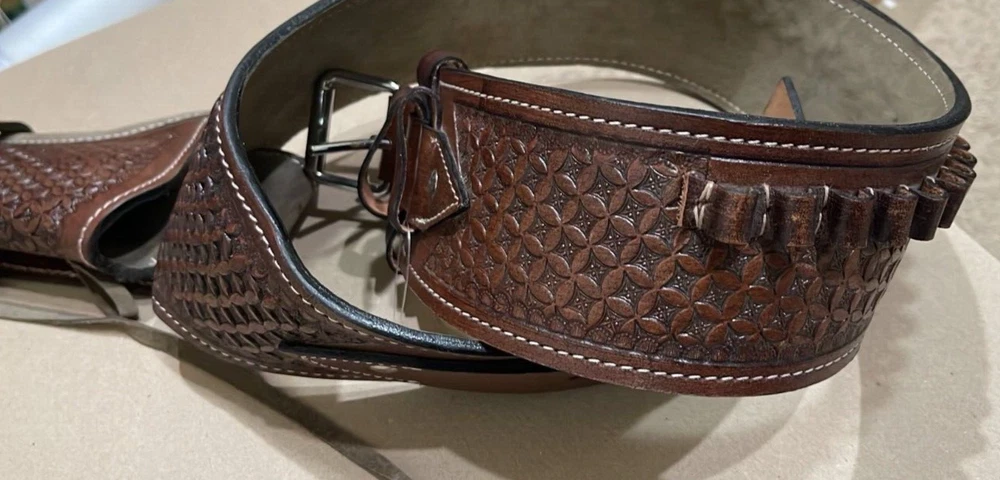 These distinctive leather pistol holster belts are ideal for daily use, hunting, ranch work, or add to your collection. Premium, real, hand-tooled leather is used to make these belts, which are crafted for a smooth draw and easy re-holstering. An incredibly stunning and amazing piece. Size 38"-40"