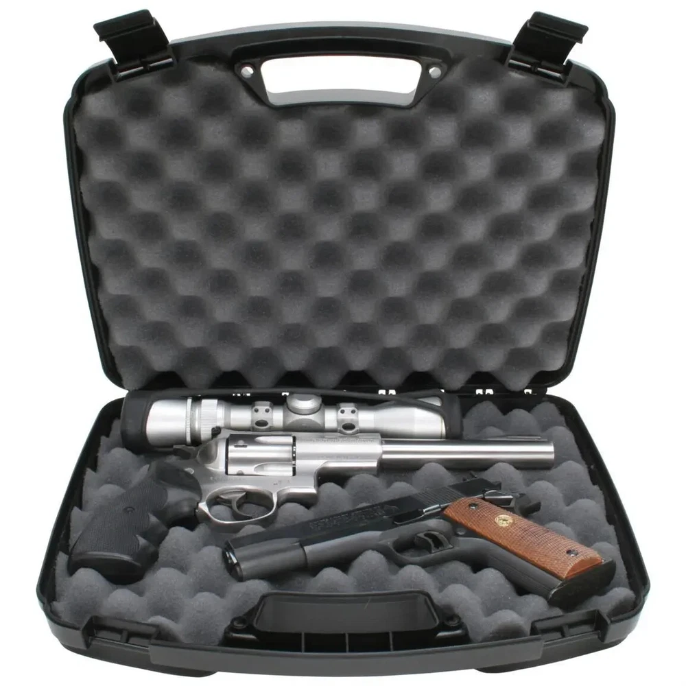 MTM Single Handgun Case for 6-Inch Revolvers (Black) Keep your firearm safe and secure with the MTM Single Handgun Case . Ideal for automatics and scoped revolvers with barrels up to 6 inches, this durable case offers excellent protection. Key Features: Outside Dimensions: 13.1" x 9.7" x 3.2"; Inside Dimensions: 12.5" x 8.1" x 3.0" For Revolvers & Automatics with 6-Inch Barrels or Less Snap Latch for secure closure Comfortable, Large Handle for easy carrying Rugged Polypropylene Construction with a textured finish for scratch resistance Thick Foam Padding for added protection Padlockable with double padlock tabs for extra security Room for Trigger Lock (not included) Family-Owned Since 1968 – MTM is known for its high-quality, innovative designs. Made to last and built for your peace of mind. Perfect for: Storing and transporting your handgun securely.