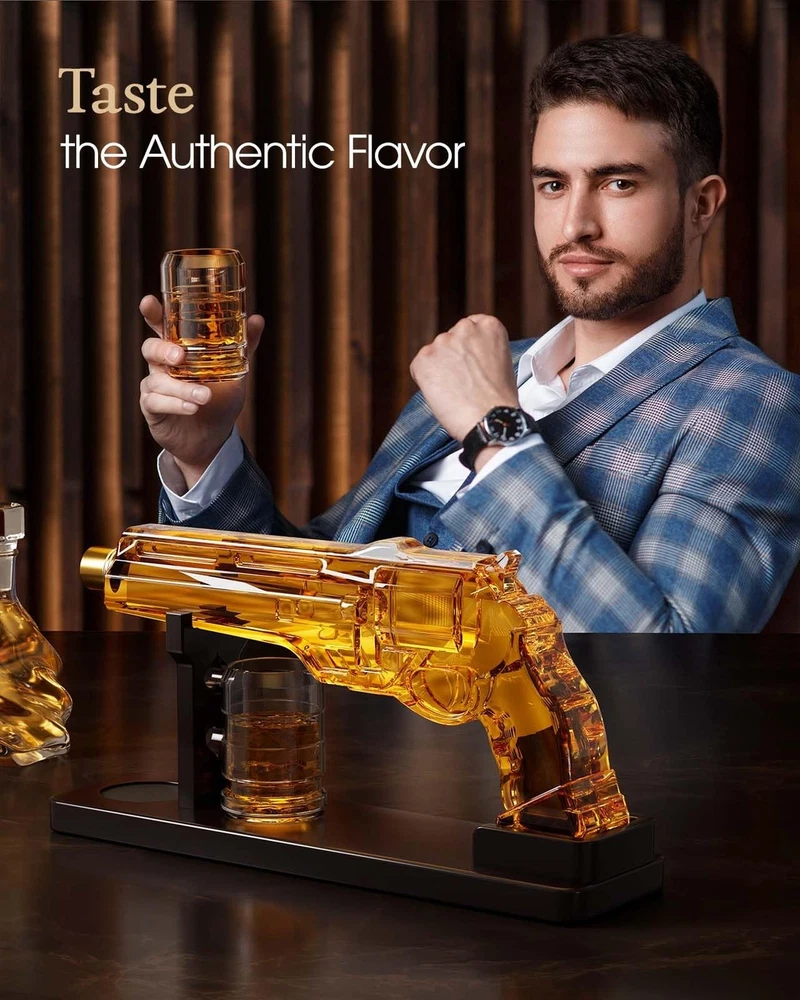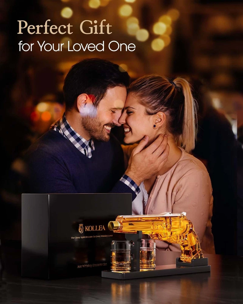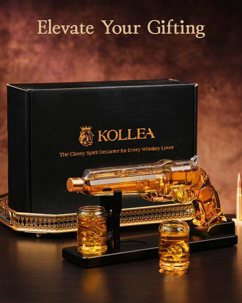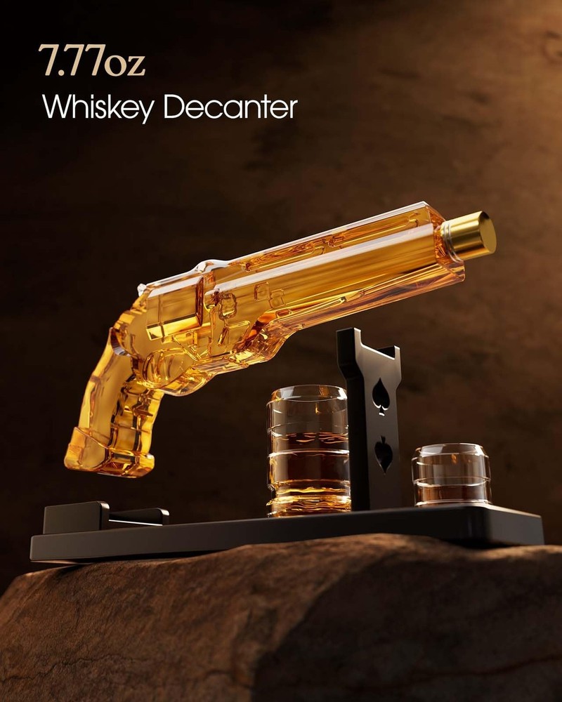 Gun Whiskey Decanter Sets for Men, Kollea Liquor Decanter Set with Gun Shot Glass, Unique Birthday Gifts for Men Dad, Cool Anniversary Christmas Gift for Him Husband, Dispenser for Bar Drinking Party Product Details Brand: Kollea Material: Glass and Wooden Display Stand Color: Clear Capacity: 230 Milliliters Special Feature: Cool Liquor Dispenser for Home Bar, For Whiskey, Liquor, Tequlia, Bourbon, Vodka, Unique Birthday Gifts for Men Dad, Whiskey Decanter Set for Men See more Brand: Kollea Material: Glass and Wooden Display Stand Color: Clear Capacity: 230 Milliliters Special Feature: Cool Liquor Dispenser for Home Bar, For Whiskey, Liquor, Tequlia, Bourbon, Vodka, Unique Birthday Gifts for Men Dad, Whiskey Decanter Set for Men Style: Military Product Dimensions: 2.95"W x 5.51"H Included Components: 1 x 7.8oz whiskey decanter,2 x 2oz cylinder shape whiskey glasses, 1 x spade A shaped wooden display stand, 1 x exquisite gift box Shape: Gun Model Name: WGS013 With Lid: Yes Number of Packs: 1 Item Weight: 2.46 pounds Manufacturer: Kollea Item model number: WGS013 Date First Available: May 31, 2023 Enhance The Flavor: The material, which is made of lead-free glass, is designed to preserve, and improve the flavor and mouthfeel of your alcoholic drinks, such as whisky, rum, bourbon, vodka, and tequila. To impart a substantial quality and provide a smoother sipping experience, this gun whiskey decanter is the ideal status-defining, worthwhile investment for whisky aficionados. Extraordinary Gift Choice: Are you still struggling to search for an impressive gift for your special someone? Well, look no more. The pistol whiskey decanter set elevates the taste of spirits while also standing out in its distinct design. The exquisitely packed gift box set is another addition, making it an ideal gift set no matter if the recipient is your dad, husband, father, brother, or even your boss. Exquisite Design: The thoughtful look of the gun liquor decanter set combined with a hollowed-Spades wooden display stand form harmony and eye-catching aesthetics. It's satisfying visual pleasure to the core. The fair elaborately designed personalized handgun decanter can serve as a complimentary beauty on the shelf or its own. Simply delight your mood when you are enjoying sipping. Hand-Made Durable Glass: Blown by hand-made craftsmanship, the 100% lead-free liquor gun decanter set with 2 glasses shows a higher clarity and rigidity, making it more durable and a better decanter to store and elevate your whiskey. The wonderful display stand matches with the food-grade gun decanter set are safe and superior for your health concerns. Perfect Capacity: This cool revolver whiskey decanter gift set is an excellent value with 2 X 2oz(60ml) cylinder shape whiskey glasses and a stunning whiskey decanter with a 7.77oz(230ml) capacity. No matter you are trying to ace in entertaining your guest or just in the mood to sip a shot alone, this stylish whiskey gun decanter with the perfect capacity will be a great option.