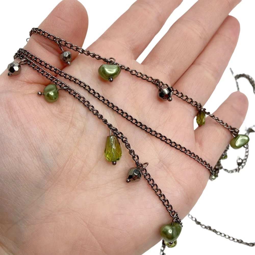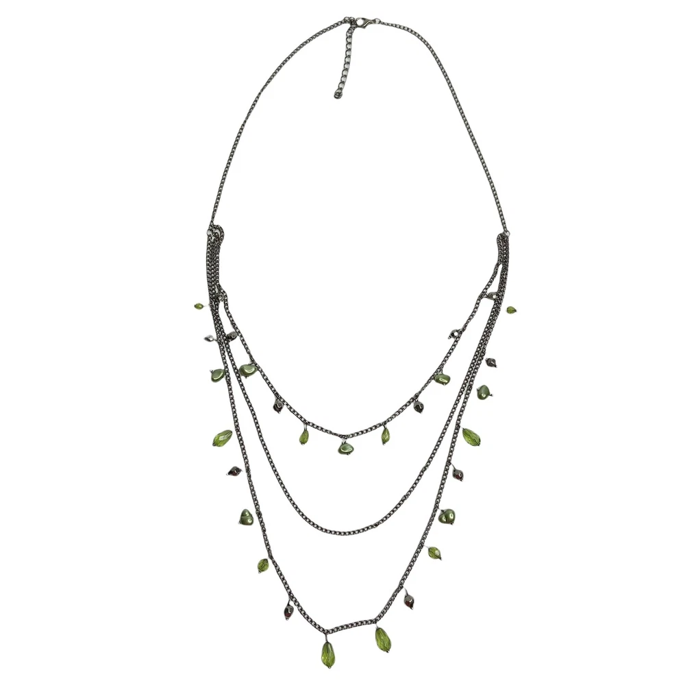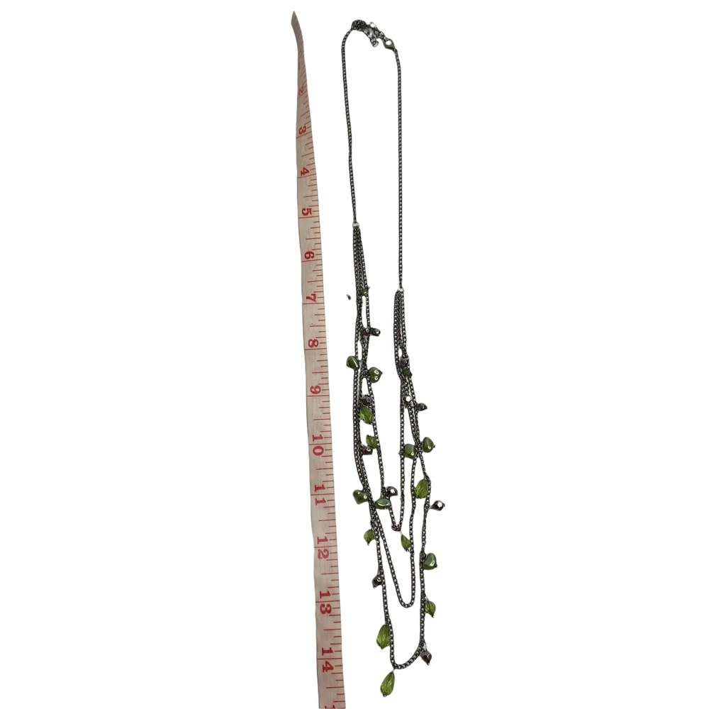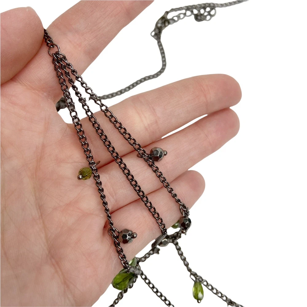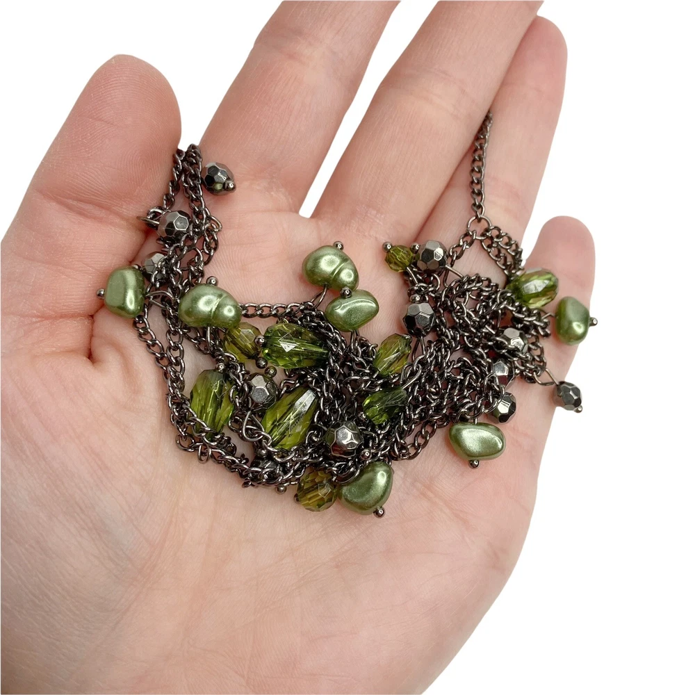 Gunmetal Gray Multi Strand Tiered Green Faux Pearl & Faceted Beaded Necklace. In good preowned condition. Gunmetal gray metal. Faceted green drop beads, gunmetal hammered round beads and green faux pearl/pebbles. Multi strands, tiered/layered. Lobster closure with an extender.