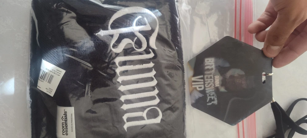 I work security and I just so happened to work the Gunna concert at the Toyota music factory in Irving. His name Gunna is stitched in white It was his personal towel he used during his performance. Never been washed. Just kept it in a bag I also have the vip badge to go with it.