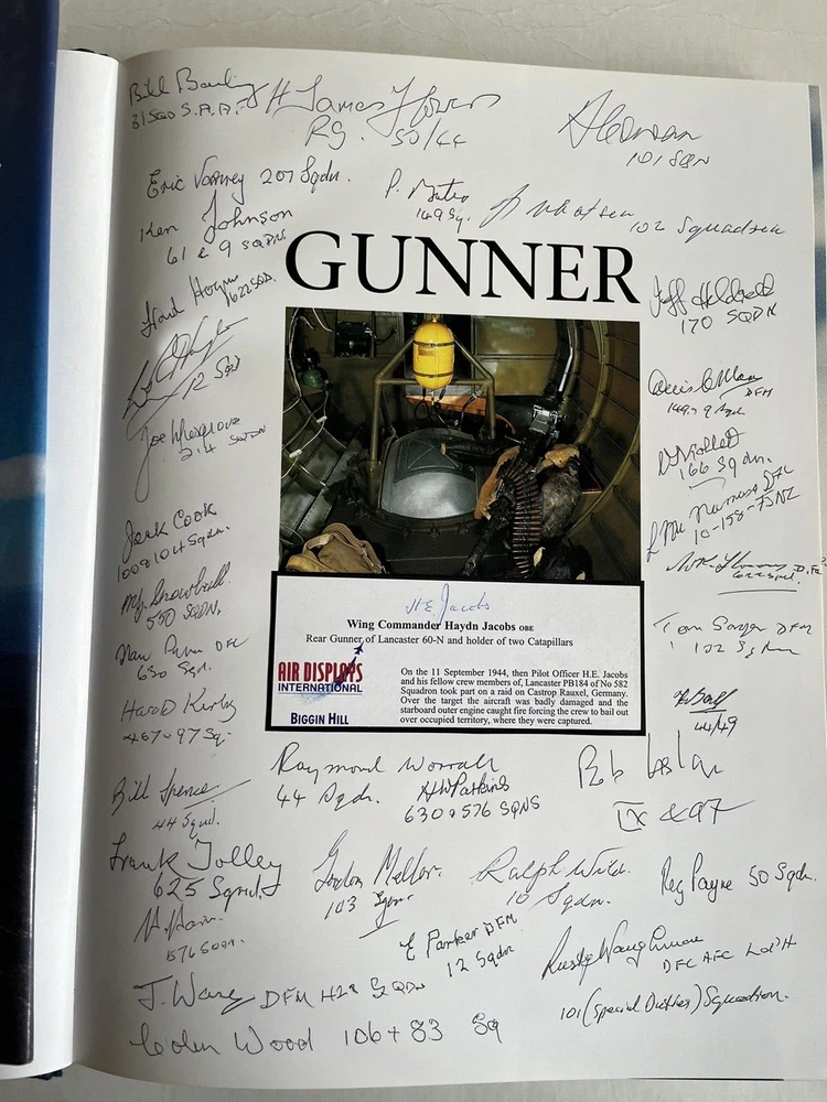 After over 40 years of collecting WW2 autographed photographs, prints and books, and having reached retirement age, we are now parting with our private collection - watch out for listings! "Gunner" by Donald Nijboer, with photographs by Das Patterson, large hard back book with dust cover published 2001, both in very good condition. "An illustrated history of World War II aircraft turrets and gun positions" This copy has been signed by the following 35 WW2 RAF Bomber Command veterans W/O Bill Bailey - 31 Sqd Flt Lt Freddie Ball DFM - 44/49 Sqd W/O Phil Bates - 149 Sqd Flt Sgt Jack Cook - 100/104 Sqd Sqd Ldr Alex Cowan - 101 Sqd W/O James Flowers - 50/44 Sqd Flt Lt Harry Harris DFC - 576/608 Sqd W/O Jeff Hildreth - 170 Sqd Flt Lt Frank Hogan - 622 Sqd Flt Lt Bob Hughes DFC AE - 149/50/23/12 Sqd Flt Sgt Jim Ibbotson - 102 Sqd Wg Cmdr Haydn Jacobs OBE - 582 Sqd (matted signature) W/O Ken Johnson - 61/9 Sqd W/O Harold Kirby - 467/97 Sqd Flt Lt Bob Lasham DFC* - 9/97 Sqd Flt Lt Len McNamara DFC Ld'H - 10/158/75 Sqd W/O Dennis Mason DFM - 9 Sqd Flt Lt Gordon Mellor - 103 Sqd W/O Joe Musgrove - 214 Sqd W/O Eric Parker DFM - 12 Sqd W/O Harry Parkins - 630/576 Sqd Flt Lt Alan Payne DFC - 630 Sqd W/O Reg Payne - 50 Sqd F/O Tom Sayer DFM - 102 Sqd W/O Maurice Snowball - 550 Sqd Flt Lt Bill Spence - 44 Sqd Flt Lt Ken Thomas DFC - 622 Sqd W/O Frank Tolley - 625 Sqd Flt Sgt Eric Varney - 207 Sqd W/O Bill Viollett - 166 Sqd F/O Jack Warner DFM - 428 Sqd Flt Lt Rusty Waughman DFC - 101 Sqd F/O Ralph Wild - 10 Sqd W/O Colin Wood - 106/83 Sqd F/O Ray Worrall - 44 Sqd
