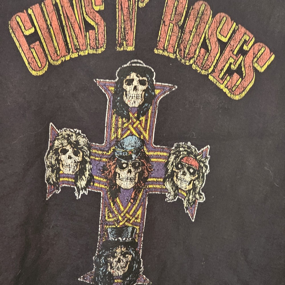 The Guns N' Roses Appetite for Destruction Cross Logo Sweatshirt in size M is a stylish and comfortable pullover sweatshirt designed for unisex adults. Featuring the iconic Guns N' Roses brand logo, this black sweatshirt has long sleeves and a crew neckline, making it a versatile and classic piece for any wardrobe. Perfect for fans of the band or anyone looking for a fashionable and high-quality sweatshirt to add to their collection. Tags are missing to check measurements for size.. either medium or large. See photos for wear sold as is