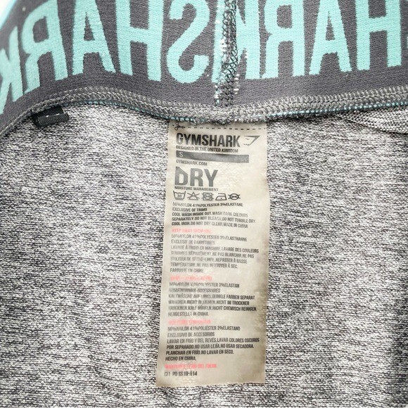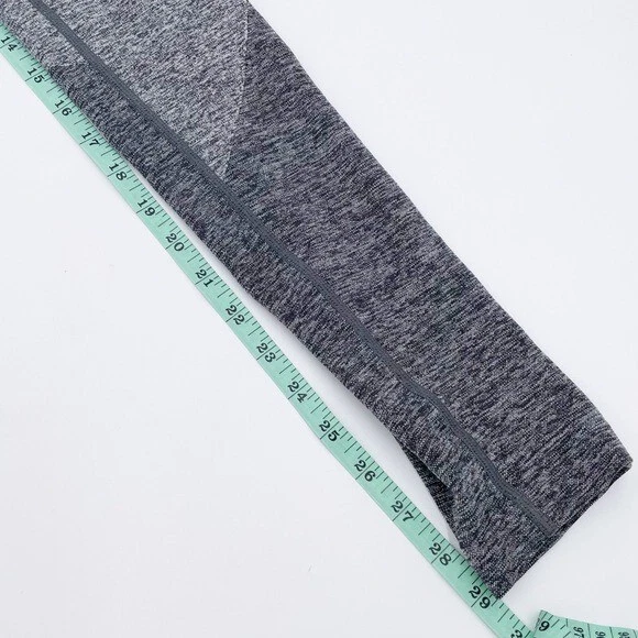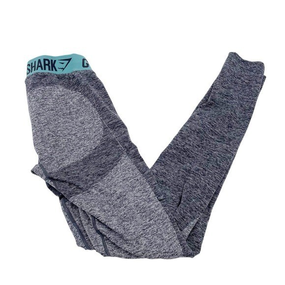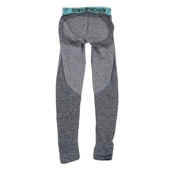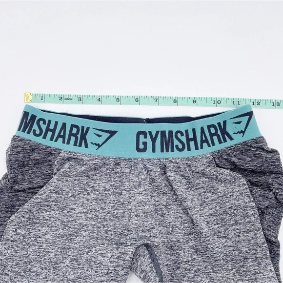 Gymshark Flex Leggings Charcoal Marl/Dusky Teal Dry - moisture management Seamless knit Elasticated performance waistband Physique contouring design Full length Size Small Great pre-owned condition Small snag on waistband - see photos Approximate measurements laying flat: Waist: 11.5" across Rise: 6" Inseam: 29"
