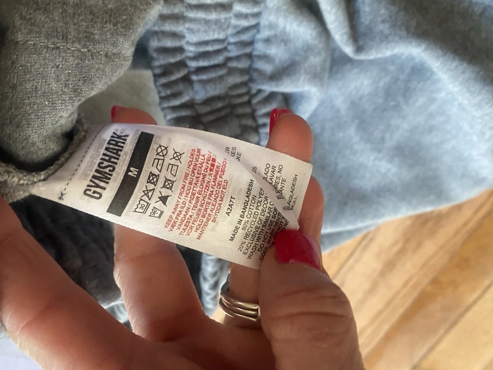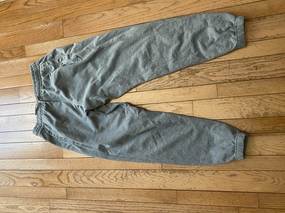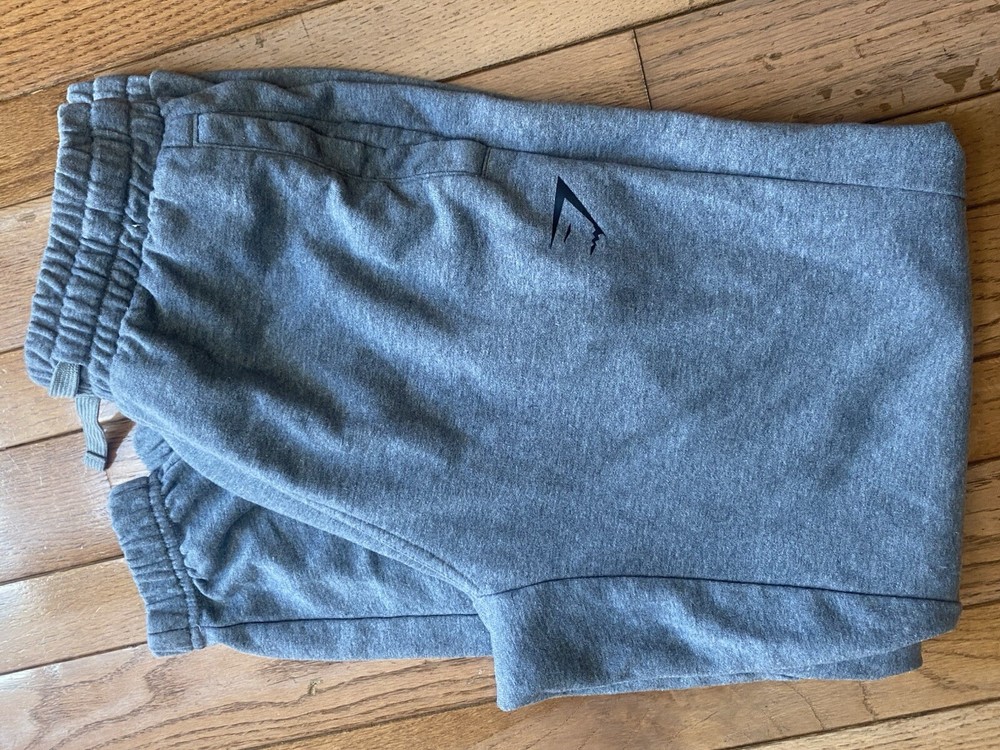 These Gymshark sweatpants are men's size medium in gray. They feature a drawstring closure and are made of a polyester, cotton, and cotton blend fabric. The sweatpants have a blended fabric type and a 30-inch inseam. They are suitable for activities like gym training, cross-training, and running, with an athletic fit for a comfortable workout experience.30" waist 30" inseam super comfortable