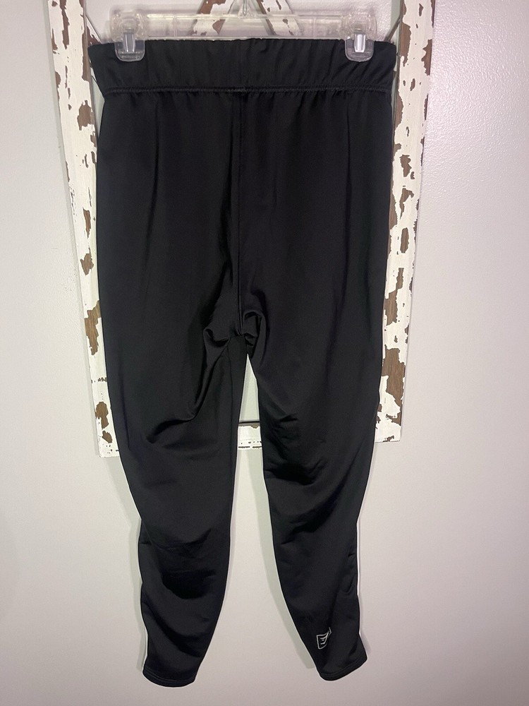 The Gymshark Recess Joggers in black, size small, feature a solid pattern with a tapered leg style and a slim fit. These activewear pants have a pull-on closure with a fold-over waistband that is adjustable for a comfortable fit. Made from a polyester blend, these joggers have elastic waist and pockets, perfect for activities like gym training, walking, CrossFit, and running. The high-rise waist provides compression in the waist area, making them ideal for various physical activities.