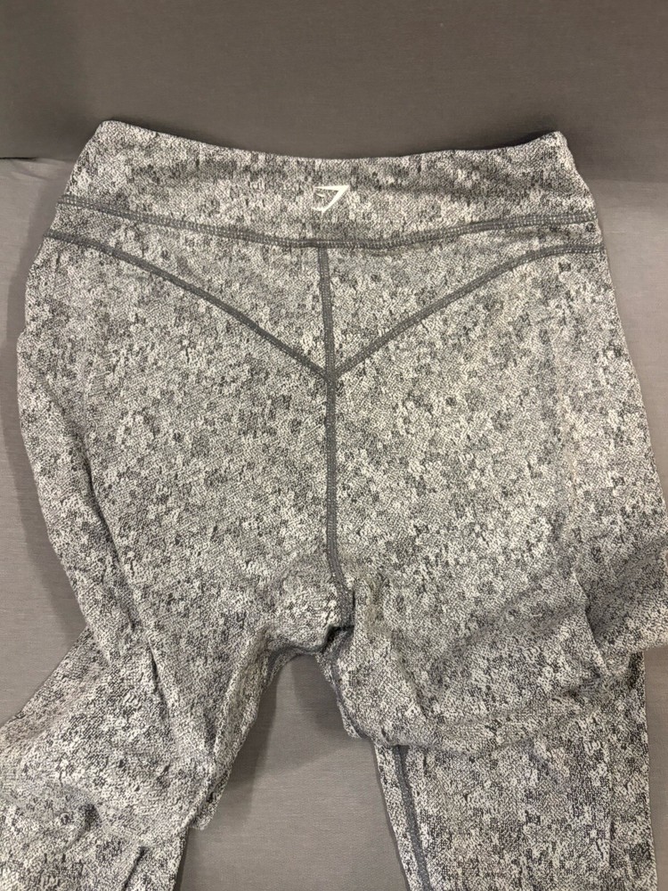 These Gymshark women's leggings in size medium are designed for activewear workouts. They are gray in color, made of a blended fabric, and feature an elastic waist and stretch material for comfort. The leggings have a skinny ankle fit and are suitable for various activities like running, weightlifting, yoga, and more. The Gymshark logo adds a touch of athleisure style to the design. No signs of wear- like new- no pilling