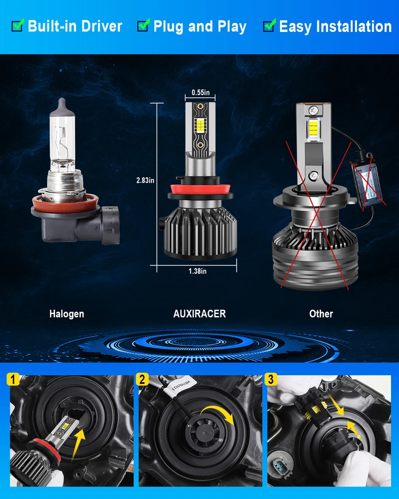 Specifications: Bulb Size : H11, H9, H16, H8 Usage : High Beam or Low Beam or Fog Light Package includes : 2 Bulbs Voltage : DC 9-16V Light Power : 100W/set (50W/bulb) Luminous Flux : 36000LM/set (18000LM/bulb) Color Temperature : 6,000K Xenon White Lifespan : Over 30,000 hours Certification : IP67 Waterproof, CE, RoHS NOTICE: 1. This product is polarized, with positive (+) and negative (−) symbols on the plugs. If it doesn't work, try reversing the plug and inserting it again. 2. Our LEDs are designed to replace halogen bulbs only and will not fit vehicles with factory LEDs or HIDs. Features SUPER BRIGHT : 100W, 36000LM per pair with stronger, more concentrated light output, 600% brighter than the original halogen bulbs, allowing you to see more clearly when driving at night. OPTIMAL BEAM PATTERN : Our LEDs have the same beam pattern as the halogen bulbs with a clear cut off line, without any dark spots or shadow areas and no glare to oncoming traffic. 5 - M INUTE INSTALLATION : All-in-one design, bulid-in driver for taking up less space in housing, no bulky external driver, no extended bulb base, no more modification on housing or cover. Real plug and play, smoothly fits into vehicle's housing and factory sockets even with limited space in original housing. LONG LIFESPAN : The efficient cooling system with integral aerospace aluminum body, unique hollow engraved heat sink design and smart IC ensures a longer life for the LED conversion kit. NOTE: 1. Our LEDs replace halogen only, they don’t fit your vehicle with factory LEDs and HIDs. 2. Fitment Compatibility may not be 100% accurate, if you are not sure which bulb size you need, please check your vehicle manual or stock bulb model. 3. LED bulb is low power device, the following issues may occur if you want to use LED bulb on some European vehicles: Hyper Flashing, No Flashing, or Error Code. Those are NOT problems of LED bulb and NOT covered by warranty. You may simply add a set of load resistor (NOT included) to avoid those issues. It can be solved with a decoder (decoder must be purchased separately). Payment Shipping Return Contact us FAQ Payment 1. We gladly accepts payment via PayPal, We will ship your item(s) within 24 hours. 2. Before payment, please keep the consistency of Paypal address and ebay address. 3. Quantity orders are welcome. Shipping 1. All items will be shipped in 24 hours after receiving your payment. 2. We ship this item to US only via USPS or UPS. It usually takes 3-6 working days for delivery. Return 1. We offer a 30 days return policy. Please contact us within 30 days of receiving your order if you have any issues about the product or would like to return it. Refunds will be sent after we receive your returned package. 2. All returned items should be in the original packaging, return tracking information should be provided. 3. Buyer is responsible for return shipping cost due to the problem not caused by item quality itself . Contact us 1. We maintain high standards of excellenceand strive for 100% customer satisfaction. If you have any questions, please feel free to contact us. 2. Negative feedback won't help solve any issues, please contact us via eBay messages before leaving negative feedback. The customer service will make every effort to help you solve your issues. 3. Feedback is very important to us. We request that you contact us immediately before giving us neutral or negative feedback so that we can address your concern satisfactorily. FAQ Q1: Will this bulb fit my vehicle? A: We can match almost any vehicle to one of our bulb sizes. eBay only lets us include some vehicle fitments per listing, but if your vehicle does not show up on the compatibility table at the top of our listings, welcome you to contact us for free consulation before purchasing a product. Q2: My item has not arrived, what's taking so long? A: Sometimes items take longer than expected, especially if it’s going far or to rural area. Check with your post office to see if your item has been held up. Sometimes USPS will not update a tracking number until it has arrived at its destination. If your item still has not arrived after a few days, let us know so we can double check for you and help solve it asap. Q3: Do I need to mention the Year, Make and Model in the notes when place order? A: YES. Please include the Year, Make, and Model in the notes section during checkout to ensure you receive everything needed for your kit! Q4: My bulbs won't fit, help! A: Special bulb holder may be required. See if you can take the holder from the stock bulb. If not, let us know. The bulb size may be wrong, double check the item you received with the item you ordered. Do you have an aftermarket lighting housing? These may not be perfectly fitted for aftermarket bulbs and will require some manual modifications. Q5: Neither side lighting up? Both sides flicker, flash, or work inconsistantly. A:Check the headlight fuses, and then check the ballast plugs to insure correct installation. If this doesn't work, there may be a voltage problem with the vehicle. You probably just need a relay or capacitor (decoder must be purchased separately). Q6: WARNING ABOUT POLARITY Unlike halogen bulbs, LED are polarity sensitive. BEFORE you start your LED kit installation, verify the polarity on your vehicle by simply plugging the LED bulb into your vehicle socket. - if your light turns on, please proceed to install both bulbs onto your vehicle. - if your light DOES NOT turn on, disconnect the bulb and flip the socket in order to reverse the polarity (this will not damage your vehicle electrical system in any way). Once you made sure the LED bulb turns on, please proceed to install both bulbs onto your vehicle. Note: There is no convention when it comes to polarity. Different car manufactures have different polarity setup, even within the car model the polarity setup on your low beams and high beams might be different. On Nov 20, 2024 at 09:07:06 PST, seller added th