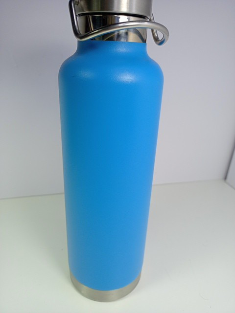 This looks like it was never used. The inside is clean with no water spots. The outside has no scratches. There was a Christmas sticker on the bottom. It may have been a gift. Beautiful turquoise blue unlike the photo. Textured surface for easy grip. Stainless Steel lining and top. 24 ounces.