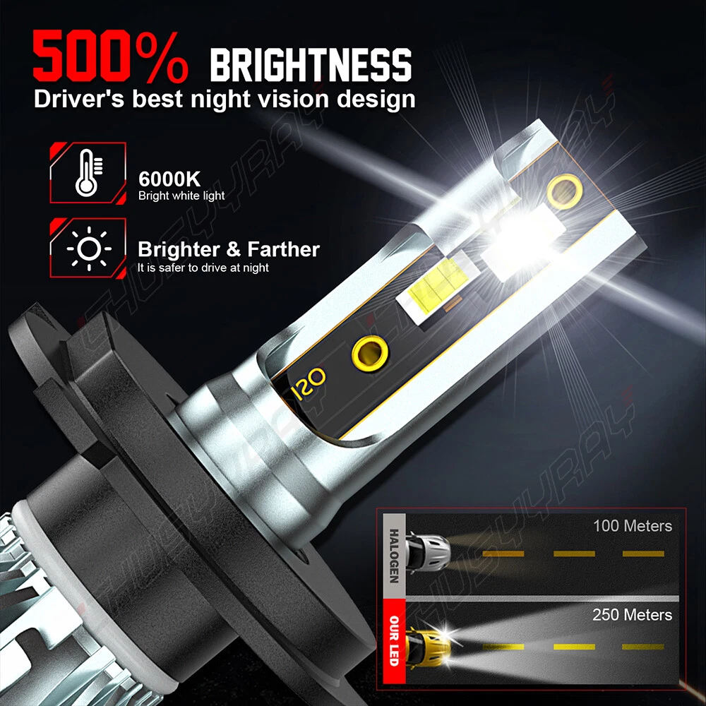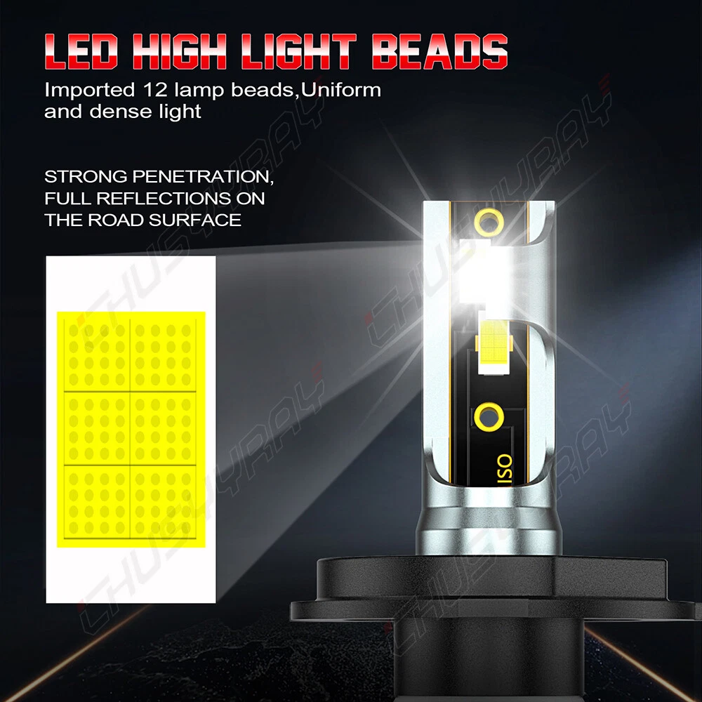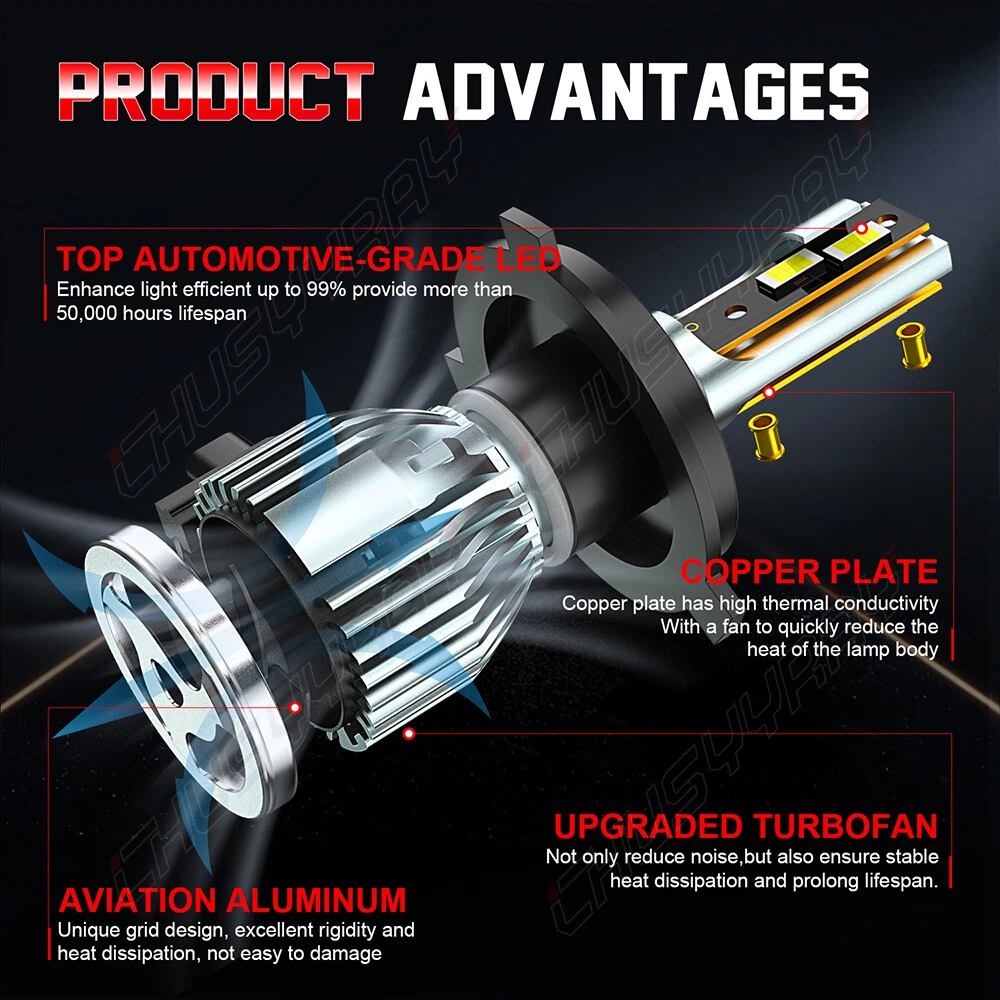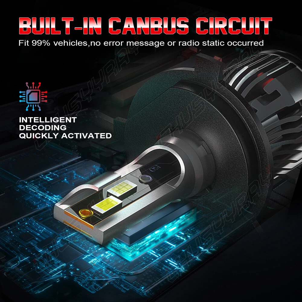 Product Description The compatible vehicle lists is only partial lists,no fully included due o Ebay listing compatible vehicles limitation. IF your car Socket type is 9003 H4,the item is fit your car F5 series LED Headlight Compatible With: 9003 H4 Application: High/Low Beam Headlights Light source: 3570 CSP Chips Color temperature: 6000K white Appearance: gun color + red bottom Decoder: External Number of Bulbs: 2 Voltage: Fit 9V-30V Vehicle IP Rate: IP67 WaterProof Beam Angle: 360° Built-In Cooling Fans ,Smart Efficient Cooling System Fast Heat Dissipation High quality Aluminum heat dissipation ensures the secure temperature range Operating Life: >50000hrs Operating Temperature: -40 - +80°C Placement on Vehicle: Left,Right,Front CANBUS ERROR FREE: No. For some vehicles, it may require install decoder or load resistor to avoid turn signal hyper flash or fast blinking. Please Note: Please check your car manual or original bulb to confirm the bulb size, length is correct or not before purchasing to save your time. Package Content:2 x High Power LED Headlights Bulbs (The box is sent randomly) LED headlamps advantages: Energy saving, environmental protection, Stable performance, through strict test, Use safer driving in the car. LED lights than traditional halogen energy, more power. The LED lights light up without delay, to enhance road safety. Instant start no strong currents impact , effectively protecting the car comes with a battery , improving battery life of more than 30%.