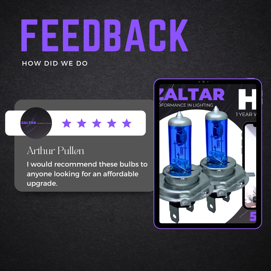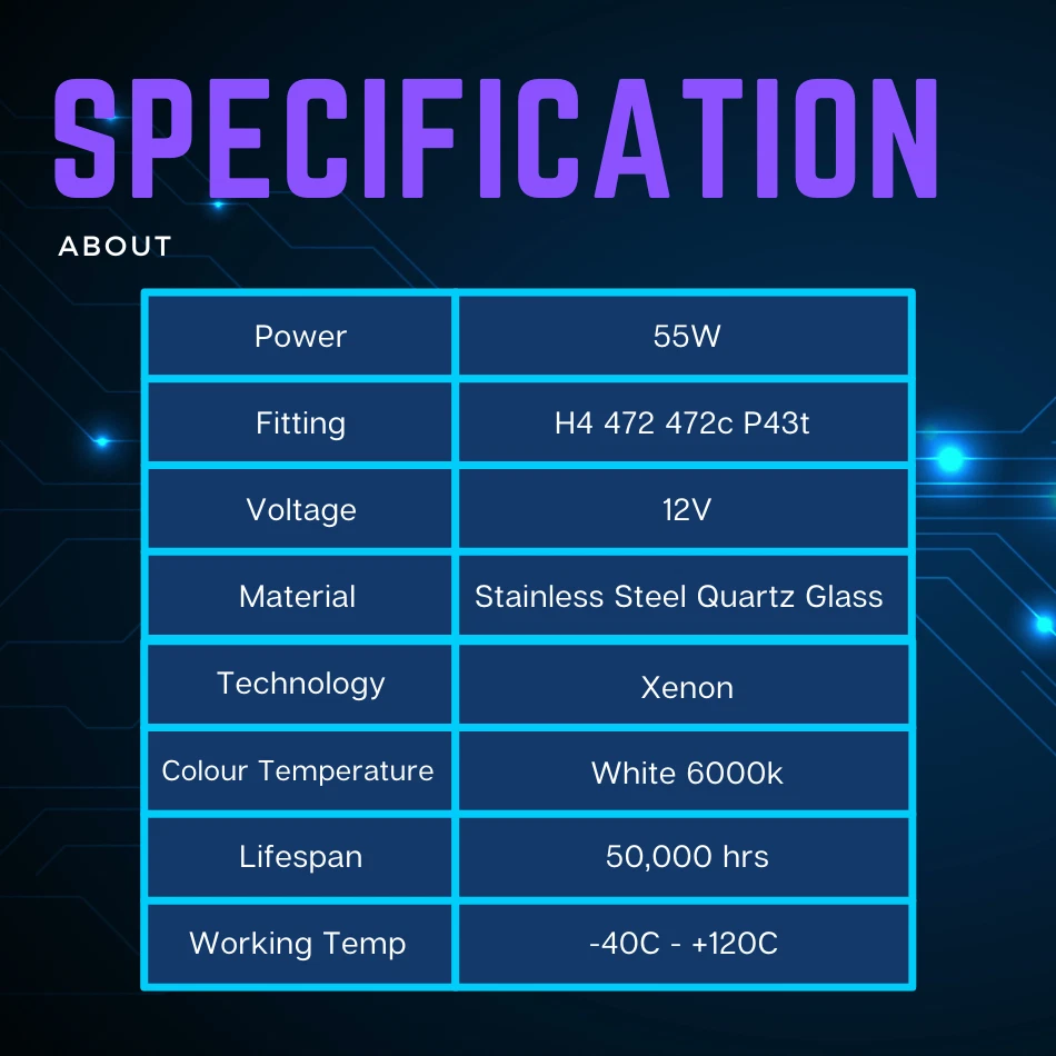 H4 Xenon White Headlight 55w Halogen Bulbs Car 472 Bright High Low Beam Bulb 12v This product data sheet is originally written in English. Home FAQ's Feedback Bookmark Us Contact Us Browse our Store H4 Xenon White Headlight 55w Halogen Bulbs Car 472 Bright High Low Beam Bulb 12v See reviews below No product reviews yet Your browser does not support the video tag. Overview Headlight bulb type: H4 Technology: Xenon Specifics: Halogen Upgrade Bulbs Wattage: 55w Voltage: 12v Guarantee: 12 months Description 1 Year warranty. Argo's H4 xenon bulbs are an ideal choice for enhancing your lights. With their intense light output and ultimate power, they provide a significant upgrade to your car's lighting system. These bulbs offer increased visibility on the road, making them a perfect choice for drivers looking to improve their driving experience. The xenon gas allows the bulbs to burn considerably brighter than standard halogen bulbs. Colour temperature up to 6000k 360° light beam pattern 50,000+ hours lifespan Plug & play fit Fitting guide: Gloves to be worn at all times, moisture transferred to the glass will cause the bulb to fuse prematurely. Compatibility**Please check your existing bulb fitting currently in place to ensure these are a suitable replacement, whilst every effort is made to ensure accuracy, bulb fitments can change. A few moments to double check will prevent an incorrect part being ordered - if in doubt please get in touch** Reviews H4 Xenon White Headlight 55w Halogen Bulbs Car 472 Bright High Low Beam Bulb 12v View more Close H4 Xenon White Headlight 55w Halogen Bulbs Car 472 Bright High Low Beam Bulb 12v This product has no reviews yet, however see what our buyers say about our other products... View more Close This product has no reviews yet, however see what our buyers say about our other products... Content © Copyright zaltar-autos. All rights reserved. Powered by Argo's H4 xenon bulbs are an ideal choice for enhancing your lights. With their intense light output and ultimate power, they provide a significant upgrade to your car's lighting system. These bulbs offer increased visibility on the road, making them a perfect choice for drivers looking to improve their driving experience. The xenon gas allows the bulbs to burn considerably brighter than standard halogen bulbs. Fitting guide: Gloves to be worn at all times, moisture transferred to the glass will cause the bulb to fuse prematurely. Compatibility**Please check your existing bulb fitting currently in place to ensure these are a suitable replacement, whilst every effort is made to ensure accuracy, bulb fitments can change. A few moments to double check will prevent an incorrect part being Beam Angle Spotlight Brand Argo Bulb Fitment Code H4 Bulb tech Xenon Bulb Type Headlight Features Performance Bulb Upgrade Guarantee 12 months Headlight bulb type H4 Light Colour Cold White Lighting Technology Xenon Manufacturer Part Number 333531035485 Number of Bulbs 2 Other bulb specifics 472 472C P43T Other part number **Please Check Your Fitment** Placement on Vehicle Front Placement on Vehicle Left Placement on Vehicle Right Purpose Main High Dipped Low Beam Reference OE/OEM Number Dipped Main High Low Beam Reference OE/OEM Number 3 Pin P43t Halogen Bulbs Reference OE/OEM Number Headlamp Foglight Van Reference OE/OEM Number Headlamps Halogen Upgrade 12v Specifics Halogen Upgrade Bulbs Suitable For Headlight Suitable For High Beam Suitable For Low Beam Technology Xenon To Fit Headlight Type Xenon Look Voltage 12v Wattage 55w