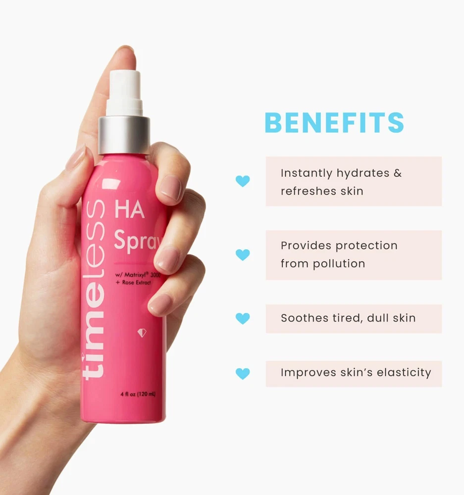 The perfect complement to your skin, our spray is instantly absorbed to give tired, dull and dry skin a much-needed boost. This lighter version of our popular hyaluronic acid includes Matrixyl 3000 and aloe barbadensis. Instantly hydrates and refreshes skin Provides protection from the environment Helps refresh your makeup during the day Aloe and cucumber help soothe, calm, and refresh the skin can also be used as a makeup finishing spray Infused with refreshing cucumber to awaken the senses, this is a favorite for spring.