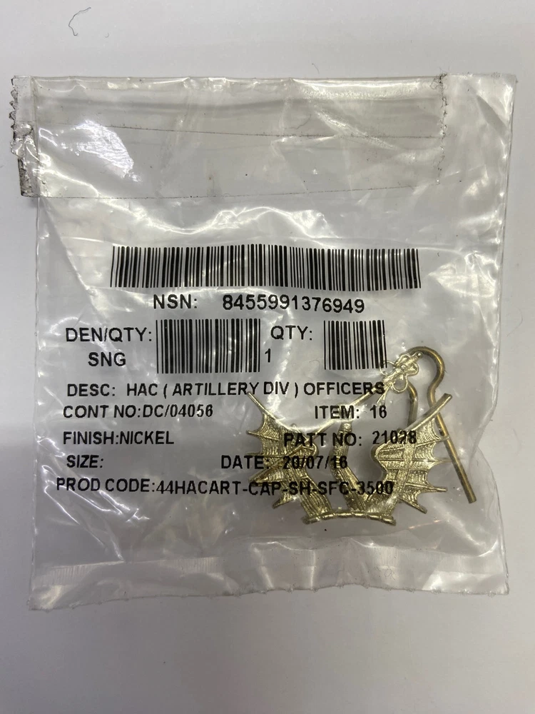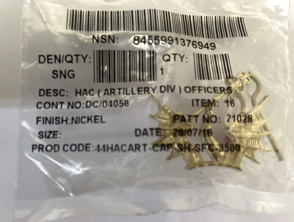 Genuine British Army HAC Honorable Artillery Company (Artillery Division) Officers Issue Beret Hat Badge - NEW Genuine issue regulation HAC Officers metal beret cap / hat badge Great for customization, costumes or collectors Condition: NEW (unissued) Please note the hat badge comes with a split pin although they seem to be slightly too short as seen in the photos. Please contact me for any further information. Thanks for looking Genuine British Army HAC Honorable Artillery Company (Artillery Division) Officers Issue Beret Hat Badge - NEW Genuine issue regulation HAC Officers metal beret cap / hat badge Great for customization, costumes or collectors Condition: NEW (unissued) Please note the hat badge comes with a split pin although they seem to be slightly too short as seen in the photos. Please contact me for any further information. Thanks for looking Genuine British Army HAC Honorable Artillery Company (Artillery Division) Officers Issue Beret Hat Badge - NEW Genuine issue regulation HAC Officers metal beret cap / hat badge Great for customization, costumes or collectors Condition: NEW (unissued) Please note the hat badge comes with a split pin although they seem to be slightly too short as seen in the photos. Please contact me for any further information. Thanks for looking Genuine British Army HAC Honorable Artillery Company (Artillery Division) Officers Issue Beret Hat Badge - NEW Genuine issue regulation HAC Officers metal beret cap / hat badge Great for customization, costumes or collectors Condition: NEW (unissued) Please note the hat badge comes with a split pin although they seem to be slightly too short as seen in the photos. Please contact me for any further information. Thanks for looking