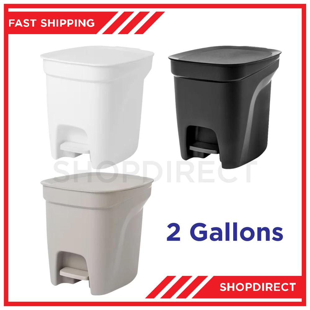 HACKSAX Step Trash Can w/t Lid Black, Gray White 2 Gallon Kitchen Sink Waste Bin The pedal bin is easy to move since it has a grip-friendly overhang on the back. Available in three colors: Black, Gray, & White Product details The size of the bins inside is perfect for things that you want to empty often or that take up less space, such as cans and small packaging If you use plastic bags in the bins, you can hide excess plastic in the handles. A good place for waste sorting is in the kitchen, and as close to the sink as possible since it helps you avoid spills. This is also where most waste is generated. Material Bin/ Lid/ Pedal/ Lock: Polypropylene Fitting: Steel, Galvanized Measurements Height: 9 ¾ " Volume: 2 gallons Width: 10 " Depth: 8 ¼ " Weight: 1 lb 5 oz