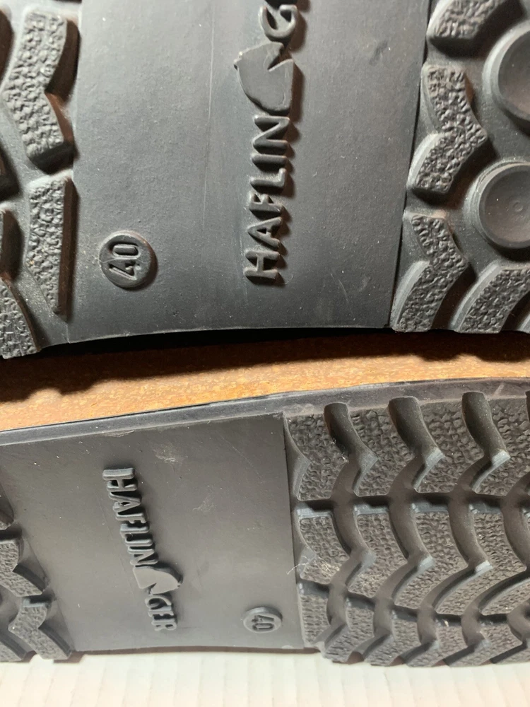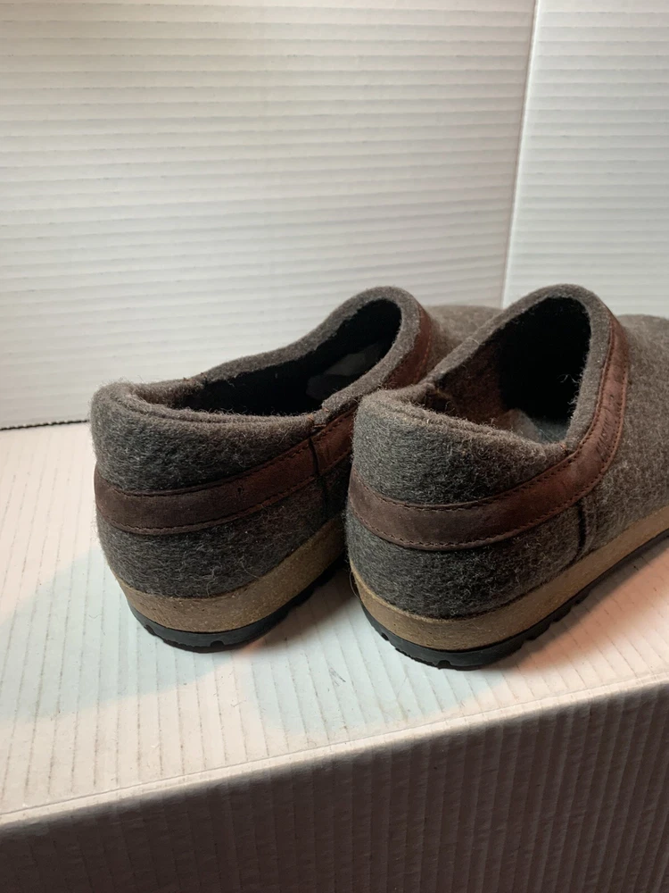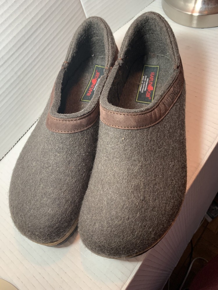 These are HAFLINGER German women's shoes in size 9, made of 100% virgin wool. They are slip-on clogs with a round toe shape and a flat heel style. The upper material is wool and the lining and insole materials are also wool. The outsole is made of suede. These shoes are designed for comfort and support, with arch support and a non-slip sole. They are suitable for travel, casual wear, and workwear. The shoes have a classic design and are available in brown blend.