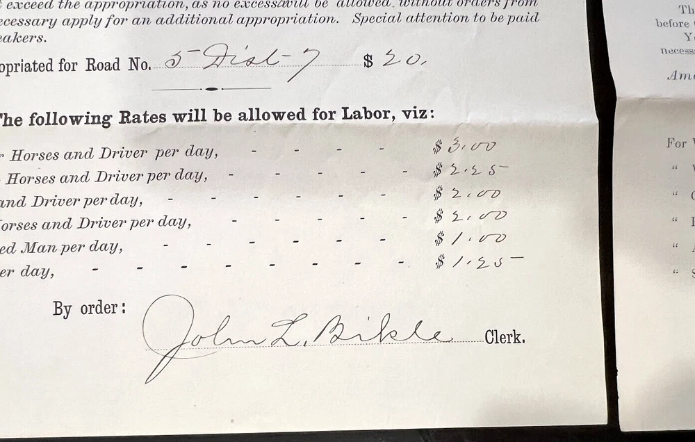 Here’s a Pair of Official 1880’s Documents Signed by the “OFFICE OF THE COUNTY COMMISSIONERS” OF WASHINGTON COUNTY, MARYLAND <> ONE OF THE DOCUMENTS IS SIGNED BY HAGERSTOWN POLITICO JOHN LUTHER BIKLE (1847 - 1904) LEADING and MOST HIGHLY RESPECTED 19 th CENTURY CITIZEN OF WASHINGTON COUNTY, MARYLAND, BANKER & FINANCIER - CASHIER OF THE HAGERSTOWN BANK, APPOINTED IN 1883, CLERK OF THE BOARD OF COUNTY COMMISSIONERS 1870-1880s, ESSENTIAL TO THE BOARD FOR THE ADMINISTRATION OF THE AFFAIRS OF WASHINGTON COUNTY, and MANAGING THE CONSTRUCTION OF THE BELLEVUE ASYLUM DURING HIS TERM OF OFFICE, APPOINTED A MEMBER OF THE BOARD OF STREET COMMISSIONERS BY MAYOR KEEDY 1898-1901, MANAGING THE CONSTRUCTION OF THE HAGERSTOWN ~&~ DEACON OF ST. JOHN’S CHURCH, and SUPERINTENDENT OF THE SUNDAY SCHOOL FOR 25 YEARS. Bikle was an ardent member of the Republican Party, although only once was he a candidate for an elective office. That was in 1879, when he was nominated for Register of Wills. He was not an aspirant for the nomination and accepted it with reluctance. He was defeated. The documents measure 8 ½” x 14” and are in very fine condition. BIOGRAPHICAL NOTES: <> JOHN L. BIKLE DIES AT DANSVILLE, N.Y. Cashier of the Hagerstown Bank Succumbs to General Break Down While Undergoing Treatment at Jackson Health Resort, Aged 57 Years. John L. Bikle , cashier of the Hagerstown Bank, and one of the leading and most highly respected citizens of Washington County, died about 8 o'clock Sunday evening at the Jackson Health Resort, Dansville, N.Y. Death was due to a general breakdown of the system. He had been under treatment at Dansville since the middle of May. Friday evening there was a change for the worse in his condition and he gradually grew weaker. A telegram received in Hagerstown on Sunday stated he was sinking. He slept away. Gathered about his bed at the time were his devoted wife and his two sons, Rev. Charles G. Bikle, of Dansville, and E. Blaine Bikle, of Hagerstown. The latter left Baltimore Saturday evening for Dansville and reached there in time to see his father alive. John L. Bikle was born at Smithsburg, this county, February 21, 1847, being a son of Christian and Barbara Bikle. He received his education in the schools at Smithsburg and afterward taught school. About 1872 he moved to Hagerstown and engaged in the grocery business. While conducting this store, he was appointed a deputy clerk in the office of the county tax collector. He was afterward appointed clerk to the Board of County Commissioners. During his term in office, Bellevue Asylum was built. On January 31, 1883, Mr. Bikle entered the Hagerstown Bank as bookkeeper. From that position he was promoted to teller, and when Edward W. Mealey resigned as cashier to take charge of the finances of the Crawford Bicycle Company Mr. Bikle was made cashier. As a bank official Mr. Bikle was held in the highest esteem, not only by the patrons of the institution with which he was connected, but by all bankers with whom he came in contact. Mr. Bikle was an ardent Republican, although only once was he a candidate for an elective office. That was in 1879, when he was nominated for register of wills. He was not an aspirant for the nomination and accepted it with reluctance. He was defeated. In 1898 he was appointed a member of the Board of Street Commissioners by Mayor Keedy to succeed Daniel W. Reichard. He served out his term of three years with credit to himself and to the city. It was during his term that the city light plant was built. While not one of those who advocated the city spending $65,000 in the erection of a lighting plant when the time came to establish the system Mr. Bikle did his duty unflinchingly. Mr. Bikle was a member of and an officer in St. Johns Lutheran Church, being a deacon at the time of his death. For nearly 25 years he was superintendent of the Sunday School. He took a deep and active interest in church work and gave liberally toward its support. He was also a member of the following fraternal organizations, having filled the highest offices in the local branches of some: Friendship Lodge, A.F and A.M.; Potomac Lodge, I.O.O.F.; Pen-Mar Council, Royal Arcanum; Blue Mountain Ruling, Fraternal Mystic Circle; Washington Lodge, Knights of Honor. Last winter Mr. Bikle's health began to fail, and at the urgent solicitation of the directors of the bank he took a much-needed rest. After spending several weeks in Baltimore with his daughter, Mrs. Robert V. White, Mr. Bikle returned to Hagerstown feeling much better. The relief, however, was only temporary, and as spring came on it was plain to see that he was not a well man. Again Mr. Bikle was reluctant to take the rest which it was apparent his body needed, and it was only after much persuasion on the part of the bank directors that he agreed to accept the indefinate vacation which they granted him. On May 16 Mr. Bikle, accompanied by Mrs. Bikle, went on a visit to their son, Rev. Charles G. Bikle, who is pastor of the Lutheran church at Dansville, N.Y. A few days later he entered the Jackson Health Resort to undergo a system of treatment. The relief hoped for, however, was not forthcoming. While there were many days when he felt good, he did not regain his strength. On Thursday of last week Rev. Dr. S. W. Owen, pastor of St. John's Lutheran church, this city, was at Dansville and called to see Mr. Bikle. The latter was not feeling at all well on Thursday, although he spent a very comfortable day the Wednesday before. Recently an ulcerated throat had prevented him from taking proper nourishment. Mr. Bikle was a quiet, unassuming gentleman, who was devoted to his home. He was possessed of superior executive ability and excellent judgment. His thoroughness, coupled with his methodical ways and his energy, made him the successful banker that he was and caused him to be honored and respected by all. Mr. Bikle took a deep interest in the affairs of the city, county, State an