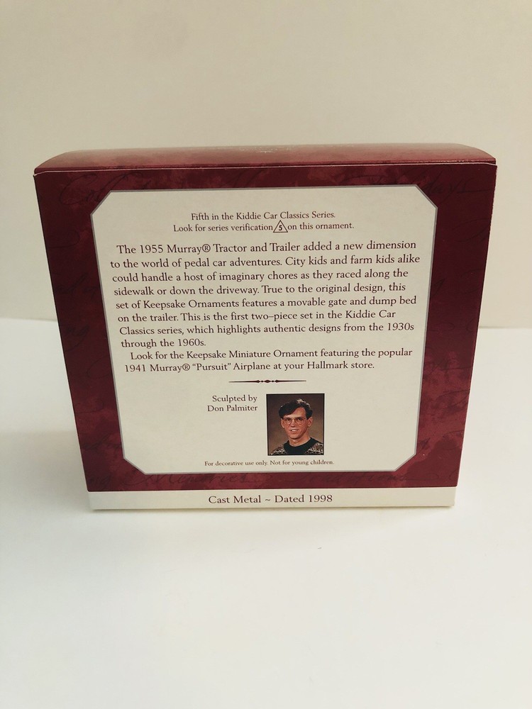 The Hallmark 1955 Murray Tractor and Trailer Kiddie Car Classics Christmas Ornament is a vintage collectible featuring a classic design from 1955. This medium-sized ornament is a part of the Kiddie Car Classics collection by Hallmark, showcasing a red tractor with a trailer. Perfect for holiday decorating, this hanging ornament adds a nostalgic touch to any Christmas tree. Its original design and vintage appeal make it a charming addition to any festive display. ** new in box, sold as is**
