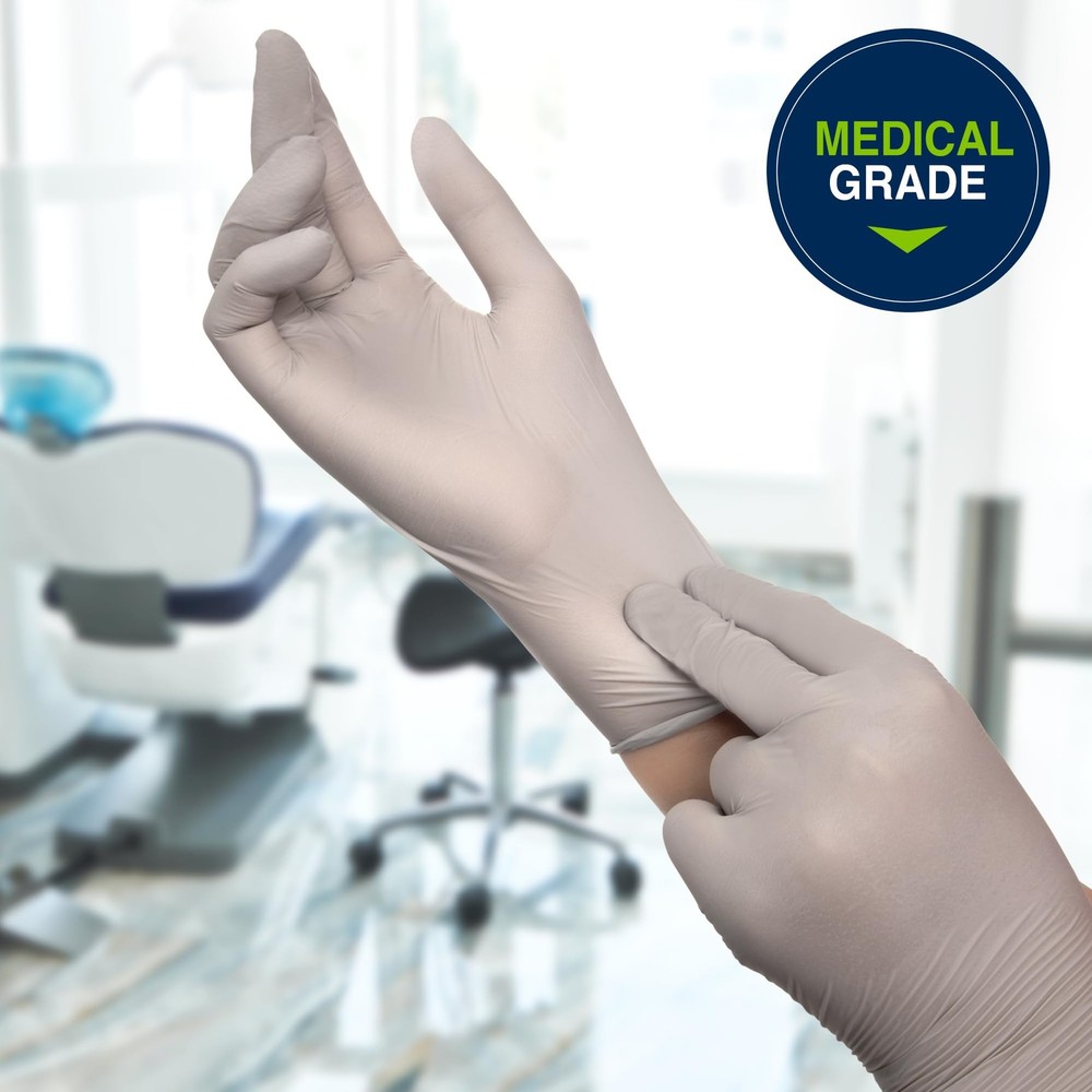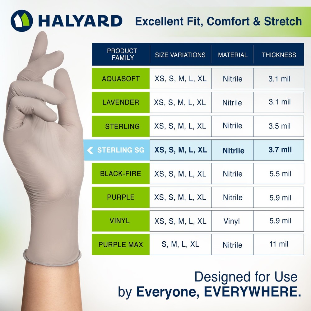 Performance in a Latex-Free Exam Glove Latex allergy is a concern within the healthcare industry. With this exam glove, * has created a latex-free glove with the protection, comfort, and sensitivity of latex, at a comparable value. The Protection of Nitrile *'s manufacturing process boosts the tensile strength of nitrile—the force required to break through the glove—to increase its already superior barrier protection qualities. The Tactile Sensitivity of Latex The process also allows a reduction in glove thickness, which means that less force is required to stretch the material. That provides a latex-free glove with the dexterity and tactile sensitivity of natural rubber latex. Save Space and Waste Less Standard length STERLING* Nitrile Exam Gloves come in space-saving 200-count dispenser boxes. That means up to a 50% saving in the storage space you’d usually devote to gloves. It also means fewer runouts and replacements in use, which can help increase convenience and compliance. It also means there are fewer boxes to discard, which means less waste for your facility.