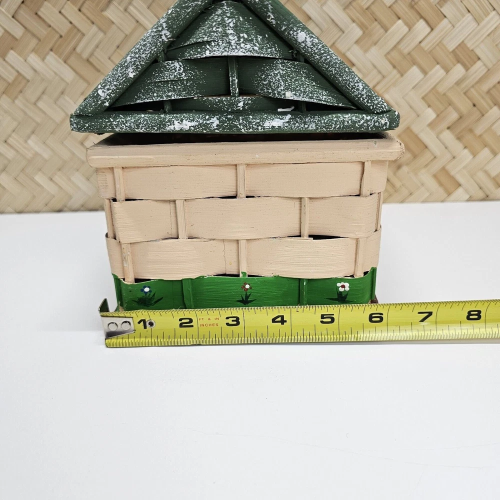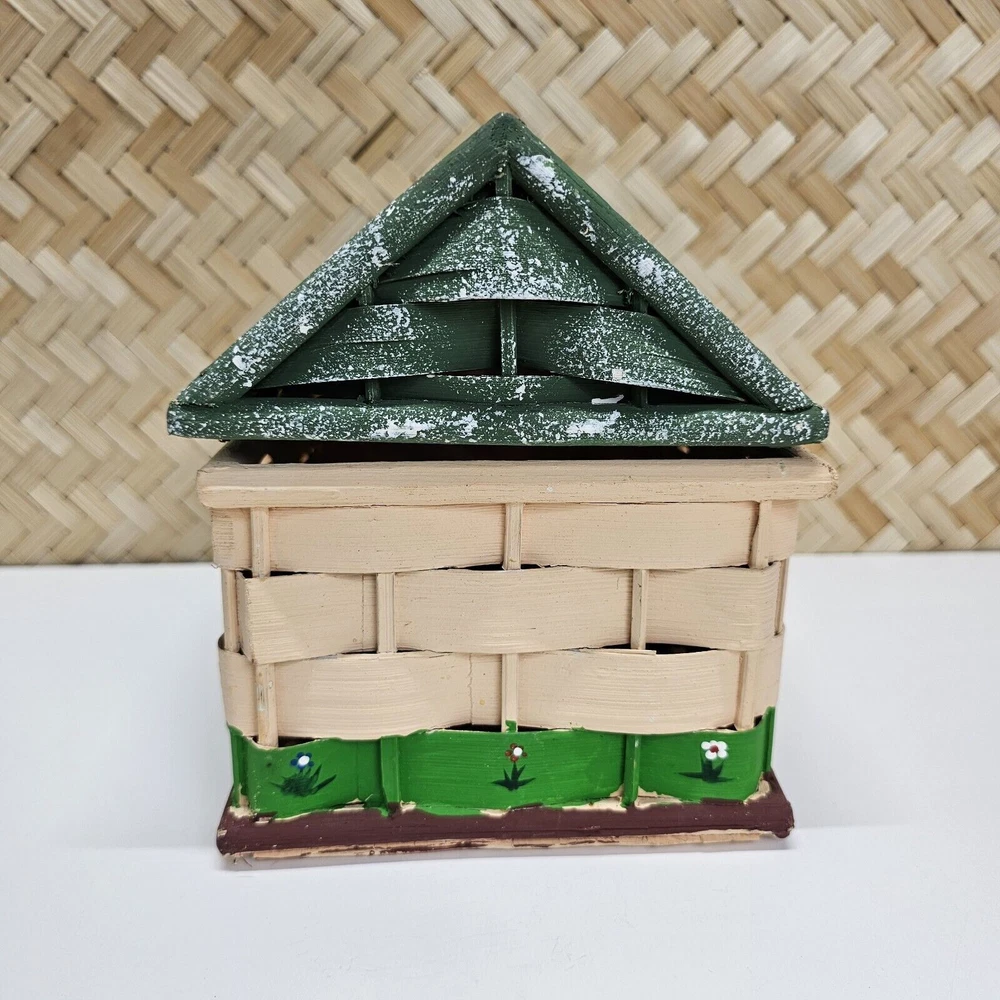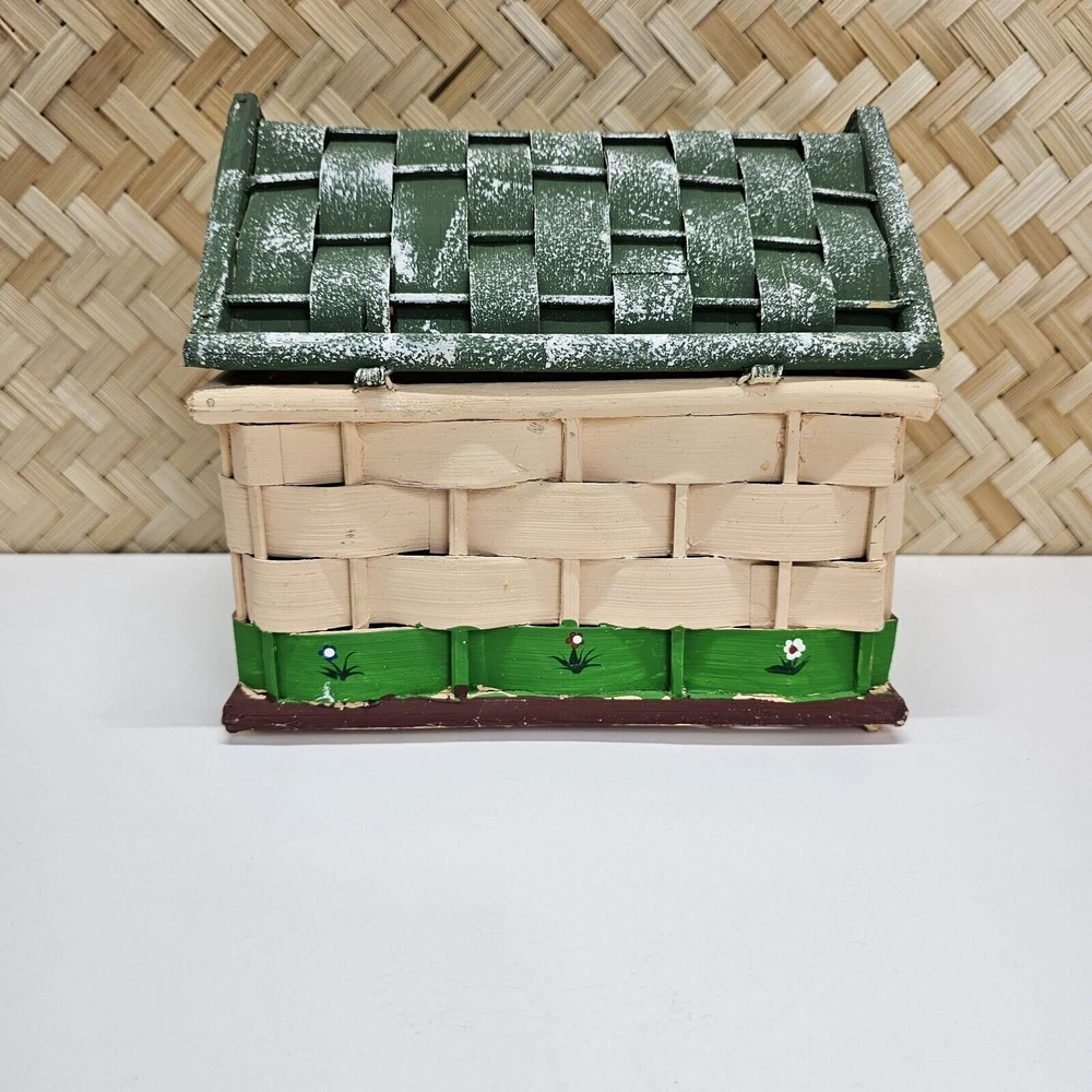 HAND PAINTED Vintage Weave Wicker Box House Shaped Hinged 6" X 8" X 7.25"H